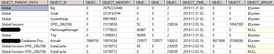 SELECT * INTO #ObjectMemoryUsage FROM OPENQUERY(<OLAPLINK>, 'SELECT * FROM $SYSTEM.DISCOVER_OBJECT_MEMORY_USAGE ORDER BY OBJECT_MEMORY_NONSHRINKABLE DESC')