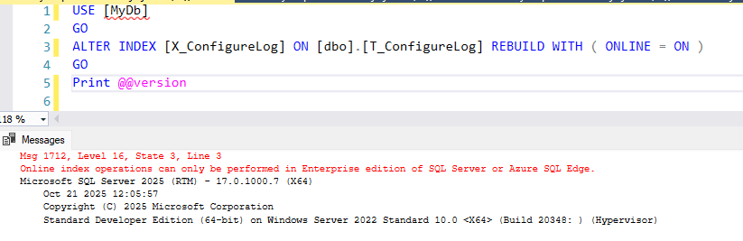 Here I am trying to use an Enterprise Edition feature (online index rebuild), and it does not work: (ref: "Editions and supported features of SQL Server 2025" )