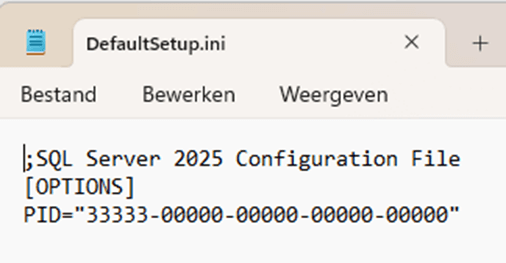 After I mounted the downloaded Standard Developer Edition ISO, I've found the DefaultSetup.ini file in its x64 folder. For the regular SQL Server (Enterprise) Developer Edition, I know the content of that file is only its product key ( PID="22222-00000-00000-00000-00000" ).
