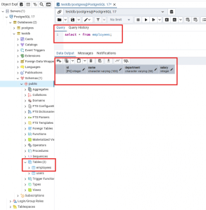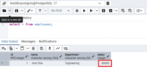 Check from pgAdmin and you should see now the table has a record inserted: