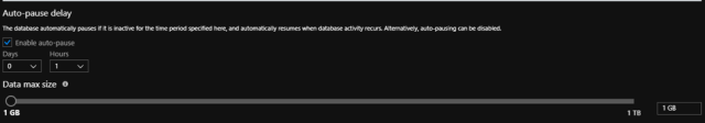 Next we can adjust the Auto-pause delay values. This is a valuable feature which allows you to automatically pause the database after a period of inactivity. You can set this delay up to 7 days and 23 hours which provides quite a bit of flexibility. Pausing the database will help save costs as when the database is paused you are only charge the cost of the storage and not the compute.