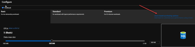 On the next screen, we will need to make some decisions on how you want the database configured in this new compute tier. If the database is currently in the DTU price offering, you will need to move to the vCore-base pricing since that is the only pricing tier available.