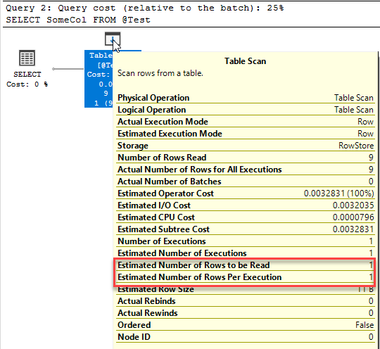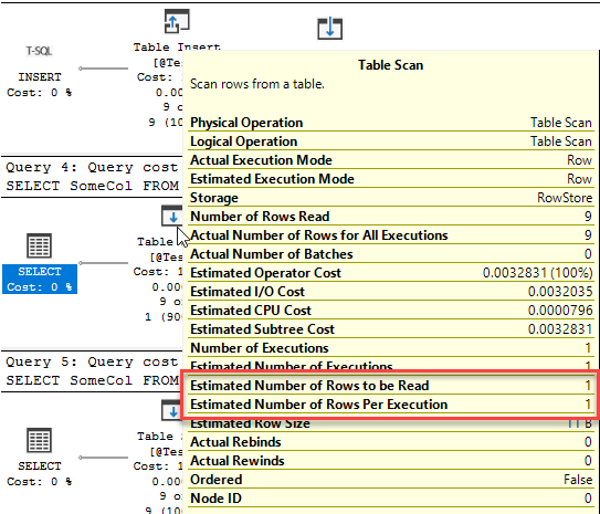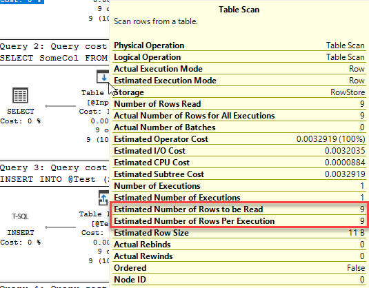 CREATE OR ALTER PROCEDURE TestRowEstimations @Input TestTableType READONLY AS SELECT SomeCol FROM @Input; DECLARE @Test TABLE (SomeCol INT); INSERT INTO @Test (SomeCol) VALUES (1),(22),(37),(45),(55),(67),(72),(86),(91); SELECT SomeCol FROM @Test; SELECT SomeCol FROM @Test OPTION (RECOMPILE); GO
