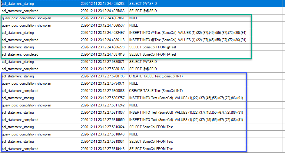 It has to do with when the plans are generated. The XE event results are from an event tracking statement start and end and the post-compilation event for the plan. For the query using the table variable, the entire batch is compiled before the execution starts. For the permanent table, there are multiple compilation events.