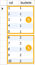 In case the total of rows is divisible by buckets, the rows are divided evenly among groups.