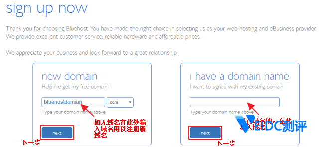 3.在跳转的域名注册页面上,如果您已有域名,则在右边空格处输入您的域名并选择下一步“next”;若没有,则在左边空格处填写域名信息,用以注册新的域名(Bluehost最优Linux虚拟主机套餐中提供一个免费域名注册),然后选择下一步“next”。注意:在注册新域名时,如果域名不可用,Bluehost会提供该域名的其他可选项或者客户可以返回重新填写域名绑定信息。