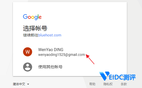 选择可用的Google账户绑定Bluehost账户,并按提示10秒即可完成账户创建并返回注册购买结账页面。