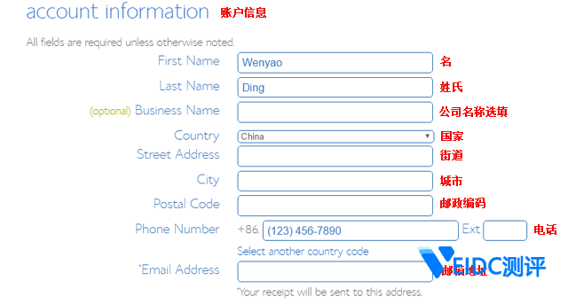 5.在注册页面下翻,会显示填写Bluehost账户信息表,包括姓氏、名称、所在地址(国家>街道>城市)、邮政编码、电话号码以及邮箱地址(用以接收Bluehost发送的客户收据):