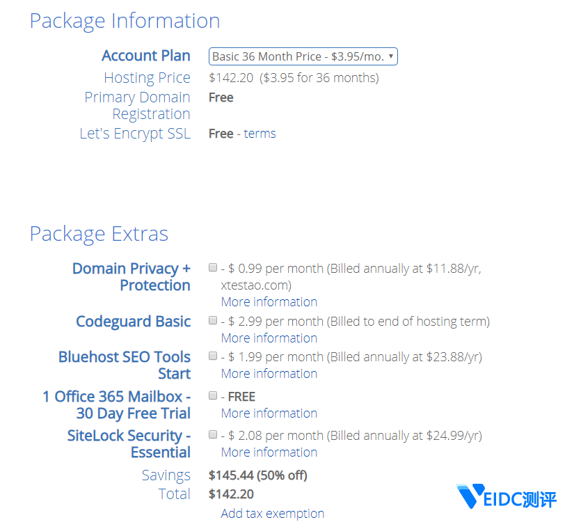 6.在该页面再下翻,是确认方案套餐信息表,包括套餐购买期限和选择附加服务。需要获得立减50%的优惠价格,客户应该选择“Basic 36 Month Price – $3.95/mo”,即Linux虚拟主机Basic套餐购买36个月,3.95美元/月。