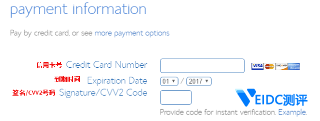 7.确认套餐和获得立减50%的价格后,客户可在页面下方看到付款信息填写表(Bluehost支持VISA、MasterCard、Discover和American Express信用卡付款)。