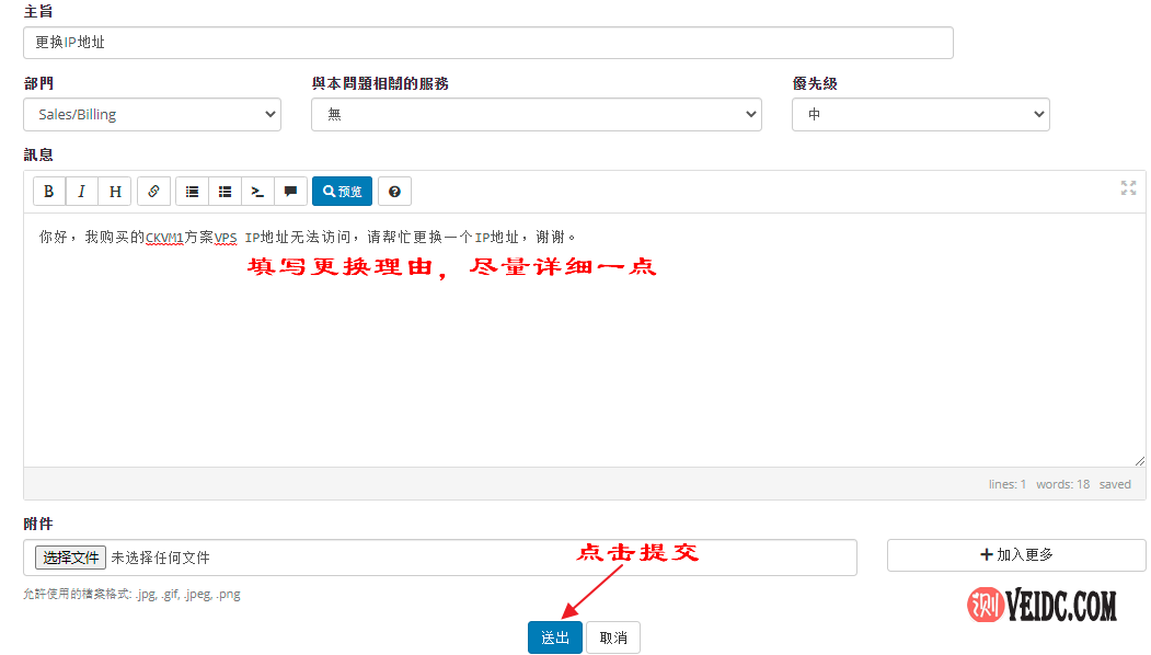 最后,提交Ticket联系客服更换IP地址的方法也很简单,直接打开HostDare服务单申请页面,然后提交申请即可: