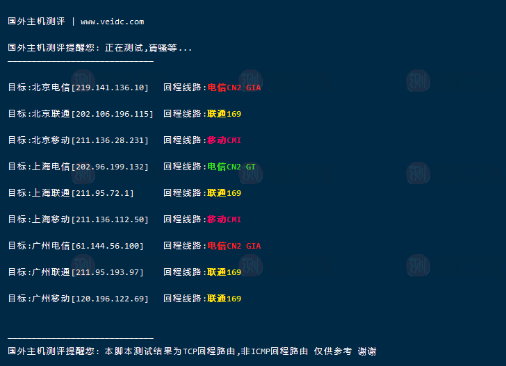 [Info] 测试路由 到 上海电信(天翼云) 中 ... traceroute to 101.227.255.45 (101.227.255.45), 30 hops max, 32 byte packets 1 10.2.46.1 0.17 ms * 局域网 2 96.44.178.209.static.quadranet.com (96.44.178.209) 0.39 ms AS8100 美国, 加利福尼亚州, 洛杉矶, quadranet.com 3 96.44.175.32.static.quadranet.com (96.44.175.32) 0.62 ms AS8100 美国, 加利福尼亚州, 洛杉矶, quadranet.com 4 218.30.48.145 13.11 ms AS4134 美国, 加利福尼亚州, 洛杉矶, chinatelecom.com.cn, 电信 5 59.43.189.33 128.02 ms * 中国, 上海, chinatelecom.com.cn, 电信 6 * 7 202.97.51.242 139.33 ms AS4134 中国, 上海, chinatelecom.com.cn, 电信 8 202.97.50.169 150.21 ms AS4134 中国, 上海, chinatelecom.com.cn, 电信 9 * 10 124.74.166.138 132.75 ms AS4812 中国, 上海, chinatelecom.com.cn, 电信 11 * 12 * 13 * 14 * 15 * 16 * 17 * 18 * 19 * 20 * 21 * 22 * 23 * 24 * 25 * 26 * 27 * 28 * 29 * 30 * [Info] 测试路由 到 上海电信(天翼云) 完成 ! [Info] 测试路由 到 厦门电信CN2 中 ... traceroute to 117.28.254.129 (117.28.254.129), 30 hops max, 32 byte packets 1 10.2.46.1 0.29 ms * 局域网 2 96.44.178.209.static.quadranet.com (96.44.178.209) 29.69 ms AS8100 美国, 加利福尼亚州, 洛杉矶, quadranet.com 3 96.44.175.32.static.quadranet.com (96.44.175.32) 0.51 ms AS8100 美国, 加利福尼亚州, 洛杉矶, quadranet.com 4 218.30.48.145 0.76 ms AS4134 美国, 加利福尼亚州, 洛杉矶, chinatelecom.com.cn, 电信 5 59.43.189.33 129.83 ms * 中国, 上海, chinatelecom.com.cn, 电信 6 59.43.246.213 128.48 ms * 中国, 上海, chinatelecom.com.cn, 电信 7 59.43.138.53 130.98 ms * 中国, 上海, chinatelecom.com.cn, 电信 8 59.43.138.186 152.15 ms * 中国, 福建, chinatelecom.com.cn, 电信 9 * 10 27.148.195.2 151.29 ms AS133775 中国, 福建, 厦门, chinatelecom.com.cn, 电信 11 117.25.141.110 147.34 ms AS133775 中国, 福建, 厦门, chinatelecom.com.cn, 电信 12 117.28.254.129 163.85 ms AS4809 中国, 福建, 厦门, chinatelecom.com.cn, 电信 [Info] 测试路由 到 厦门电信CN2 完成 ! [Info] 测试路由 到 浙江杭州联通 中 ... traceroute to 101.71.241.238 (101.71.241.238), 30 hops max, 32 byte packets 1 10.2.46.1 0.25 ms * 局域网 2 96.44.178.209.static.quadranet.com (96.44.178.209) 0.62 ms AS8100 美国, 加利福尼亚州, 洛杉矶, quadranet.com 3 96.44.175.32.static.quadranet.com (96.44.175.32) 0.52 ms AS8100 美国, 加利福尼亚州, 洛杉矶, quadranet.com 4 96.44.163.152.static.quadranet.com (96.44.163.152) 0.60 ms AS8100 美国, 加利福尼亚州, 洛杉矶, quadranet.com 5 china.unicom (204.152.204.2) 0.89 ms AS8100 美国, 加利福尼亚州, 洛杉矶, quadranet.com 6 207.254.191.89 8.00 ms AS19174 美国, 加利福尼亚州, 洛杉矶, chinaunicom.com, 联通 7 219.158.16.97 143.87 ms AS4837 中国, 北京, chinaunicom.com, 联通 8 219.158.5.198 169.03 ms AS4837 中国, 上海, chinaunicom.com, 联通 9 219.158.113.134 174.54 ms AS4837 中国, 上海, chinaunicom.com, 联通 10 219.158.113.105 167.19 ms AS4837 中国, 上海, chinaunicom.com, 联通 11 219.158.115.146 171.73 ms AS4837 中国, 浙江, 杭州, chinaunicom.com, 联通 12 101.71.244.94 174.56 ms AS4837 中国, 浙江, 杭州, chinaunicom.com, 联通 13 * 14 * 15 * 16 * 17 * 18 * 19 * 20 * 21 * 22 * 23 * 24 * 25 * 26 * 27 * 28 * 29 * 30 * [Info] 测试路由 到 浙江杭州联通 完成 ! [Info] 测试路由 到 浙江杭州移动 中 ... traceroute to 112.17.0.106 (112.17.0.106), 30 hops max, 32 byte packets 1 10.2.46.1 0.23 ms * 局域网 2 96.44.178.209.static.quadranet.com (96.44.178.209) 0.40 ms AS8100 美国, 加利福尼亚州, 洛杉矶, quadranet.com 3 96.44.175.32.static.quadranet.com (96.44.175.32) 3.22 ms AS8100 美国, 加利福尼亚州, 洛杉矶, quadranet.com 4 96.44.163.152.static.quadranet.com (96.44.163.152) 7.02 ms AS8100 美国, 加利福尼亚州, 洛杉矶, quadranet.com 5 223.119.64.245 1.01 ms AS58453 美国, 加利福尼亚州, 洛杉矶, chinamobile.com, 移动 6 223.120.6.17 0.75 ms AS58453 美国, 加利福尼亚州, 洛杉矶, chinamobile.com, 移动 7 223.120.13.46 180.30 ms AS58453 中国, 上海, chinamobile.com, 移动 8 221.183.55.34 182.85 ms AS9808 中国, 上海, chinamobile.com, 移动 9 221.183.25.193 182.87 ms AS9808 中国, 上海, chinamobile.com, 移动 10 221.183.23.25 177.78 ms AS9808 中国, 上海, chinamobile.com, 移动 11 111.24.3.89 177.32 ms AS9808 中国, 上海, chinamobile.com, 移动 12 111.24.3.30 193.82 ms AS9808 中国, 浙江, 杭州, chinamobile.com, 移动 13 * 14 * 15 218.205.87.13 195.69 ms AS56041 中国, 浙江, 杭州, chinamobile.com, 移动 16 * 17 * 18 * 19 * 20 * 21 * 22 * 23 * 24 * 25 * 26 * 27 * 28 * 29 * 30 * [Info] 测试路由 到 浙江杭州移动 完成 ! [Info] 测试路由 到 北京教育网 中 ... traceroute to 202.205.6.30 (202.205.6.30), 30 hops max, 32 byte packets 1 10.2.46.1 0.40 ms * 局域网 2 96.44.178.209.static.quadranet.com (96.44.178.209) 1.80 ms AS8100 美国, 加利福尼亚州, 洛杉矶, quadranet.com 3 96.44.175.34.static.quadranet.com (96.44.175.34) 0.48 ms AS8100 美国, 加利福尼亚州, 洛杉矶, quadranet.com 4 china.unicom (204.152.204.2) 0.81 ms AS8100 美国, 加利福尼亚州, 洛杉矶, quadranet.com 5 207.254.191.121 3.75 ms AS19174 美国, 加利福尼亚州, 洛杉矶, chinaunicom.com, 联通 6 219.158.96.25 144.97 ms AS4837 中国, 北京, chinaunicom.com, 联通 7 219.158.3.145 148.26 ms AS4837 中国, 北京, chinaunicom.com, 联通 8 * 9 * 10 219.158.113.170 175.26 ms AS4837 中国, 上海, chinaunicom.com, 联通 11 211.102.30.15 153.33 ms * 中国, 上海, 电信/教育网/联通 12 101.4.118.114 166.81 ms AS4538 中国, 上海, edu.cn, 教育网 13 101.4.117.30 168.61 ms AS4538 中国, 北京, edu.cn, 教育网 14 101.4.116.118 172.70 ms AS4538 中国, 北京, edu.cn, 教育网 15 101.4.112.69 175.42 ms AS4538 中国, 北京, edu.cn, 教育网 16 101.4.113.110 173.52 ms AS4538 中国, 北京, edu.cn, 教育网 17 219.224.10