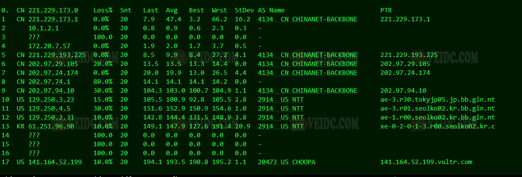 [Info] 测试路由 到 上海电信(天翼云) 中 ... traceroute to 101.227.255.45 (101.227.255.45), 30 hops max, 32 byte packets 1 * 2 * 3 * 4 * 5 TE-0-0-0-24.br03.seo03.pccwbtn.net (63.218.237.133) 1.72 ms AS3491,AS31713 韩国, 首尔, pccw.com 6 * 7 218.30.53.84 137.46 ms AS4134 美国, 加利福尼亚州, 圣何塞, chinatelecom.com.cn, 电信 8 202.97.50.57 136.18 ms AS4134 美国, 加利福尼亚州, 圣何塞, chinatelecom.com.cn, 电信 9 202.97.51.1 156.69 ms AS4134 中国, 上海, chinatelecom.com.cn, 电信 10 * 11 * 12 101.95.88.101 166.63 ms AS4812 中国, 上海, chinatelecom.com.cn, 电信 13 * 14 * 15 * 16 * 17 * 18 * 19 * 20 * 21 * 22 * 23 * 24 * 25 * 26 * 27 * 28 * 29 * 30 * [Info] 测试路由 到 上海电信(天翼云) 完成 ! [Info] 测试路由 到 厦门电信CN2 中 ... traceroute to 117.28.254.129 (117.28.254.129), 30 hops max, 32 byte packets 1 * 2 * 3 * 4 * 5 * 6 121.78.68.41 1.29 ms AS9286 韩国, 首尔, kinx.net 7 203.246.169.142 2.20 ms AS9286 韩国, 首尔, kinx.net 8 222.239.9.177 4.43 ms AS9318 韩国, 首尔, skbroadband.com 9 * 10 * 11 58.229.15.97 38.47 ms AS9318 中国, 香港, skbroadband.com 12 1.254.241.33 59.43 ms AS9318 中国, 香港, skbroadband.com 13 59.43.187.177 86.48 ms * 中国, 香港, chinatelecom.com.cn, 电信 14 * 15 59.43.130.149 65.71 ms * 中国, 广东, 广州, chinatelecom.com.cn, 电信 16 59.43.46.214 80.26 ms * 中国, 福建, chinatelecom.com.cn, 电信 17 110.80.128.90 72.22 ms AS133775 中国, 福建, 厦门, chinatelecom.com.cn, 电信 18 * 19 117.25.141.106 75.07 ms AS133775 中国, 福建, 厦门, chinatelecom.com.cn, 电信 20 117.28.254.129 84.50 ms AS4809 中国, 福建, 厦门, chinatelecom.com.cn, 电信 [Info] 测试路由 到 厦门电信CN2 完成 ! [Info] 测试路由 到 浙江杭州联通 中 ... traceroute to 101.71.241.238 (101.71.241.238), 30 hops max, 32 byte packets 1 * 2 * 3 * 4 * 5 * 6 xe-0-2-0-1-3.r00.seolko02.kr.bb.gin.ntt.net (61.251.96.89) 1.68 ms AS2914 韩国, 首尔, ntt.com 7 ae-6.r27.osakjp02.jp.bb.gin.ntt.net (129.250.5.73) 36.84 ms AS2914 日本, 大阪府, 大阪, ntt.com 8 ae-2.r02.osakjp02.jp.bb.gin.ntt.net (129.250.2.128) 33.31 ms AS2914 日本, 大阪府, 大阪, ntt.com 9 219.158.39.197 77.92 ms AS4837 中国, 上海, chinaunicom.com, 联通 10 219.158.6.205 70.64 ms AS4837 中国, 上海, chinaunicom.com, 联通 11 219.158.7.129 77.86 ms AS4837 中国, 上海, chinaunicom.com, 联通 12 219.158.106.94 82.59 ms AS4837 中国, 浙江, 杭州, chinaunicom.com, 联通 13 101.71.244.94 84.91 ms AS4837 中国, 浙江, 杭州, chinaunicom.com, 联通 14 * 15 * 16 * 17 * 18 * 19 * 20 * 21 * 22 * 23 * 24 * 25 * 26 * 27 * 28 * 29 * 30 * [Info] 测试路由 到 浙江杭州联通 完成 ! [Info] 测试路由 到 浙江杭州移动 中 ... traceroute to 112.17.0.106 (112.17.0.106), 30 hops max, 32 byte packets 1 * 2 * 3 * 4 * 5 * 6 xe-0-2-0-1-3.r00.seolko02.kr.bb.gin.ntt.net (61.251.96.89) 1.76 ms AS2914 韩国, 首尔, ntt.com 7 ae-1.r01.seolko02.kr.bb.gin.ntt.net (129.250.2.30) 1.69 ms AS2914 韩国, 首尔, ntt.com 8 ae-17.r30.tokyjp05.jp.bb.gin.ntt.net (129.250.4.4) 31.93 ms AS2914 日本, 东京都, 东京, ntt.com 9 * 10 ae-0.a02.tkokhk01.hk.bb.gin.ntt.net (129.250.5.33) 81.92 ms AS2914 中国, 香港, ntt.com 11 * 12 * 13 * 14 * 15 * 16 * 17 * 18 * 19 * 20 * 21 * 22 * 23 * 24 * 25 * 26 * 27 * 28 * 29 * 30 * [Info] 测试路由 到 浙江杭州移动 完成 ! [Info] 测试路由 到 北京教育网 中 ... traceroute to 202.205.6.30 (202.205.6.30), 30 hops max, 32 byte packets 1 * 2 * 3 * 4 * 5 * 6 xe-0-2-0-1-3.r00.seolko02.kr.bb.gin.ntt.net (61.251.96.89) 1.66 ms AS2914 韩国, 首尔, ntt.com 7 ae-1.r01.seolko02.kr.bb.gin.ntt.net (129.250.2.30) 1.78 ms AS2914 韩国, 首尔, ntt.com 8 ae-17.r30.tokyjp05.jp.bb.gin.ntt.net (129.250.4.4) 31.42 ms AS2914 日本, 东京都, 东京, ntt.com 9 ae-2.r26.tkokhk01.hk.bb.gin.ntt.net (129.250.2.51) 80.36 ms AS2914 中国, 香港, ntt.com 10 ae-2.a01.chwahk02.hk.bb.gin.ntt.net (129.250.6.123) 78.06 ms AS2914 中国, 香港, ntt.com 11 203.131.254.214 81.11 ms AS2914 中国, 香港, ntt.com 12 * 13 * 14 * 15 * 16 101.4.113.110 114.04 ms AS4538 中国, 北京, edu.cn, 教育网 17 219.224.102.230 112.27 ms AS4538 中国, 北京, edu.cn, 教育网 18 * 19 * 20 * 21 * 22 * 23 * 24 101.4.130.54 113.20 ms AS133111 中国, 北京, edu.cn, 教育网 25 * 26 * 27 * 28 * 29 * 30 * [Info] 测试路由 到 北京教育网 完成 ! [Info] 四网路由快速测试 已完成 !