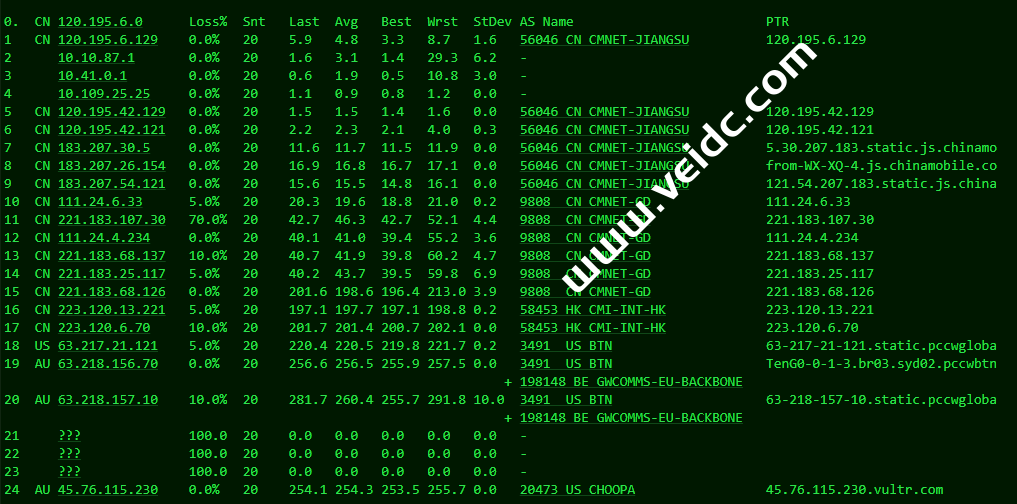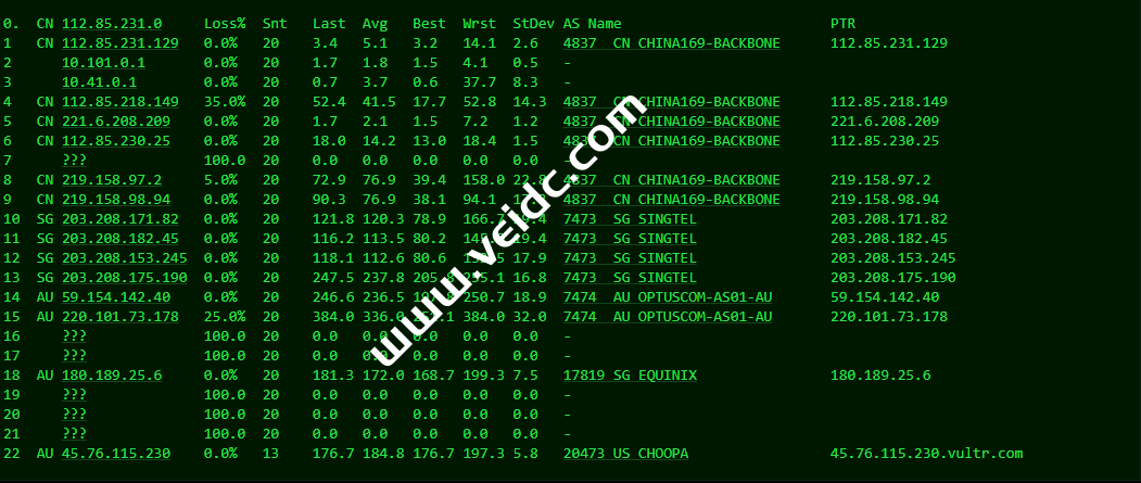 [Info] 测试路由 到 上海电信(天翼云) 中 ... traceroute to 101.227.255.45 (101.227.255.45), 30 hops max, 32 byte packets 1 * 2 * 3 * 4 * 5 63-216-147-141.static.pccwglobal.net (63.216.147.141) 92.38 ms AS3491,AS31713,AS198148 新加坡, pccw.com 6 TenGE0-2-0-0.br04.sjo01.pccwbtn.net (63.218.178.50) 228.62 ms AS3491,AS31713 美国, 加利福尼亚州, 圣何塞, pccw.com 7 218.30.53.84 282.91 ms AS4134 美国, 加利福尼亚州, 圣何塞, chinatelecom.com.cn, 电信 8 202.97.86.186 283.00 ms AS4134 美国, 加利福尼亚州, 圣何塞, chinatelecom.com.cn, 电信 9 202.97.71.197 280.36 ms * 中国, 上海, chinatelecom.com.cn, 电信 10 202.97.51.162 280.45 ms AS4134 中国, 上海, chinatelecom.com.cn, 电信 11 * 12 101.95.88.93 302.38 ms AS4812 中国, 上海, chinatelecom.com.cn, 电信 13 * 14 * 15 * 16 * 17 * 18 * 19 * 20 * 21 * 22 * 23 * 24 * 25 * 26 * 27 * 28 * 29 * 30 * [Info] 测试路由 到 上海电信(天翼云) 完成 ! [Info] 测试路由 到 厦门电信CN2 中 ... traceroute to 117.28.254.129 (117.28.254.129), 30 hops max, 32 byte packets 1 * 2 * 3 * 4 * 5 63-218-157-9.static.pccwglobal.net (63.218.157.9) 0.90 ms AS3491,AS31713,AS198148 澳大利亚, 新南威尔士州, 悉尼, pccw.com 6 TenGE0-1-0-5.br03.hkg15.pccwbtn.net (63.218.210.138) 122.89 ms AS3491,AS31713 中国, 香港, pccw.com 7 TenGE0-1-0-5.br03.hkg15.pccwbtn.net (63.218.210.138) 121.14 ms AS3491,AS31713 中国, 香港, pccw.com 8 63-218-211-10.static.pccwglobal.net (63.218.211.10) 152.41 ms AS3491,AS31713 中国, 香港, pccw.com 9 59.43.183.105 128.92 ms * 中国, 广东, 广州, chinatelecom.com.cn, 电信 10 * 11 59.43.130.145 129.49 ms * 中国, 广东, 广州, chinatelecom.com.cn, 电信 12 59.43.46.214 141.50 ms * 中国, 福建, chinatelecom.com.cn, 电信 13 * 14 27.159.81.214 160.19 ms AS133775 中国, 福建, 厦门, chinatelecom.com.cn, 电信 15 117.25.141.106 147.86 ms AS133775 中国, 福建, 厦门, chinatelecom.com.cn, 电信 16 117.28.254.129 145.42 ms AS4809 中国, 福建, 厦门, chinatelecom.com.cn, 电信 [Info] 测试路由 到 厦门电信CN2 完成 ! [Info] 测试路由 到 浙江杭州联通 中 ... traceroute to 101.71.241.238 (101.71.241.238), 30 hops max, 32 byte packets 1 * 2 * 3 * 4 * 5 xe-1-1-10.r20.sydnau02.au.bb.gin.ntt.net (202.68.65.5) 0.45 ms AS2914 澳大利亚, 新南威尔士州, 悉尼, nttict.com 6 ae-7.r26.osakjp02.jp.bb.gin.ntt.net (129.250.4.64) 119.03 ms AS2914 日本, 大阪府, 大阪, ntt.com 7 ae-1.r02.osakjp02.jp.bb.gin.ntt.net (129.250.2.40) 119.93 ms AS2914 日本, 大阪府, 大阪, ntt.com 8 xe-2.cnc-g.osakjp02.jp.bb.gin.ntt.net (129.250.66.86) 160.80 ms AS2914 日本, 大阪府, 大阪, ntt.com 9 219.158.113.126 155.44 ms AS4837 中国, 上海, chinaunicom.com, 联通 10 219.158.113.105 158.62 ms AS4837 中国, 上海, chinaunicom.com, 联通 11 219.158.115.146 162.70 ms AS4837 中国, 浙江, 杭州, chinaunicom.com, 联通 12 101.71.244.94 162.95 ms AS4837 中国, 浙江, 杭州, chinaunicom.com, 联通 13 * 14 * 15 * 16 * 17 * 18 * 19 * 20 * 21 * 22 * 23 * 24 * 25 * 26 * 27 * 28 * 29 * 30 * [Info] 测试路由 到 浙江杭州联通 完成 ! [Info] 测试路由 到 浙江杭州移动 中 ... traceroute to 112.17.0.106 (112.17.0.106), 30 hops max, 32 byte packets 1 * 2 * 3 * 4 * 5 xe-1-1-10.r20.sydnau02.au.bb.gin.ntt.net (202.68.65.5) 40.11 ms AS2914 澳大利亚, 新南威尔士州, 悉尼, nttict.com 6 ae-1.r21.sydnau03.au.bb.gin.ntt.net (129.250.5.44) 23.59 ms AS2914 澳大利亚, 新南威尔士州, 悉尼, ntt.com 7 ae-8.r22.sngpsi07.sg.bb.gin.ntt.net (129.250.6.144) 93.05 ms AS2914 新加坡, ntt.com 8 ae-10.r27.tkokhk01.hk.bb.gin.ntt.net (129.250.7.67) 129.78 ms AS2914 中国, 香港, ntt.com 9 ae-1.a02.tkokhk01.hk.bb.gin.ntt.net (129.250.5.39) 137.07 ms AS2914 中国, 香港, ntt.com 10 * 11 * 12 223.120.2.6 223.89 ms AS58453 中国, 广东, 广州, chinamobile.com, 移动 13 223.120.22.5 242.35 ms AS58453 中国, 广东, 广州, chinamobile.com, 移动 14 * 15 * 16 * 17 * 18 * 19 * 20 * 21 * 22 * 23 * 24 * 25 * 26 * 27 * 28 * 29 * 30 * [Info] 测试路由 到 浙江杭州移动 完成 ! [Info] 测试路由 到 北京教育网 中 ... traceroute to 202.205.6.30 (202.205.6.30), 30 hops max, 32 byte packets 1 * 2 * 3 * 4 * 5 180.189.25.5 0.41 ms AS17819 澳大利亚, 新南威尔士州, 悉尼, equinix.com 6 119.27.49.107 0.44 ms * 澳大利亚, 新南威尔士州, 悉尼, equinix.com 7 119.27.49.222 1.25 ms * 澳大利亚, 新南威尔士州, 悉尼, equinix.com 8 bundle-ether12.bdr01-ipt-639garde-syd.au.superloop.net.co (27.122.122.136) 0.83 ms AS38195 澳大利亚, 新南威尔士州, 悉尼, superloop.com 9 * 10 * 11 cernetedu1-lacp-10g.hkix.net (123.255.91.118) 120.74 ms * 中国, 香港, hkix.net 12 101.4.114.181 152.72 ms AS4538 中国, 北京, edu.cn, 教育网 13 * 14 * 15 101.4.118.213 155.79 ms AS4538 中国, 北京, edu.cn, 教育网 16 101.4.113.110 162.99 ms AS4538 中国, 北京, edu.cn, 教育网 17 219.224.102.230 164.05 ms AS4538 中国, 北京, edu.cn, 教育网 18 * 19 101.4.130.53 191.13 ms AS133111 中国, 北京, edu.cn, 教育网 20 * 21 101.4.130.53 166.67 ms AS133111 中国, 北京, edu.cn, 教育网 22 * 23 * 24 * 25 * 26 * 27 * 28 * 29 * 30 101.4.130.54 169.50 ms AS133111 中国, 北京, edu.cn, 教育网 [Info] 测试路由 到 北京教育网 完成 ! [Info] 四网路由快速测试 已完成 !