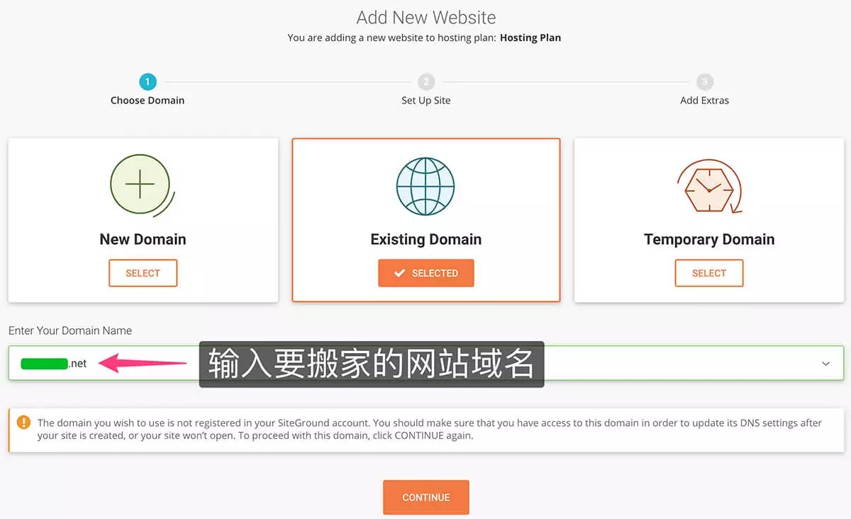 进入到站点新建流程中之后,首先第一步还是要我们选择站点的域名,因为我们是把Wordpress网站搬家到SiteGround上,因此这里选择 Existing Domain 并且在下方的 Enter Your Domain Name 文本框中输入你要搬家的网站的域名。例如你要把网站 WaimaoB2C.com 从阿里云搬家到SiteGround,那么在SiteGround后台这里就输入WaimaoB2C.com 然后点击Continue,会有两行英文文字提示你域名需要解析,不用管,我们后面会操作,再次点击Continue按钮即可。