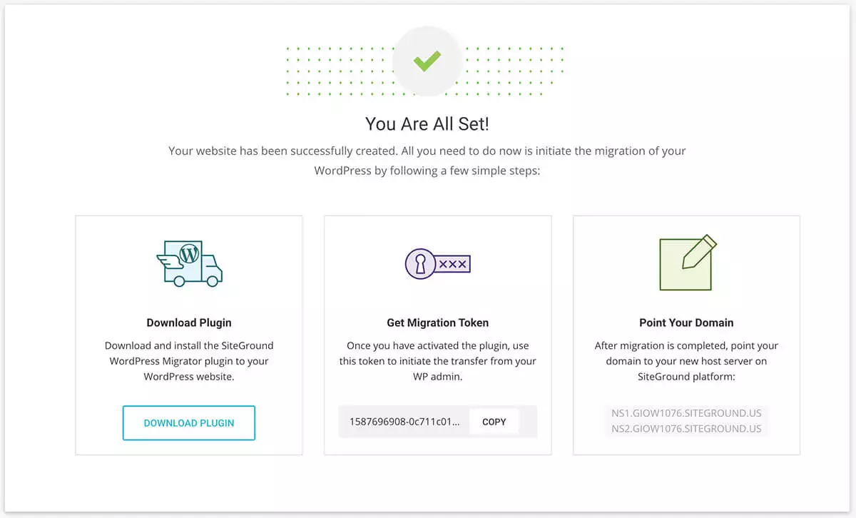 然后回到SiteGround后台页面,将Migration Token密钥复制下来。