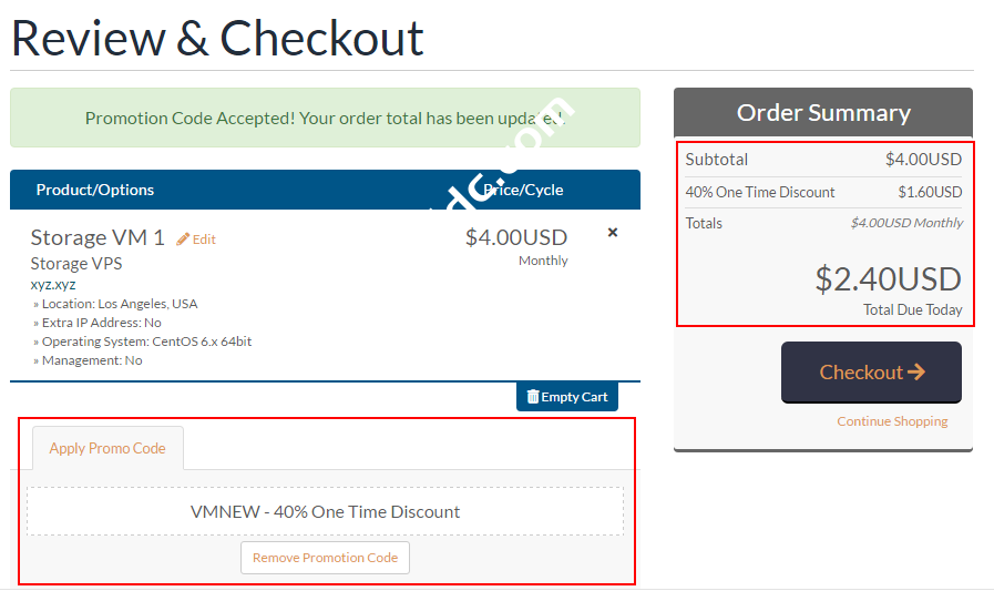 我们看到常规最便宜的就是4美元,1核512M内存30G硬盘5T月流量的(1G带宽的是5T,10G带宽不限流量,但是每月最多还是不能超过20T),我们可以使用优惠码(VMNEW),如果你是新用户那么首月首次下单可以打6折,省掉40%只要2.4美元。同样你也可以使用另一个优惠码打8折,省掉20%只要3.2美元。