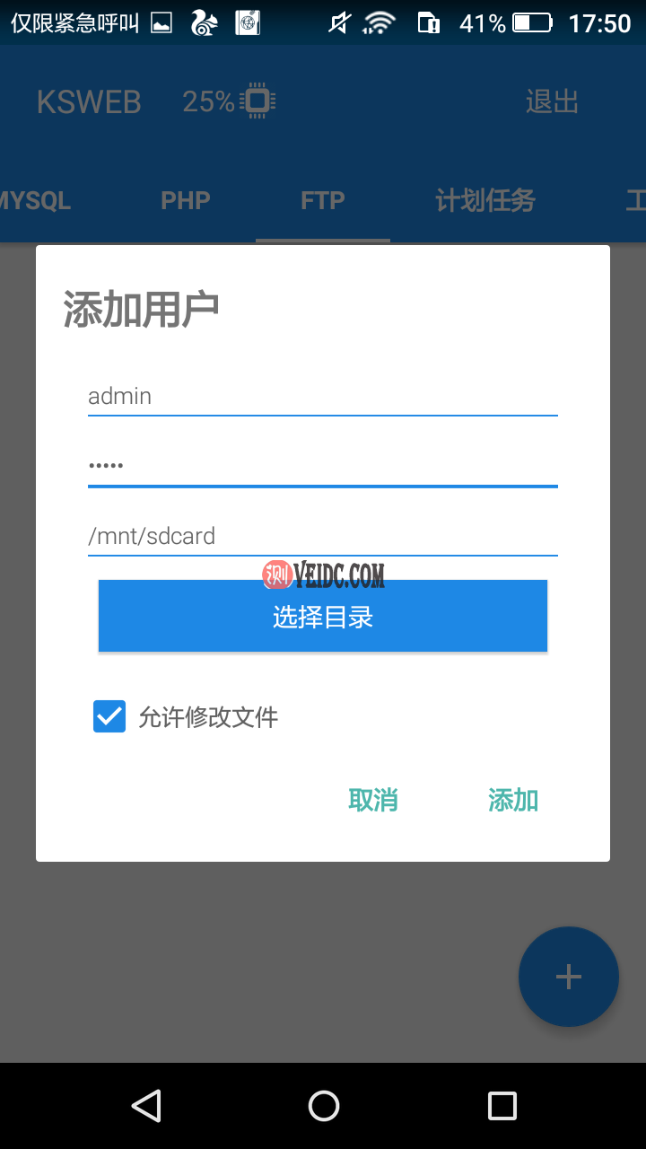 搭建成功后,在FTP栏打开服务,并添加用户,设置好用户名密码,勾选“允许修改文件”,用于通过局域网传输文件到手机服务器。(此步骤可不进行,后续传输文件可使用数据线直接传导)