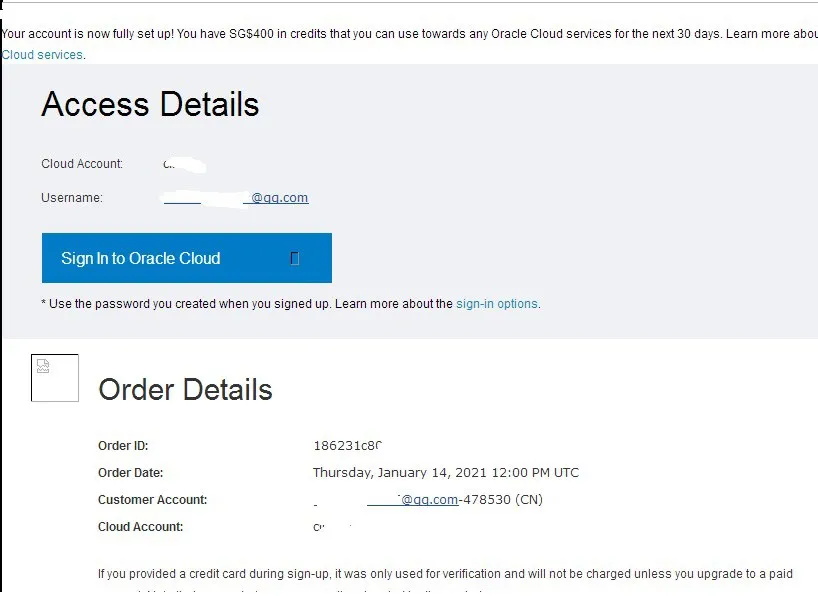 Oracle客服的回信:说了一些调整,让重新注册。应该是把我的信用卡添加到白名单了。再次注册Oracle甲骨文云,直接通过,未提示错误。