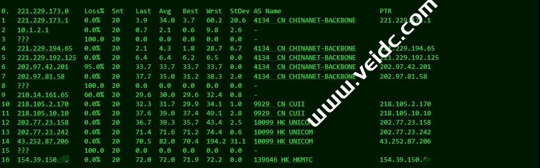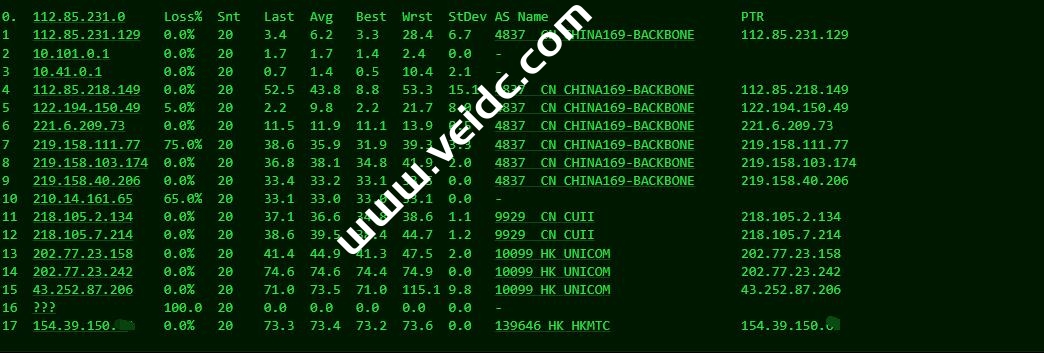[Info] 测试路由 到 上海电信(天翼云) 中 ... traceroute to 101.227.255.45 (101.227.255.45), 30 hops max, 32 byte packets 1 154.39.150.254 103.56 ms AS139646 新加坡, cogentco.com 2 10.249.0.5 1.25 ms * 局域网 3 43.252.87.205 1.74 ms AS10099 新加坡, chinaunicom.com, 联通 4 202.77.23.241 37.72 ms AS10099 中国, 香港, chinaunicom.com, 联通 5 202.77.23.157 37.38 ms AS10099 中国, 香港, chinaunicom.com, 联通 6 218.105.11.85 43.08 ms AS9929 中国, 广东, 广州, chinaunicom.com, 联通 7 218.105.2.109 43.28 ms AS9929 中国, 广东, 广州, chinaunicom.com, 联通 8 218.105.131.182 67.69 ms AS9929 中国, 上海, chinaunicom.com, 联通 9 218.105.2.150 69.03 ms AS9929 中国, 上海, chinaunicom.com, 联通 10 202.97.16.65 73.32 ms AS4134 中国, 上海, chinatelecom.com.cn, 电信 11 * 12 61.152.25.197 69.14 ms AS4812 中国, 上海, chinatelecom.com.cn, 电信 13 * 14 * 15 * 16 * 17 * 18 * 19 * 20 * 21 * 22 * 23 * 24 * 25 * 26 * 27 * 28 * 29 * 30 * [Info] 测试路由 到 上海电信(天翼云) 完成 ! [Info] 测试路由 到 厦门电信CN2 中 ... traceroute to 117.28.254.129 (117.28.254.129), 30 hops max, 32 byte packets 1 154.39.150.254 7.23 ms AS139646 新加坡, cogentco.com 2 10.249.0.5 1.48 ms * 局域网 3 43.252.87.205 1.84 ms AS10099 新加坡, chinaunicom.com, 联通 4 202.77.23.241 37.80 ms AS10099 中国, 香港, chinaunicom.com, 联通 5 202.77.23.157 37.11 ms AS10099 中国, 香港, chinaunicom.com, 联通 6 218.105.7.217 45.99 ms AS9929 中国, 广东, 广州, chinaunicom.com, 联通 7 218.105.2.157 44.02 ms AS9929 中国, 广东, 广州, chinaunicom.com, 联通 8 218.105.131.121 76.05 ms AS9929 中国, 北京, chinaunicom.com, 联通 9 210.78.30.142 75.46 ms * 中国, chinaunicom.com, 联通 10 219.158.39.69 79.47 ms AS4837 中国, 北京, chinaunicom.com, 联通 11 * 12 219.158.5.130 80.56 ms AS4837 中国, 北京, chinaunicom.com, 联通 13 219.158.40.166 75.08 ms AS4837 中国, 北京, chinaunicom.com, 联通 14 59.43.140.82 77.42 ms * 中国, 北京, chinatelecom.com.cn, 电信 15 59.43.142.234 77.71 ms * 中国, 广东, 广州, chinatelecom.com.cn, 电信 16 59.43.140.34 91.86 ms * 中国, 福建, chinatelecom.com.cn, 电信 17 * 18 * 19 117.25.141.110 91.89 ms AS133775 中国, 福建, 厦门, chinatelecom.com.cn, 电信 20 117.28.254.129 91.01 ms AS4809 中国, 福建, 厦门, chinatelecom.com.cn, 电信 [Info] 测试路由 到 厦门电信CN2 完成 ! [Info] 测试路由 到 浙江杭州联通 中 ... traceroute to 101.71.241.238 (101.71.241.238), 30 hops max, 32 byte packets 1 154.39.150.254 1.91 ms AS139646 新加坡, cogentco.com 2 10.249.0.5 1.42 ms * 局域网 3 43.252.87.205 3.63 ms AS10099 新加坡, chinaunicom.com, 联通 4 202.77.23.241 37.45 ms AS10099 中国, 香港, chinaunicom.com, 联通 5 202.77.23.157 37.24 ms AS10099 中国, 香港, chinaunicom.com, 联通 6 218.105.7.213 41.24 ms AS9929 中国, 广东, 广州, chinaunicom.com, 联通 7 218.105.2.129 42.29 ms AS9929 中国, 广东, 广州, chinaunicom.com, 联通 8 218.105.131.198 68.33 ms AS9929 中国, 上海, chinaunicom.com, 联通 9 218.105.2.174 68.60 ms AS9929 中国, 上海, chinaunicom.com, 联通 10 219.158.44.205 70.68 ms AS4837 中国, 上海, chinaunicom.com, 联通 11 219.158.113.197 70.29 ms AS4837 中国, 上海, chinaunicom.com, 联通 12 219.158.106.122 75.31 ms AS4837 中国, 浙江, 杭州, chinaunicom.com, 联通 13 * 14 * 15 * 16 * 17 * 18 * 19 * 20 * 21 * 22 * 23 * 24 * 25 * 26 * 27 * 28 * 29 * 30 * [Info] 测试路由 到 浙江杭州联通 完成 ! [Info] 测试路由 到 浙江杭州移动 中 ... traceroute to 112.17.0.106 (112.17.0.106), 30 hops max, 32 byte packets 1 154.39.150.254 7.75 ms AS139646 新加坡, cogentco.com 2 10.249.0.5 1.61 ms * 局域网 3 43.252.87.205 1.80 ms AS10099 新加坡, chinaunicom.com, 联通 4 61.14.201.109 43.47 ms * 中国, 香港, chinaunicom.com, 联通 5 202.77.23.157 36.81 ms AS10099 中国, 香港, chinaunicom.com, 联通 6 218.105.10.125 42.48 ms AS9929 中国, 广东, chinaunicom.com, 联通 7 218.105.2.133 41.03 ms AS9929 中国, 广东, 广州, chinaunicom.com, 联通 8 218.105.131.198 68.15 ms AS9929 中国, 上海, chinaunicom.com, 联通 9 218.105.2.174 68.51 ms AS9929 中国, 上海, chinaunicom.com, 联通 10 219.158.113.149 71.49 ms AS4837 中国, 上海, chinaunicom.com, 联通 11 * 12 * 13 219.158.112.102 80.60 ms AS4837 中国, 浙江, 杭州, chinaunicom.com, 联通 14 * 15 221.183.95.121 95.30 ms AS9808 中国, 浙江, 杭州, chinamobile.com, 移动 16 * 17 * 18 * 19 * 20 * 21 * 22 * 23 * 24 * 25 * 26 * 27 * 28 * 29 * 30 * [Info] 测试路由 到 浙江杭州移动 完成 ! [Info] 测试路由 到 北京教育网 中 ... traceroute to 202.205.6.30 (202.205.6.30), 30 hops max, 32 byte packets 1 154.39.150.254 3.25 ms AS139646 新加坡, cogentco.com 2 10.249.0.5 1.30 ms * 局域网 3 43.252.87.205 1.75 ms AS10099 新加坡, chinaunicom.com, 联通 4 202.77.23.241 36.59 ms AS10099 中国, 香港, chinaunicom.com, 联通 5 202.77.23.157 37.09 ms AS10099 中国, 香港, chinaunicom.com, 联通 6 218.105.11.85 41.51 ms AS9929 中国, 广东, 广州, chinaunicom.com, 联通 7 218.105.2.133 41.57 ms AS9929 中国, 广东, 广州, chinaunicom.com, 联通 8 218.105.131.198 68.50 ms AS9929 中国, 上海, chinaunicom.com, 联通 9 218.105.2.174 68.80 ms AS9929 中国, 上海, chinaunicom.com, 联通 10 219.158.113.149 71.21 ms AS4837 中国, 上海, chinaunicom.com, 联通 11 219.158.113.197 70.32 ms AS4837 中国, 上海, chinaunicom.com, 联通 12 219.158.101.30 70.15 ms AS4837 中国, 上海, chinaunicom.com, 联通 13 211.102.30.15 85.03 ms * 中国, 上海, 电信/教育网/联通 14 101.4.117.229 119.36 ms AS4538 中国, 上海, edu.cn, 教育网 15 101.4.118.114 86.71 ms AS4538 中国, 上海, edu.cn, 教育网 16 101.4.118.197 86.19 ms AS4538 中国, 北京, edu.cn, 教育网 17 101.4.113.110 82.56 ms AS4538 中国, 北京, edu.cn, 教育网 18 219.224.102.230 108.22 ms AS4538 中国, 