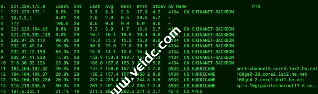 Traceroute to China, Guangzhou CT (TCP Mode, Max 30 Hop) ============================================================ traceroute to 113.108.209.1 (113.108.209.1), 30 hops max, 32 byte packets 1 * 2 107.6.252.20 0.47 ms AS4213 United States, Hawaii, Honolulu, vpls.com 3 * 4 154.54.87.249 45.88 ms AS174 United States, California, Los Angeles, cogentco.com 5 154.54.25.149 48.21 ms AS174 United States, California, Los Angeles, cogentco.com 6 154.54.31.190 60.40 ms AS174 United States, California, San Jose, cogentco.com 7 154.54.5.102 59.90 ms AS174 United States, California, San Jose, cogentco.com 8 38.104.138.106 58.62 ms AS174 United States, California, San Jose, cogentco.com 9 202.97.22.121 207.38 ms AS4134 China, Guangdong, Guangzhou, ChinaTelecom 10 * 11 202.97.82.61 218.78 ms AS4134 China, Guangdong, Guangzhou, ChinaTelecom 12 113.108.209.1 218.78 ms AS4134 China, Guangdong, Guangzhou, ChinaTelecom Traceroute to China, Shanghai CT (TCP Mode, Max 30 Hop) ============================================================ traceroute to 180.153.28.5 (180.153.28.5), 30 hops max, 32 byte packets 1 * 2 107.6.252.20 0.37 ms AS4213 United States, Hawaii, Honolulu, vpls.com 3 * 4 154.54.87.249 46.25 ms AS174 United States, California, Los Angeles, cogentco.com 5 154.54.25.149 47.12 ms AS174 United States, California, Los Angeles, cogentco.com 6 154.54.31.190 60.26 ms AS174 United States, California, San Jose, cogentco.com 7 154.54.5.102 60.48 ms AS174 United States, California, San Jose, cogentco.com 8 38.104.138.106 59.05 ms AS174 United States, California, San Jose, cogentco.com 9 * 10 202.97.12.181 181.33 ms AS4134 China, Shanghai, ChinaTelecom 11 202.97.24.145 194.56 ms AS4134 China, Shanghai, ChinaTelecom 12 61.152.24.77 198.18 ms AS4812 China, Shanghai, ChinaTelecom 13 * 14 124.74.232.58 199.40 ms AS4811 China, Shanghai, ChinaTelecom 15 101.227.255.34 195.10 ms AS4812 China, Shanghai, ChinaTelecom 16 * 17 * 18 * 19 180.153.28.5 193.55 ms AS4812 China, Shanghai, ChinaTelecom Traceroute to China, Beijing CT (TCP Mode, Max 30 Hop) ============================================================ traceroute to 180.149.128.9 (180.149.128.9), 30 hops max, 32 byte packets 1 * 2 107.6.252.20 0.46 ms AS4213 United States, Hawaii, Honolulu, vpls.com 3 * 4 154.54.87.249 46.93 ms AS174 United States, California, Los Angeles, cogentco.com 5 154.54.25.149 46.88 ms AS174 United States, California, Los Angeles, cogentco.com 6 154.54.40.146 59.27 ms AS174 United States, California, San Jose, cogentco.com 7 154.54.1.194 60.87 ms AS174 United States, California, San Jose, cogentco.com 8 38.104.138.106 57.80 ms AS174 United States, California, San Jose, cogentco.com 9 * 10 * 11 * 12 * 13 36.110.251.61 217.32 ms AS23724 China, Beijing, ChinaTelecom 14 180.149.128.9 213.90 ms AS23724 China, Beijing, ChinaTelecom