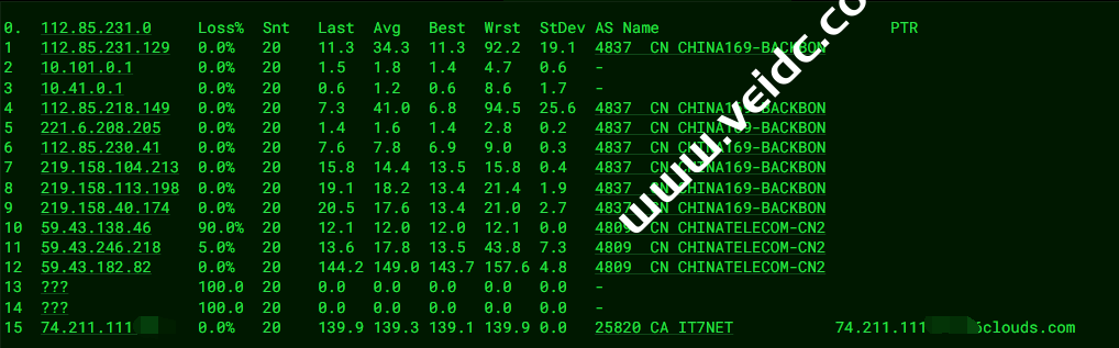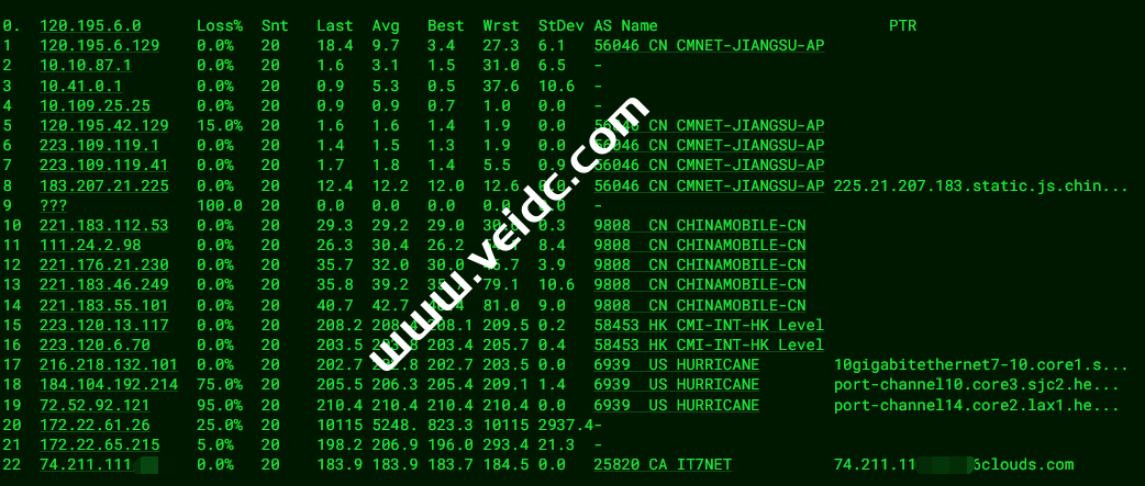 [Info] 测试路由 到 上海电信(天翼云) 中 ... traceroute to 101.227.255.45 (101.227.255.45), 30 hops max, 32 byte packets 1 172.22.65.200 15.22 ms * 局域网 2 172.22.61.150 15.50 ms * 局域网 3 * 4 218.30.49.93 0.68 ms AS4134 美国, chinatelecom.com.cn, 电信 5 59.43.189.37 126.55 ms * 中国, 上海, chinatelecom.com.cn, 电信 6 * 7 * 8 101.95.88.194 131.19 ms AS4812 中国, 上海, chinatelecom.com.cn, 电信 9 * 10 * 11 * 12 * 13 * 14 * 15 * 16 * 17 * 18 * 19 * 20 * 21 * 22 * 23 * 24 * 25 * 26 * 27 * 28 * 29 * 30 * [Info] 测试路由 到 上海电信(天翼云) 完成 ! [Info] 测试路由 到 厦门电信CN2 中 ... traceroute to 117.28.254.129 (117.28.254.129), 30 hops max, 32 byte packets 1 172.22.65.200 12.83 ms * 局域网 2 172.22.61.150 17.63 ms * 局域网 3 * 4 218.30.49.109 0.93 ms AS4134 美国, chinatelecom.com.cn, 电信 5 59.43.246.237 130.18 ms * 中国, 上海, chinatelecom.com.cn, 电信 6 * 7 59.43.138.45 128.44 ms * 中国, 上海, chinatelecom.com.cn, 电信 8 59.43.138.186 155.50 ms * 中国, 福建, chinatelecom.com.cn, 电信 9 * 10 * 11 117.25.141.110 146.26 ms AS133775 中国, 福建, 厦门, chinatelecom.com.cn, 电信 12 117.28.254.129 155.76 ms AS4809 中国, 福建, 厦门, chinatelecom.com.cn, 电信 [Info] 测试路由 到 厦门电信CN2 完成 ! [Info] 测试路由 到 浙江杭州联通 中 ... traceroute to 101.71.241.238 (101.71.241.238), 30 hops max, 32 byte packets 1 172.22.65.200 19.64 ms * 局域网 2 172.22.61.150 14.84 ms * 局域网 3 * 4 218.30.48.21 0.52 ms AS4134 美国, 加利福尼亚州, 洛杉矶, chinatelecom.com.cn, 电信 5 59.43.184.153 126.55 ms * 中国, 上海, chinatelecom.com.cn, 电信 6 59.43.187.69 164.18 ms * 中国, 上海, chinatelecom.com.cn, 电信 7 59.43.130.217 131.99 ms * 中国, 上海, chinatelecom.com.cn, 电信 8 219.158.40.173 130.26 ms AS4837 中国, 上海, chinaunicom.com, 联通 9 219.158.113.197 128.29 ms AS4837 中国, 上海, chinaunicom.com, 联通 10 219.158.106.122 135.34 ms AS4837 中国, 浙江, 杭州, chinaunicom.com, 联通 11 101.69.245.206 133.36 ms AS4837 中国, 浙江, 杭州, chinaunicom.com, 联通 12 * 13 * 14 * 15 * 16 * 17 * 18 * 19 * 20 * 21 * 22 * 23 * 24 * 25 * 26 * 27 * 28 * 29 * 30 * [Info] 测试路由 到 浙江杭州联通 完成 ! [Info] 测试路由 到 浙江杭州移动 中 ... traceroute to 112.17.0.106 (112.17.0.106), 30 hops max, 32 byte packets 1 172.22.65.200 11.70 ms * 局域网 2 172.22.61.150 11.78 ms * 局域网 3 218.30.49.141 0.94 ms AS4134 美国, 加利福尼亚州, 洛杉矶, chinatelecom.com.cn, 电信 4 59.43.184.153 126.54 ms * 中国, 上海, chinatelecom.com.cn, 电信 5 * 6 * 7 * 8 202.97.33.250 133.64 ms AS4134 中国, 浙江, 金华, chinatelecom.com.cn, 电信 9 * 10 221.183.54.205 177.78 ms AS9808 中国, 浙江, 杭州, chinamobile.com, 移动 11 221.183.94.141 164.85 ms AS9808 中国, 浙江, 杭州, chinamobile.com, 移动 12 * 13 * 14 * 15 * 16 * 17 * 18 * 19 * 20 * 21 * 22 * 23 * 24 * 25 * 26 * 27 * 28 * 29 * 30 * [Info] 测试路由 到 浙江杭州移动 完成 ! [Info] 测试路由 到 北京教育网 中 ... traceroute to 202.205.6.30 (202.205.6.30), 30 hops max, 32 byte packets 1 172.22.65.200 14.12 ms * 局域网 2 172.22.61.150 47.43 ms * 局域网 3 xe-3/2/0.re.lax.DMIT.com (193.41.248.189) 1.71 ms AS54574 美国, 加利福尼亚州, 洛杉矶, dmit.io 4 AS4809.re.lax.DMIT.com (193.41.248.130) 0.86 ms AS54574 美国, 加利福尼亚州, 洛杉矶, dmit.io 5 59.43.189.33 129.82 ms * 中国, 上海, chinatelecom.com.cn, 电信 6 * 7 * 8 * 9 202.97.60.218 135.71 ms AS4134 中国, 上海, chinatelecom.com.cn, 电信 10 * 11 101.4.118.197 168.40 ms AS4538 中国, 北京, edu.cn, 教育网 12 * 13 219.224.102.230 169.00 ms AS4538 中国, 北京, edu.cn, 教育网 14 * 15 * 16 101.4.130.54 173.42 ms AS4538 中国, 北京, edu.cn, 教育网 17 * 18 * 19 * 20 * 21 * 22 * 23 * 24 * 25 * 26 * 27 * 28 * 29 * 30 * [Info] 测试路由 到 北京教育网 完成 ! [Info] 四网路由快速测试 已完成 !