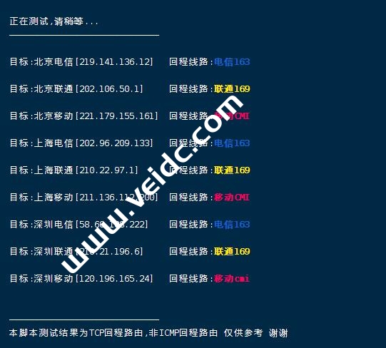 [Info] 测试路由 到 上海电信(天翼云) 中 ... traceroute to 101.227.255.45 (101.227.255.45), 30 hops max, 32 byte packets 1 no.rdns.ukservers.com (5.101.149.193) 18.50 ms AS42831 United Kingdom, West Midlands County, Coventry, ukservers.com 2 31-132-6-142.as42831.net (31.132.6.142) 6.03 ms AS42831 United Kingdom, London, ukservers.com 3 * 4 be2350.ccr42.lon13.atlas.cogentco.com (130.117.51.137) 5.75 ms AS174 United Kingdom, London, cogentco.com 5 be2382.rcr21.b015533-1.lon13.atlas.cogentco.com (154.54.61.162) 5.92 ms AS174 United Kingdom, London, cogentco.com 6 chinatelecom.demarc.cogentco.com (149.14.81.226) 14.36 ms AS174 United Kingdom, London, cogentco.com 7 * 8 * 9 * 10 61.152.25.21 250.84 ms AS4812 China, Shanghai, ChinaTelecom 11 101.95.207.2 257.54 ms AS4812 China, Shanghai, ChinaTelecom 12 * 13 * 14 * 15 * 16 * 17 * 18 * 19 * 20 * 21 * 22 * 23 * 24 * 25 * 26 * 27 * 28 * 29 * 30 * [Info] 测试路由 到 上海电信(天翼云) 完成 ! [Info] 测试路由 到 厦门电信CN2 中 ... traceroute to 117.28.254.129 (117.28.254.129), 30 hops max, 32 byte packets 1 no.rdns.ukservers.com (5.101.149.193) 0.88 ms AS42831 United Kingdom, West Midlands County, Coventry, ukservers.com 2 31-132-6-142.as42831.net (31.132.6.142) 5.61 ms AS42831 United Kingdom, London, ukservers.com 3 ae31.cr10-lon1.ip4.gtt.net (46.33.70.1) 5.56 ms AS3257 United Kingdom, London, gtt.net 4 ae0.cr12-lon1.ip4.gtt.net (141.136.107.2) 5.70 ms AS3257 United Kingdom, London, gtt.net 5 ae-11.edge7.London1.Level3.net (4.68.72.201) 6.30 ms AS3356 United Kingdom, London, level3.com 6 * 7 CHINA-TELEC.ear1.London15.Level3.net (217.163.47.130) 6.11 ms AS3356 United Kingdom, London, level3.com 8 59.43.250.1 235.19 ms * China, ChinaTelecom 9 * 10 59.43.130.209 242.96 ms * China, Shanghai, ChinaTelecom 11 59.43.138.186 237.39 ms * China, Fujian, ChinaTelecom 12 * 13 27.159.81.218 289.33 ms AS133775 China, Fujian, Xiamen, ChinaTelecom 14 117.25.141.110 273.86 ms AS133775 China, Fujian, Xiamen, ChinaTelecom 15 117.28.254.129 241.67 ms AS4809 China, Fujian, Xiamen, ChinaTelecom [Info] 测试路由 到 厦门电信CN2 完成 ! [Info] 测试路由 到 浙江杭州联通 中 ... traceroute to 101.71.241.238 (101.71.241.238), 30 hops max, 32 byte packets 1 no.rdns.ukservers.com (5.101.149.193) 0.34 ms AS42831 United Kingdom, West Midlands County, Coventry, ukservers.com 2 31-132-6-142.as42831.net (31.132.6.142) 5.51 ms AS42831 United Kingdom, London, ukservers.com 3 * 4 be2348.ccr41.lon13.atlas.cogentco.com (130.117.51.73) 5.99 ms AS174 United Kingdom, London, cogentco.com 5 be12194.ccr41.ams03.atlas.cogentco.com (154.54.56.94) 12.85 ms AS174 Netherlands, North Holland, Amsterdam, cogentco.com 6 be2813.ccr41.fra03.atlas.cogentco.com (130.117.0.122) 19.47 ms AS174 Germany, Hesse, Frankfurt, cogentco.com 7 be2845.rcr22.fra06.atlas.cogentco.com (154.54.56.190) 20.06 ms AS174 Germany, Hesse, Frankfurt, cogentco.com 8 be2844.agr21.fra06.atlas.cogentco.com (130.117.0.30) 19.75 ms AS174 Germany, Hesse, Frankfurt, cogentco.com 9 154.25.14.78 20.14 ms AS174 Europe Regions, cogentco.com 10 149.11.84.202 242.87 ms AS174 Germany, Hesse, Frankfurt, cogentco.com 11 219.158.20.173 237.38 ms AS4837 China, Guangdong, Guangzhou, ChinaUnicom 12 219.158.24.133 267.39 ms AS4837 China, Guangdong, Guangzhou, ChinaUnicom 13 219.158.8.113 255.31 ms AS4837 China, Guangdong, Guangzhou, ChinaUnicom 14 219.158.114.206 234.68 ms AS4837 China, Zhejiang, Hangzhou, ChinaUnicom 15 101.69.245.206 254.17 ms AS4837 China, Zhejiang, Hangzhou, ChinaUnicom 16 * 17 * 18 * 19 * 20 * 21 * 22 * 23 * 24 * 25 * 26 * 27 * 28 * 29 * 30 * [Info] 测试路由 到 浙江杭州联通 完成 ! [Info] 测试路由 到 浙江杭州移动 中 ... traceroute to 112.17.0.106 (112.17.0.106), 30 hops max, 32 byte packets 1 no.rdns.ukservers.com (5.101.149.193) 0.46 ms AS42831 United Kingdom, West Midlands County, Coventry, ukservers.com 2 31-132-6-142.as42831.net (31.132.6.142) 5.64 ms AS42831 United Kingdom, London, ukservers.com 3 ae31.cr10-lon1.ip4.gtt.net (46.33.70.1) 5.72 ms AS3257 United Kingdom, London, gtt.net 4 ae22.cr3-lax1.ip4.gtt.net (89.149.181.102) 131.20 ms AS3257 United States, California, Los Angeles, gtt.net 5 ip4.gtt.net (173.205.45.154) 136.48 ms AS3257 United States, California, Los Angeles, gtt.net 6 223.120.6.217 137.94 ms AS58453 United States, California, Los Angeles, ChinaMobile 7 223.120.12.18 266.28 ms AS58453 China, Shanghai, ChinaMobile 8 221.183.55.50 274.13 ms AS9808 China, Shanghai, ChinaMobile 9 221.183.25.193 265.64 ms AS9808 China, Shanghai, ChinaMobile 10 221.176.22.33 266.59 ms AS9808 China, Shanghai, ChinaMobile 11 111.24.4.77 267.25 ms AS9808 China, Shanghai, ChinaMobile 12 221.176.22.122 302.52 ms AS9808 China, Zhejiang, Hangzhou, ChinaMobile 13 * 14 112.17.194.138 274.87 ms AS56041 China, Zhejiang, Hangzhou, ChinaMobile 15 * 16 * 17 * 18 * 19 * 20 * 21 * 22 * 23 * 24 * 25 * 26 * 27 * 28 * 29 * 30 * [Info] 测试路由 到 浙江杭州移动 完成 ! [Info] 测试路由 到 北京教育网 中 ... traceroute to 202.205.6.30 (202.205.6.30), 30 hops max, 32 byte packets 1 no.rdns.ukservers.com (5.101.149.193) 0.30 ms AS42831 United Kingdom, West Midlands County, Coventry, ukservers.com 2 31-132-6-142.as42831.net (31.132.6.142) 5.62 ms AS42831 United Kingdom, London, ukservers.com 3 * 4 be2348.ccr41.lon13.atlas.cogentco.com (130.117.51.73) 5.56 ms AS174 United Kingdom, London, cogentco.com 5 be2317.ccr41.jfk02.atlas.cogentco.com (154.54.30.185) 75.42 ms AS174 United States, New York, New York City, cogentco.com 6 be2806.ccr41.dca01.atlas.cogentco.com (154.54.40.106) 81.06 ms AS174 United States, Virginia, Arlington, cogentco.com 7 be2112.ccr41.atl01.atlas.cogentco.com (154.54.7.158) 95.30 ms AS174 United States, Georgia, Atlanta, cogentco.com 8 be2687.ccr41.iah01.atlas.cogentco.com (154.54.28.70) 108.59 ms AS174 United States, Texas, Houston, cogentco.com 9 be2927.ccr21.elp01.atlas.cogentco.com (154.54.29.222) 124.89 ms AS174 United States, Texas