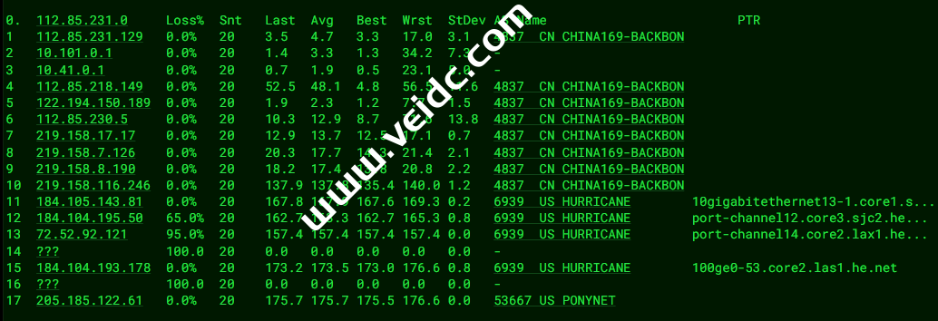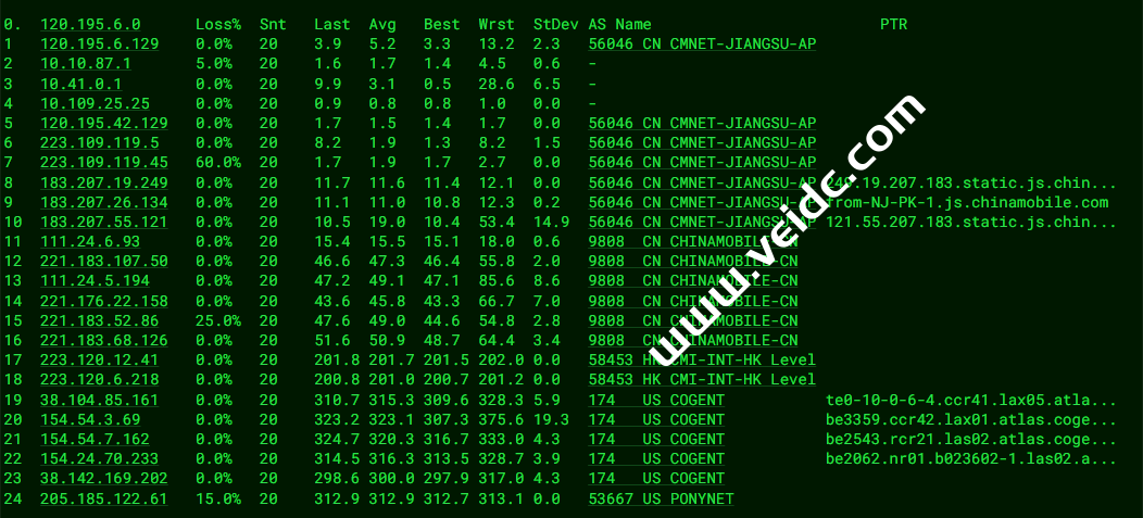 [Info] 测试路由 到 上海电信(天翼云) 中 ... traceroute to 101.227.255.45 (101.227.255.45), 30 hops max, 32 byte packets 1 205.185.112.1 2.79 ms AS53667 United States, Nevada, Las Vegas, buyvm.net 2 172.18.0.29 2.78 ms * LAN Address 3 * 4 100ge3-2.core1.lax2.he.net (184.104.197.61) 8.27 ms AS6939 United States, California, Los Angeles, he.net 5 218.30.53.225 13.73 ms AS4134 United States, ChinaTelecom 6 202.97.43.69 132.52 ms AS4134 China, Shanghai, ChinaTelecom 7 * 8 202.97.62.157 138.03 ms AS4134 China, Shanghai, ChinaTelecom 9 61.152.24.145 143.31 ms AS4812 China, Shanghai, ChinaTelecom 10 * 11 * 12 * 13 * 14 * 15 * 16 * 17 * 18 * 19 * 20 * 21 * 22 * 23 * 24 * 25 * 26 * 27 * 28 * 29 * 30 * [Info] 测试路由 到 上海电信(天翼云) 完成 ! [Info] 测试路由 到 厦门电信CN2 中 ... traceroute to 117.28.254.129 (117.28.254.129), 30 hops max, 32 byte packets 1 205.185.112.1 0.33 ms AS53667 United States, Nevada, Las Vegas, buyvm.net 2 172.18.0.29 79.69 ms * LAN Address 3 * 4 port-channel7.core2.osa1.he.net (184.104.198.218) 188.71 ms AS6939 Japan, Osaka, he.net 5 * 6 chinatelecomglobal-as4809.sgix.sg.102.16.103.in-addr.arpa (103.16.102.53) 254.49 ms * Singapore, sgix.sg 7 59.43.189.205 304.75 ms * China, Guangdong, Guangzhou, ChinaTelecom 8 59.43.187.113 310.66 ms * China, Guangdong, Guangzhou, ChinaTelecom 9 59.43.130.125 317.24 ms * China, Guangdong, Guangzhou, ChinaTelecom 10 59.43.140.34 330.43 ms * China, Fujian, ChinaTelecom 11 110.80.128.94 289.33 ms AS133775 China, Fujian, Xiamen, ChinaTelecom 12 27.159.81.202 308.49 ms AS133775 China, Fujian, Xiamen, ChinaTelecom 13 117.25.141.110 307.21 ms AS133775 China, Fujian, Xiamen, ChinaTelecom 14 117.28.254.129 326.25 ms AS4809 China, Fujian, Xiamen, ChinaTelecom [Info] 测试路由 到 厦门电信CN2 完成 ! [Info] 测试路由 到 浙江杭州联通 中 ... traceroute to 101.71.241.238 (101.71.241.238), 30 hops max, 32 byte packets 1 205.185.112.1 0.42 ms AS53667 United States, Nevada, Las Vegas, buyvm.net 2 172.18.0.29 98.33 ms * LAN Address 3 * 4 100ge3-2.core1.lax2.he.net (184.104.197.61) 103.03 ms AS6939 United States, California, Los Angeles, he.net 5 china169-backbone-as4837.100gigabitethernet12-2.core1.lax2.he.net (72.52.93.38) 272.80 ms AS6939 United States, California, Los Angeles, he.net 6 219.158.101.197 274.53 ms AS4837 China, Guangdong, Guangzhou, ChinaUnicom 7 219.158.24.133 267.91 ms AS4837 China, Guangdong, Guangzhou, ChinaUnicom 8 219.158.8.113 265.97 ms AS4837 China, Guangdong, Guangzhou, ChinaUnicom 9 219.158.20.234 271.95 ms AS4837 China, Zhejiang, Hangzhou, ChinaUnicom 10 101.71.244.94 262.46 ms AS4837 China, Zhejiang, Hangzhou, ChinaUnicom 11 * 12 * 13 * 14 * 15 * 16 * 17 * 18 * 19 * 20 * 21 * 22 * 23 * 24 * 25 * 26 * 27 * 28 * 29 * 30 * [Info] 测试路由 到 浙江杭州联通 完成 ! [Info] 测试路由 到 浙江杭州移动 中 ... traceroute to 112.17.0.106 (112.17.0.106), 30 hops max, 32 byte packets 1 205.185.112.1 0.56 ms AS53667 United States, Nevada, Las Vegas, buyvm.net 2 ae2-177.cr1-las1.ip4.gtt.net (76.74.97.161) 0.57 ms AS3257 United States, Nevada, Las Vegas, gtt.net 3 ae23.cr3-lax1.ip4.gtt.net (89.149.187.114) 6.48 ms AS3257 United States, California, Los Angeles, gtt.net 4 ip4.gtt.net (173.205.45.154) 6.96 ms AS3257 United States, California, Los Angeles, gtt.net 5 * 6 * 7 * 8 * 9 * 10 * 11 * 12 * 13 * 14 * 15 * 16 * 17 * 18 * 19 * 20 * 21 * 22 * 23 * 24 * 25 * 26 * 27 * 28 * 29 * 30 * [Info] 测试路由 到 浙江杭州移动 完成 ! [Info] 测试路由 到 北京教育网 中 ... traceroute to 202.205.6.30 (202.205.6.30), 30 hops max, 32 byte packets 1 205.185.112.1 4.94 ms AS53667 United States, Nevada, Las Vegas, buyvm.net 2 172.18.0.29 99.61 ms * LAN Address 3 100ge0-70.core3.lax2.he.net (184.104.193.177) 110.72 ms AS6939 United States, California, Los Angeles, he.net 4 100ge10-1.core1.hkg1.he.net (184.105.64.126) 242.92 ms AS6939 China, Hong Kong, he.net 5 port-channel1.core2.hkg1.he.net (184.104.197.90) 243.26 ms AS6939 China, Hong Kong, he.net 6 multidata1-10g.hkix.net (123.255.91.118) 276.01 ms * China, Hong Kong, hkix.net 7 101.4.114.181 271.23 ms AS4538 China, Beijing, CHINAEDU 8 * 9 * 10 101.4.118.213 264.91 ms AS4538 China, Beijing, CHINAEDU 11 101.4.113.110 264.20 ms AS4538 China, Beijing, CHINAEDU 12 219.224.102.230 262.65 ms AS4538 China, Beijing, CHINAEDU 13 * 14 * 15 * 16 * 17 * 18 * 19 * 20 * 21 * 22 * 23 * 24 * 25 * 26 * 27 * 28 101.4.130.53 186.69 ms AS4538 China, Beijing, CHINAEDU 29 * 30 * [Info] 测试路由 到 北京教育网 完成 ! [Info] 四网路由快速测试 已完成 !