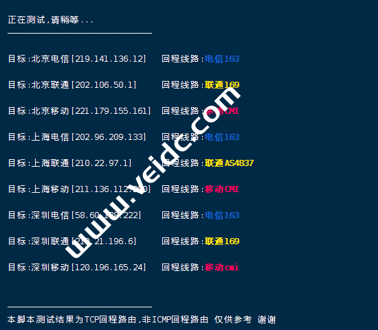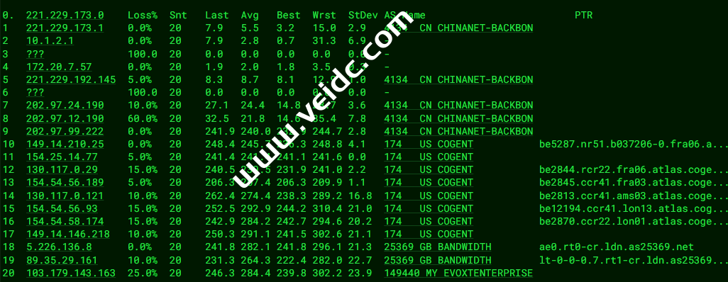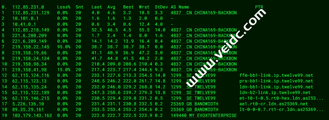 [Info] 测试路由 到 上海电信(天翼云) 中 ... traceroute to 101.227.255.45 (101.227.255.45), 30 hops max, 32 byte packets 1 5.226.136.233 0.79 ms AS25369 United Kingdom, London, zare.com 2 160.29.35.89.baremetal.zare.com (89.35.29.160) 0.53 ms AS25369 United Kingdom, London, zare.com 3 ae2.rt0-thn2.ldn.as25369.net (5.226.136.9) 0.64 ms AS25369 United Kingdom, London, zare.com 4 * 5 be2870.ccr41.lon13.atlas.cogentco.com (154.54.58.173) 1.12 ms AS174 United Kingdom, London, cogentco.com 6 be2375.rcr21.b015533-1.lon13.atlas.cogentco.com (154.54.61.158) 1.23 ms AS174 United Kingdom, London, cogentco.com 7 chinatelecom.demarc.cogentco.com (149.14.81.226) 33.61 ms AS174 United Kingdom, London, cogentco.com 8 202.97.70.33 249.97 ms AS4134 China, Shanghai, ChinaTelecom 9 * 10 * 11 * 12 * 13 * 14 * 15 * 16 * 17 * 18 * 19 * 20 * 21 * 22 * 23 * 24 * 25 * 26 * 27 * 28 * 29 * 30 * [Info] 测试路由 到 上海电信(天翼云) 完成 ! [Info] 测试路由 到 厦门电信CN2 中 ... traceroute to 117.28.254.129 (117.28.254.129), 30 hops max, 32 byte packets 1 5.226.136.233 0.40 ms AS25369 United Kingdom, London, zare.com 2 160.29.35.89.baremetal.zare.com (89.35.29.160) 17.42 ms AS25369 United Kingdom, London, zare.com 3 ae1.rt0-hex.ldn.as25369.net (5.226.136.11) 0.42 ms AS25369 United Kingdom, London, zare.com 4 ldn-b2-link.ip.twelve99.net (62.115.146.214) 0.84 ms AS1299 United Kingdom, London, telia.com 5 chinatelecom-ic335972-ldn-b2.ip.twelve99-cust.net (80.239.193.226) 0.83 ms AS1299 United Kingdom, London, telia.com 6 59.43.250.1 259.26 ms * China, ChinaTelecom 7 * 8 59.43.138.49 267.42 ms * China, Shanghai, ChinaTelecom 9 59.43.138.186 223.92 ms * China, Fujian, ChinaTelecom 10 * 11 * 12 * 13 * 14 117.28.254.129 224.44 ms AS4809 China, Fujian, Xiamen, ChinaTelecom [Info] 测试路由 到 厦门电信CN2 完成 ! [Info] 测试路由 到 浙江杭州联通 中 ... traceroute to 101.71.241.238 (101.71.241.238), 30 hops max, 32 byte packets 1 5.226.136.233 1.24 ms AS25369 United Kingdom, London, zare.com 2 160.29.35.89.baremetal.zare.com (89.35.29.160) 0.32 ms AS25369 United Kingdom, London, zare.com 3 ae1.rt0-hex.ldn.as25369.net (5.226.136.11) 7.54 ms AS25369 United Kingdom, London, zare.com 4 ae4-224.cr12-lon2.ip4.gtt.net (77.67.82.245) 0.83 ms AS3257 United Kingdom, London, gtt.net 5 ae22.cr2-fra6.ip4.gtt.net (213.200.117.138) 23.10 ms AS3257 Germany, Hesse, Frankfurt, gtt.net 6 * 7 219.158.3.241 167.91 ms AS4837 China, Beijing, ChinaUnicom 8 219.158.98.93 171.31 ms AS4837 China, Guangdong, Guangzhou, ChinaUnicom 9 219.158.24.125 174.00 ms AS4837 China, Guangdong, Guangzhou, ChinaUnicom 10 219.158.20.234 228.41 ms AS4837 China, Zhejiang, Hangzhou, ChinaUnicom 11 * 12 * 13 * 14 * 15 * 16 * 17 * 18 * 19 * 20 * 21 * 22 * 23 * 24 * 25 * 26 * 27 * 28 * 29 * 30 * [Info] 测试路由 到 浙江杭州联通 完成 ! [Info] 测试路由 到 浙江杭州移动 中 ... traceroute to 112.17.0.106 (112.17.0.106), 30 hops max, 32 byte packets 1 5.226.136.233 5.09 ms AS25369 United Kingdom, London, zare.com 2 160.29.35.89.baremetal.zare.com (89.35.29.160) 0.39 ms AS25369 United Kingdom, London, zare.com 3 ae1.rt0-hex.ldn.as25369.net (5.226.136.11) 0.41 ms AS25369 United Kingdom, London, zare.com 4 ldn-b2-link.ip.twelve99.net (62.115.146.214) 0.80 ms AS1299 United Kingdom, London, telia.com 5 ldn-bb1-link.ip.twelve99.net (62.115.122.188) 0.72 ms AS1299 United Kingdom, London, telia.com 6 slou-b1-link.ip.twelve99.net (62.115.117.193) 1.36 ms AS1299 United Kingdom, Berkshire County, Slough, telia.com 7 chinamobile-ic342125-slou-b1.ip.twelve99-cust.net (62.115.171.223) 4.33 ms AS1299 United Kingdom, Berkshire County, Slough, telia.com 8 223.120.10.197 1.85 ms AS58453 United Kingdom, London, ChinaMobile 9 223.120.15.34 243.19 ms AS58453 China, Shanghai, ChinaMobile 10 221.183.55.34 231.00 ms AS9808 China, Shanghai, ChinaMobile 11 221.183.25.193 231.53 ms AS9808 China, Shanghai, ChinaMobile 12 221.176.22.13 244.17 ms AS9808 China, Shanghai, ChinaMobile 13 111.24.4.81 255.41 ms AS9808 China, Shanghai, ChinaMobile 14 111.24.3.246 249.98 ms AS9808 China, Zhejiang, Hangzhou, ChinaMobile 15 * 16 211.140.4.74 279.07 ms AS56041 China, Zhejiang, Hangzhou, ChinaMobile 17 * 18 * 19 * 20 * 21 * 22 * 23 * 24 * 25 * 26 * 27 * 28 * 29 * 30 * [Info] 测试路由 到 浙江杭州移动 完成 ! [Info] 测试路由 到 北京教育网 中 ... traceroute to 202.205.6.30 (202.205.6.30), 30 hops max, 32 byte packets 1 5.226.136.233 0.71 ms AS25369 United Kingdom, London, zare.com 2 160.29.35.89.baremetal.zare.com (89.35.29.160) 0.34 ms AS25369 United Kingdom, London, zare.com 3 ae2.rt0-thn2.ldn.as25369.net (5.226.136.9) 3.53 ms AS25369 United Kingdom, London, zare.com 4 * 5 be2870.ccr41.lon13.atlas.cogentco.com (154.54.58.173) 1.08 ms AS174 United Kingdom, London, cogentco.com 6 be2317.ccr41.jfk02.atlas.cogentco.com (154.54.30.185) 68.73 ms AS174 United States, New York, New York City, cogentco.com 7 be2806.ccr41.dca01.atlas.cogentco.com (154.54.40.106) 74.66 ms AS174 United States, Virginia, Arlington, cogentco.com 8 be2112.ccr41.atl01.atlas.cogentco.com (154.54.7.158) 90.69 ms AS174 United States, Georgia, Atlanta, cogentco.com 9 be2687.ccr41.iah01.atlas.cogentco.com (154.54.28.70) 104.10 ms AS174 United States, Texas, Houston, cogentco.com 10 be2927.ccr21.elp01.atlas.cogentco.com (154.54.29.222) 119.55 ms AS174 United States, Texas, El Paso, cogentco.com 11 be2929.ccr31.phx01.atlas.cogentco.com (154.54.42.65) 127.79 ms AS174 United States, Arizona, Phoenix, cogentco.com 12 be2931.ccr41.lax01.atlas.cogentco.com (154.54.44.86) 139.55 ms AS174 United States, California, Los Angeles, cogentco.com 13 be3271.ccr41.lax04.atlas.cogentco.com (154.54.42.102) 141.39 ms AS174 United States, California, Los Angeles, cogentco.com 14 38.88.196.186 141.26 ms AS174 United States, California, Los Angeles, cogentco.com 15 101.4.117.169 250.26 ms AS4538 China, Beijing, CHINAEDU 16 * 17 101.4.118.213 251.86 ms AS4538 China, Beijing, CHINAEDU 1