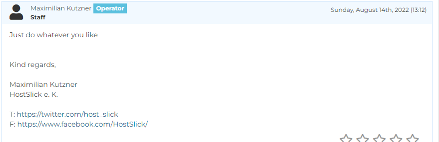 前几天我们介绍了HostSlick的一个促销活动,年付19.99欧,老杨也随便买了一台进行测试。结果测试完没有几天就把VPS暂停了,具体什么时候暂停的也不知道,没有收到邮件。我敢确认这台VPS我拿到手后测试完成就没有动过。于是提交工单,回复说是被人投诉有滥用形为,我告诉他我们仅仅是为了测试,商家回复说我使用的机器,有扫描和爆破等形为,说我们可能在撒谎或是VPS被黑了。而且不可能退款,最后给我解除暂停,重装系统。我以为事情到这里就结束了,没想到今天查看VPS又发现不能使用了,登录控制面板是正常状态,重装系统后也PING不通。很显然他们在后台搞鬼,我再次提交工单,回复说因为滥用投诉而取消了服务。下面是工单原文,请忽略我的英文水平。