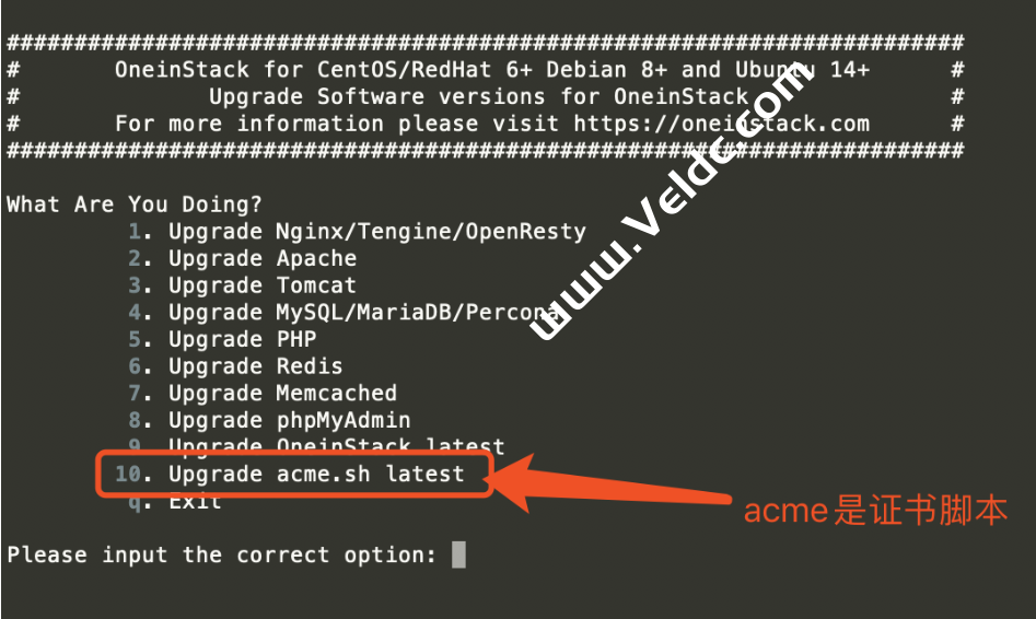 首先将以下 oneinstack 脚本输入 SSH,升级脚本,选择要升级的项目,比如更新SSL证书,选择10,确认即可。