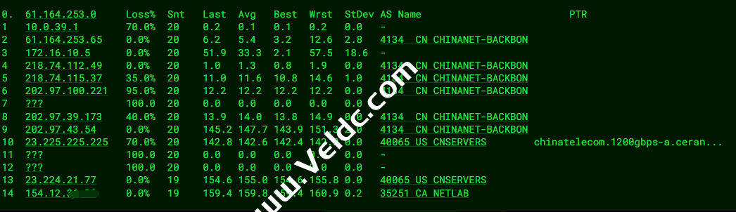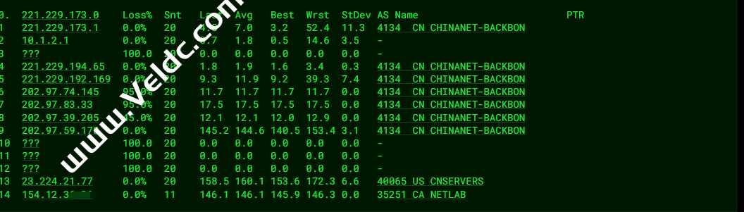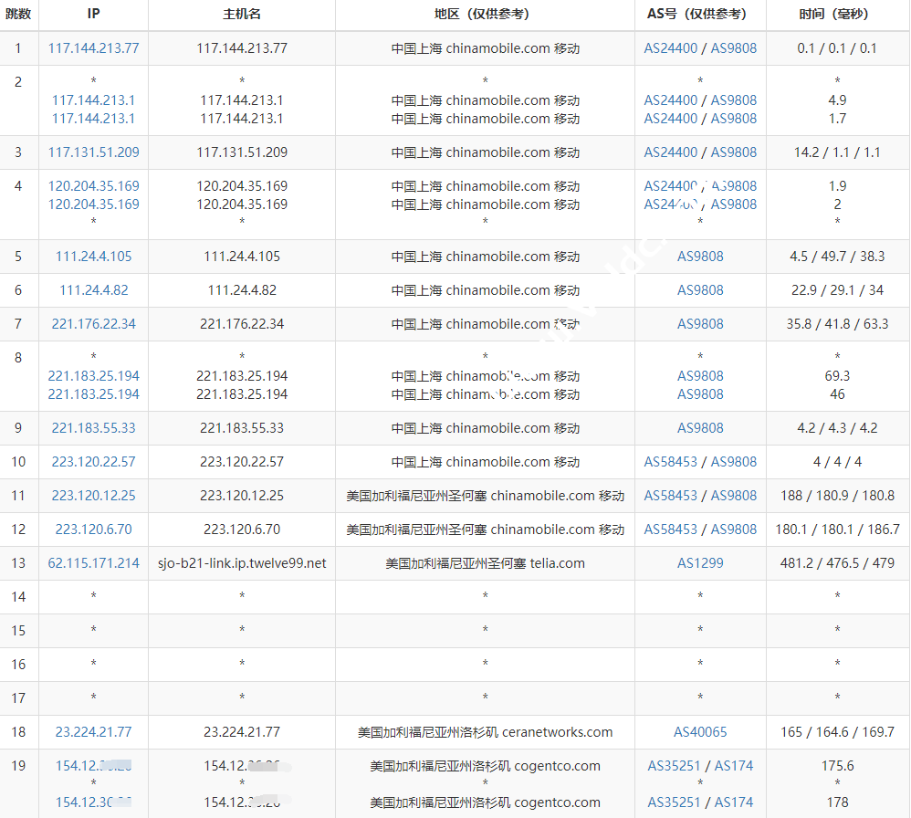 [Info] 测试路由 到 上海电信(天翼云) 中 ... traceroute to 101.227.255.45 (101.227.255.45), 30 hops max, 32 byte packets 1 _gateway (10.0.62.1) 1.00 ms * LAN Address 2 154.12.36.254 1.53 ms AS35251 United States, California, Los Angeles, cogentco.com 3 23.224.21.76 0.83 ms AS40065 United States, California, Los Angeles, ceranetworks.com 4 * 5 192.168.101.62 1.15 ms * LAN Address 6 * 7 23.225.225.65 14.04 ms AS40065 United States, California, Los Angeles, ceranetworks.com 8 219.158.116.237 171.74 ms AS4837 China, Shanghai, ChinaUnicom 9 219.158.113.134 176.44 ms AS4837 China, Shanghai, ChinaUnicom 10 219.158.113.101 169.74 ms AS4837 China, Shanghai, ChinaUnicom 11 * 12 202.97.81.45 142.94 ms AS4134 China, Shanghai, ChinaTelecom 13 * 14 61.152.25.121 146.14 ms AS4812 China, Shanghai, ChinaTelecom 15 * 16 * 17 * 18 * 19 * 20 * 21 * 22 * 23 * 24 * 25 * 26 * 27 * 28 * 29 * 30 * [Info] 测试路由 到 上海电信(天翼云) 完成 ! [Info] 测试路由 到 厦门电信CN2 中 ... traceroute to 117.28.254.129 (117.28.254.129), 30 hops max, 32 byte packets 1 _gateway (10.0.62.1) 0.34 ms * LAN Address 2 154.12.36.254 1.58 ms AS35251 United States, California, Los Angeles, cogentco.com 3 23.224.21.76 1.26 ms AS40065 United States, California, Los Angeles, ceranetworks.com 4 * 5 * 6 * 7 23.225.225.65 16.05 ms AS40065 United States, California, Los Angeles, ceranetworks.com 8 219.158.97.177 183.35 ms AS4837 China, Shanghai, ChinaUnicom 9 219.158.113.118 179.94 ms AS4837 China, Shanghai, ChinaUnicom 10 219.158.113.101 179.11 ms AS4837 China, Shanghai, ChinaUnicom 11 * 12 * 13 59.43.17.205 158.23 ms * China, Shanghai, ChinaTelecom 14 59.43.138.186 182.02 ms * China, Fujian, ChinaTelecom 15 110.80.128.86 198.40 ms AS133775 China, Fujian, Xiamen, ChinaTelecom 16 27.159.81.202 183.43 ms AS133775 China, Fujian, Xiamen, ChinaTelecom 17 * 18 * 19 117.28.254.129 188.54 ms AS4809 China, Fujian, Xiamen, ChinaTelecom [Info] 测试路由 到 厦门电信CN2 完成 ! [Info] 测试路由 到 浙江杭州联通 中 ... traceroute to 101.71.241.238 (101.71.241.238), 30 hops max, 32 byte packets 1 _gateway (10.0.62.1) 1.39 ms * LAN Address 2 154.12.36.254 1.95 ms AS35251 United States, California, Los Angeles, cogentco.com 3 23.224.21.76 0.60 ms AS40065 United States, California, Los Angeles, ceranetworks.com 4 * 5 * 6 * 7 23.225.225.65 13.56 ms AS40065 United States, California, Los Angeles, ceranetworks.com 8 219.158.116.245 157.90 ms AS4837 China, Shanghai, ChinaUnicom 9 219.158.8.189 161.91 ms AS4837 China, Shanghai, ChinaUnicom 10 219.158.7.125 167.81 ms AS4837 China, Shanghai, ChinaUnicom 11 219.158.106.122 167.61 ms AS4837 China, Zhejiang, Hangzhou, ChinaUnicom 12 * 13 * 14 * 15 * 16 * 17 * 18 * 19 * 20 * 21 * 22 * 23 * 24 * 25 * 26 * 27 * 28 * 29 * 30 * [Info] 测试路由 到 浙江杭州联通 完成 ! [Info] 测试路由 到 浙江杭州移动 中 ... traceroute to 112.17.0.106 (112.17.0.106), 30 hops max, 32 byte packets 1 _gateway (10.0.62.1) 1.47 ms * LAN Address 2 154.12.36.254 1.67 ms AS35251 United States, California, Los Angeles, cogentco.com 3 * 4 * 5 * 6 * 7 23.225.225.65 10.11 ms AS40065 United States, California, Los Angeles, ceranetworks.com 8 219.158.97.181 165.50 ms AS4837 China, Shanghai, ChinaUnicom 9 219.158.8.173 167.05 ms AS4837 China, Shanghai, ChinaUnicom 10 219.158.7.133 162.60 ms AS4837 China, Shanghai, ChinaUnicom 11 219.158.15.206 168.90 ms AS4837 China, Zhejiang, Hangzhou, ChinaUnicom 12 * 13 * 14 221.183.95.125 267.68 ms AS9808 China, Zhejiang, Hangzhou, ChinaMobile 15 * 16 * 17 * 18 * 19 * 20 * 21 * 22 * 23 * 24 * 25 * 26 * 27 * 28 * 29 * 30 * [Info] 测试路由 到 浙江杭州移动 完成 ! [Info] 测试路由 到 北京教育网 中 ... traceroute to 202.205.6.30 (202.205.6.30), 30 hops max, 32 byte packets 1 _gateway (10.0.62.1) 0.38 ms * LAN Address 2 154.12.36.254 2.01 ms AS35251 United States, California, Los Angeles, cogentco.com 3 23.224.21.76 0.65 ms AS40065 United States, California, Los Angeles, ceranetworks.com 4 * 5 * 6 * 7 23.225.225.65 17.42 ms AS40065 United States, California, Los Angeles, ceranetworks.com 8 219.158.6.5 167.87 ms AS4837 China, Shanghai, ChinaUnicom 9 219.158.6.157 175.60 ms AS4837 China, Shanghai, ChinaUnicom 10 * 11 219.158.9.98 169.65 ms AS4837 China, Shanghai, ChinaUnicom 12 219.158.44.86 181.19 ms AS4837 China, Shanghai, ChinaUnicom 13 101.4.118.41 174.10 ms AS4538 China, Shanghai, CHINAEDU 14 101.4.117.30 174.11 ms AS4538 China, Beijing, CHINAEDU 15 101.4.116.118 174.22 ms AS4538 China, Beijing, CHINAEDU 16 101.4.112.69 190.22 ms AS4538 China, Beijing, CHINAEDU 17 101.4.113.110 173.25 ms AS4538 China, Beijing, CHINAEDU 18 219.224.102.230 174.31 ms AS4538 China, Beijing, CHINAEDU 19 * 20 * 21 * 22 * 23 * 24 * 25 * 26 101.4.130.53 175.02 ms AS4538 China, Beijing, CHINAEDU 27 * 28 * 29 * 30 * [Info] 测试路由 到 北京教育网 完成 ! [Info] 四网路由快速测试 已完成 !