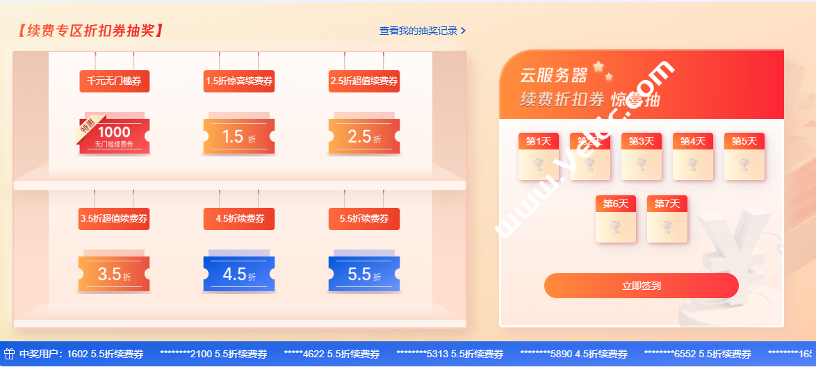 活动期间连续签到7天,即可抽取超值云服务器续费折扣,最高赢1000元无门槛续费券