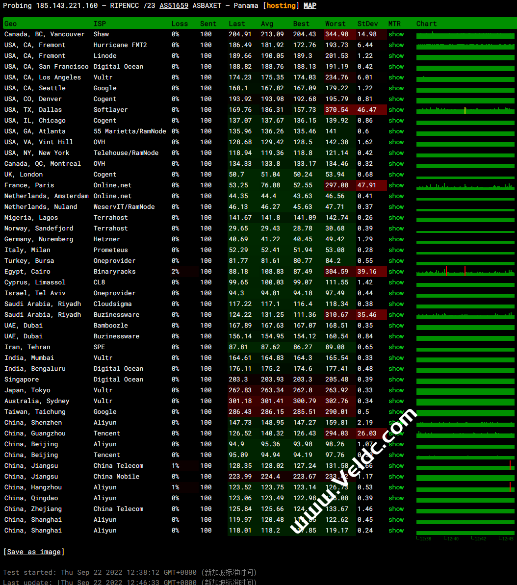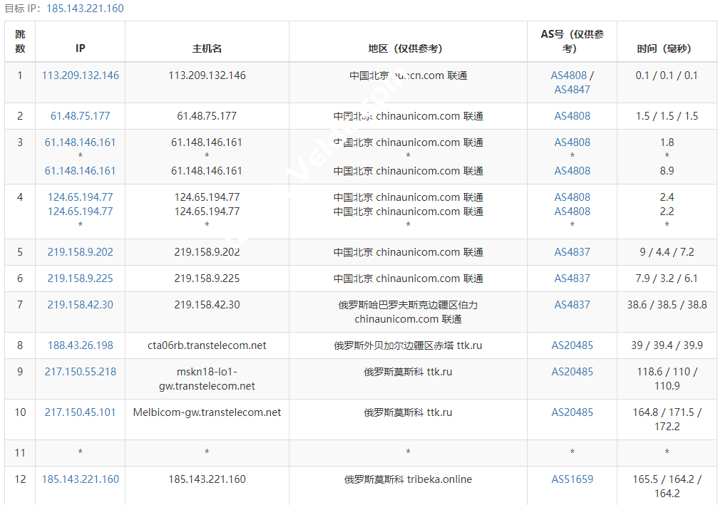 [Info] 测试路由 到 上海电信(天翼云) 中 ... traceroute to 101.227.255.45 (101.227.255.45), 30 hops max, 32 byte packets 1 185.143.220.1 1.79 ms AS51659 Russian Federation, Moscow, tribeka.online 2 * 3 * 4 145.14.89.1 1.39 ms * Russian Federation, Moscow, cteurope.net 5 59.43.246.121 70.49 ms * China, ChinaTelecom 6 59.43.184.97 134.91 ms * China, Beijing, ChinaTelecom 7 59.43.182.226 158.58 ms * China, Shanghai, ChinaTelecom 8 * 9 * 10 * 11 61.152.25.73 167.07 ms AS4812 China, Shanghai, ChinaTelecom 12 * 13 * 14 * 15 * 16 * 17 * 18 * 19 * 20 * 21 * 22 * 23 * 24 * 25 * 26 * 27 * 28 * 29 * 30 * [Info] 测试路由 到 上海电信(天翼云) 完成 ! [Info] 测试路由 到 厦门电信CN2 中 ... traceroute to 117.28.254.129 (117.28.254.129), 30 hops max, 32 byte packets 1 185.143.220.1 0.53 ms AS51659 Russian Federation, Moscow, tribeka.online 2 * 3 * 4 145.14.89.1 1.43 ms * Russian Federation, Moscow, cteurope.net 5 59.43.246.121 70.21 ms * China, ChinaTelecom 6 59.43.184.97 134.03 ms * China, Beijing, ChinaTelecom 7 * 8 59.43.131.253 144.08 ms * China, Beijing, ChinaTelecom 9 59.43.46.70 169.33 ms * China, Guangdong, Guangzhou, ChinaTelecom 10 59.43.140.34 181.61 ms * China, Fujian, ChinaTelecom 11 110.80.128.94 181.66 ms AS133775 China, Fujian, Xiamen, ChinaTelecom 12 27.148.195.94 181.97 ms AS133775 China, Fujian, Xiamen, ChinaTelecom 13 * 14 * 15 117.28.254.129 195.78 ms AS4809 China, Fujian, Xiamen, ChinaTelecom [Info] 测试路由 到 厦门电信CN2 完成 ! [Info] 测试路由 到 浙江杭州联通 中 ... traceroute to 101.71.241.238 (101.71.241.238), 30 hops max, 32 byte packets 1 185.143.220.1 6.36 ms AS51659 Russian Federation, Moscow, tribeka.online 2 * 3 * 4 145.14.89.1 1.30 ms * Russian Federation, Moscow, cteurope.net 5 59.43.246.121 69.91 ms * China, ChinaTelecom 6 59.43.184.93 126.27 ms * China, Beijing, ChinaTelecom 7 59.43.182.226 150.83 ms * China, Shanghai, ChinaTelecom 8 * 9 202.97.90.58 151.92 ms AS4134 China, Shanghai, ChinaTelecom 10 * 11 202.97.102.62 146.98 ms AS4134 China, Zhejiang, Hangzhou, ChinaTelecom 12 * 13 * 14 219.158.100.125 155.39 ms AS4837 China, Zhejiang, Hangzhou, ChinaUnicom 15 * 16 * 17 * 18 * 19 * 20 * 21 * 22 * 23 * 24 * 25 * 26 * 27 * 28 * 29 * 30 * [Info] 测试路由 到 浙江杭州联通 完成 ! [Info] 测试路由 到 浙江杭州移动 中 ... traceroute to 112.17.0.106 (112.17.0.106), 30 hops max, 32 byte packets 1 185.143.220.1 0.74 ms AS51659 Russian Federation, Moscow, tribeka.online 2 * 3 * 4 145.14.89.1 2.68 ms * Russian Federation, Moscow, cteurope.net 5 59.43.246.121 70.80 ms * China, ChinaTelecom 6 59.43.184.97 133.99 ms * China, Beijing, ChinaTelecom 7 59.43.182.226 159.55 ms * China, Shanghai, ChinaTelecom 8 * 9 202.97.90.34 162.74 ms AS4134 China, Shanghai, ChinaTelecom 10 202.97.50.173 166.64 ms AS4134 China, Shanghai, ChinaTelecom 11 * 12 * 13 221.183.54.209 224.25 ms AS9808 China, Zhejiang, Hangzhou, ChinaMobile 14 221.183.94.137 220.25 ms AS9808 China, Zhejiang, Hangzhou, ChinaMobile 15 * 16 * 17 * 18 * 19 * 20 * 21 * 22 * 23 * 24 * 25 * 26 * 27 * 28 * 29 * 30 * [Info] 测试路由 到 浙江杭州移动 完成 ! [Info] 测试路由 到 北京教育网 中 ... traceroute to 202.205.6.30 (202.205.6.30), 30 hops max, 32 byte packets 1 185.143.220.1 0.52 ms AS51659 Russian Federation, Moscow, tribeka.online 2 * 3 * 4 145.14.89.1 1.44 ms * Russian Federation, Moscow, cteurope.net 5 59.43.246.121 69.85 ms * China, ChinaTelecom 6 59.43.184.93 248.94 ms * China, Beijing, ChinaTelecom 7 59.43.182.226 214.00 ms * China, Shanghai, ChinaTelecom 8 * 9 * 10 202.97.57.150 147.69 ms AS4134 China, Shanghai, ChinaTelecom 11 202.97.87.130 145.95 ms AS4134 China, Shanghai, ChinaTelecom 12 202.97.19.14 205.86 ms AS4134 China, Shanghai, ChinaTelecom 13 101.4.117.30 246.47 ms AS4538 China, Beijing, CHINAEDU 14 * 15 101.4.112.69 205.71 ms AS4538 China, Beijing, CHINAEDU 16 * 17 219.224.102.230 207.65 ms AS4538 China, Beijing, CHINAEDU 18 * 19 * 20 * 21 101.4.130.53 206.95 ms AS4538 China, Beijing, CHINAEDU 22 * 23 * 24 * 25 * 26 * 27 101.4.130.53 206.99 ms AS4538 China, Beijing, CHINAEDU 28 * 29 * 30 * [Info] 测试路由 到 北京教育网 完成 ! [Info] 四网路由快速测试 已完成 !