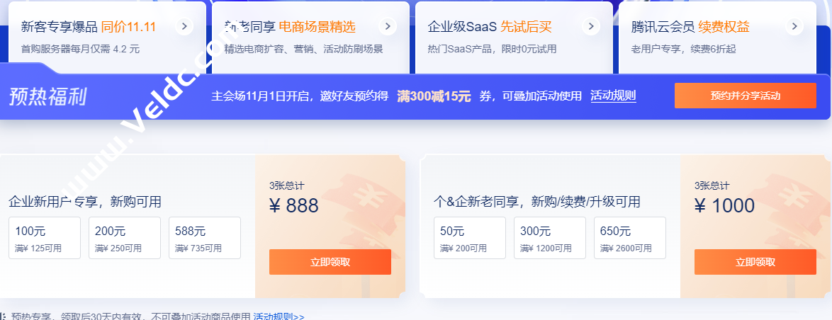 眼看一年一度的双11又将临近,各大商家优惠预热也在陆续推出,这不腾讯云近日就推出了11.11云上盛惠活动:预热专享,免费领取1888元代金券礼包,领取后30天内有效,不可叠加活动商品使用;轻量云服务器2核2G4M低至0.8折,年付50元起,月付约4.17元。还有更多的爆品提前购,低至1折起;云产品助力备战双十一!买即送 最长免费再续3个月,或享买2核送4核、买4核送8核。有兴趣的朋友可以关注一下。