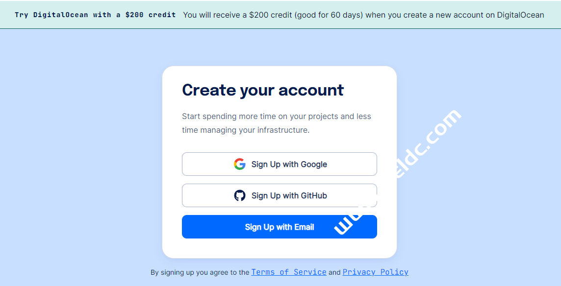 我们注册前需要准备好双币信用卡或者是PAYPAL,以及一个未曾注册用过的邮箱。官方标注”Free credit active: Get started on DigitalOcean with a $200, 60-day credit for new users. “点击 Sign UP准备注册。