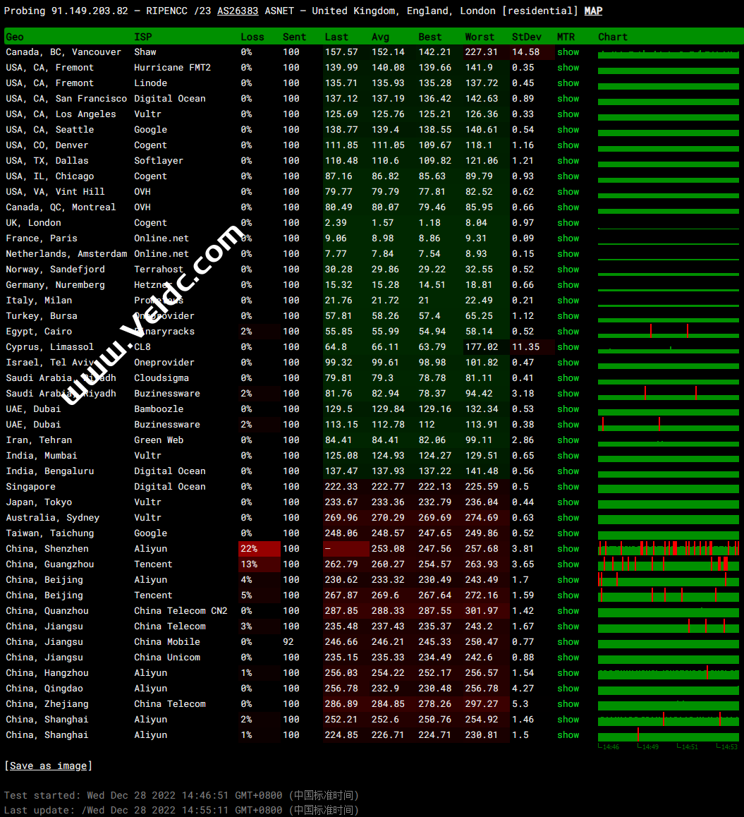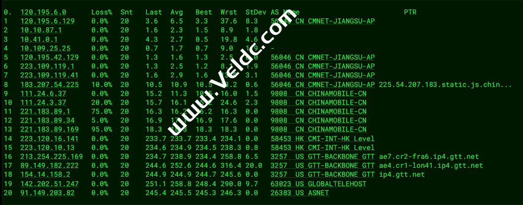 ---------------------------------------------------------------------- 广州电信 traceroute to 14.215.116.1 (14.215.116.1), 30 hops max, 32 byte packets 1 91.149.202.1 1.91 ms AS26383 英国, 伦敦, baxetgroup.com 2 142.202.51.246 0.24 ms AS63023 英国, 伦敦, gthost.com 3 ae5.cr2-lon41.ip4.gtt.net (154.14.25.97) 0.33 ms AS3257 英国, 伦敦, gtt.net 4 ae0.cr10-lon2.ip4.gtt.net (89.149.128.98) 16.47 ms AS3257 英国, 伦敦, gtt.net 5 ip4.gtt.net (154.14.42.210) 2.01 ms AS3257 英国, 伦敦, gtt.net 6 * 7 202.97.91.193 256.57 ms AS4134 中国, 广东, 广州, chinatelecom.com.cn, 电信 8 202.97.94.137 259.98 ms AS4134 中国, 广东, 广州, chinatelecom.com.cn, 电信 9 * 10 183.2.145.218 259.07 ms AS4134 中国, 广东, 广州, chinatelecom.com.cn, 电信 11 183.56.128.10 260.05 ms AS4134 中国, 广东, 广州, chinatelecom.com.cn, 电信 12 14.215.116.1 332.37 ms AS4134 中国, 广东, 广州, chinatelecom.com.cn, 电信 ---------------------------------------------------------------------- 上海电信 traceroute to 202.96.209.133 (202.96.209.133), 30 hops max, 32 byte packets 1 91.149.202.1 6.21 ms AS26383 英国, 伦敦, baxetgroup.com 2 142.202.51.246 0.52 ms AS63023 英国, 伦敦, gthost.com 3 ae5.cr2-lon41.ip4.gtt.net (154.14.25.97) 0.34 ms AS3257 英国, 伦敦, gtt.net 4 ae0.cr10-lon2.ip4.gtt.net (89.149.128.98) 1.50 ms AS3257 英国, 伦敦, gtt.net 5 ip4.gtt.net (154.14.42.210) 2.03 ms AS3257 英国, 伦敦, gtt.net 6 * 7 * 8 202.97.57.26 263.28 ms AS4134 中国, 上海, chinatelecom.com.cn, 电信 9 * 10 * 11 * 12 * 13 * 14 * 15 * 16 * 17 * 18 * 19 * 20 * 21 * 22 * 23 * 24 * 25 * 26 * 27 * 28 * 29 * 30 * ---------------------------------------------------------------------- 厦门电信 traceroute to 117.28.254.129 (117.28.254.129), 30 hops max, 32 byte packets 1 91.149.202.1 5.63 ms AS26383 英国, 伦敦, baxetgroup.com 2 142.202.51.246 0.40 ms AS63023 英国, 伦敦, gthost.com 3 ae5.cr2-lon41.ip4.gtt.net (154.14.25.97) 2.64 ms AS3257 英国, 伦敦, gtt.net 4 ae0.cr12-lon1.ip4.gtt.net (141.136.107.2) 12.97 ms AS3257 英国, 伦敦, gtt.net 5 ae-11.edge7.London1.Level3.net (4.68.72.201) 3.71 ms AS3356 英国, 伦敦, level3.com 6 * 7 CHINA-TELEC.ear1.London15.Level3.net (212.187.165.22) 1.26 ms AS3356 英国, 伦敦, level3.com 8 59.43.250.1 263.67 ms * 中国, 上海, chinatelecom.com.cn, 电信 9 * 10 59.43.130.209 258.86 ms * 中国, 上海, chinatelecom.com.cn, 电信 11 59.43.138.186 284.26 ms * 中国, 福建, chinatelecom.com.cn, 电信 12 110.80.128.94 289.73 ms AS133775 中国, 福建, 厦门, chinatelecom.com.cn, 电信 13 * 14 * 15 * 16 117.28.254.129 289.28 ms AS4809 中国, 福建, 厦门, chinatelecom.com.cn, 电信 ---------------------------------------------------------------------- 重庆联通 traceroute to 113.207.25.138 (113.207.25.138), 30 hops max, 32 byte packets 1 91.149.202.1 0.61 ms AS26383 英国, 伦敦, baxetgroup.com 2 142.202.51.246 2.54 ms AS63023 英国, 伦敦, gthost.com 3 ip4.gtt.net (154.14.158.1) 11.81 ms AS3257 英国, 伦敦, gtt.net 4 ae22.cr2-fra6.ip4.gtt.net (213.200.117.138) 11.53 ms AS3257 德国, 黑森州, 法兰克福, gtt.net 5 219.158.43.189 230.73 ms AS4837 德国, 黑森州, 法兰克福, chinaunicom.com, 联通 6 219.158.20.165 233.35 ms AS4837 中国, 广东, 广州, chinaunicom.com, 联通 7 219.158.4.41 231.58 ms AS4837 中国, 广东, 广州, chinaunicom.com, 联通 8 219.158.3.17 227.05 ms AS4837 中国, 广东, 广州, chinaunicom.com, 联通 9 219.158.22.74 245.84 ms AS4837 中国, 重庆, chinaunicom.com, 联通 10 * 11 * 12 * 13 * 14 * 15 * 16 * 17 * 18 * 19 * 20 * 21 * 22 * 23 * 24 * 25 * 26 * 27 * 28 * 29 * 30 * ---------------------------------------------------------------------- 成都联通 traceroute to 119.6.6.6 (119.6.6.6), 30 hops max, 32 byte packets 1 91.149.202.1 1.51 ms AS26383 英国, 伦敦, baxetgroup.com 2 142.202.51.246 0.23 ms AS63023 英国, 伦敦, gthost.com 3 ip4.gtt.net (154.14.158.1) 0.34 ms AS3257 英国, 伦敦, gtt.net 4 ae22.cr2-fra6.ip4.gtt.net (213.200.117.138) 11.53 ms AS3257 德国, 黑森州, 法兰克福, gtt.net 5 219.158.43.189 230.80 ms AS4837 德国, 黑森州, 法兰克福, chinaunicom.com, 联通 6 219.158.3.245 233.18 ms AS4837 中国, 广东, 广州, chinaunicom.com, 联通 7 219.158.4.125 228.22 ms AS4837 中国, 广东, 广州, chinaunicom.com, 联通 8 219.158.3.85 219.54 ms AS4837 中国, 广东, 广州, chinaunicom.com, 联通 9 * 10 119.6.197.150 255.54 ms AS4837 中国, 四川, 成都, chinaunicom.com, 联通 11 119.6.195.34 245.10 ms AS4837 中国, 四川, 成都, chinaunicom.com, 联通 12 * 13 * 14 * 15 * 16 * 17 * 18 * 19 * 20 * 21 * 22 * 23 * 24 * 25 * 26 * 27 * 28 * 29 * 30 * ---------------------------------------------------------------------- 上海移动 traceroute to 120.204.197.126 (120.204.197.126), 30 hops max, 32 byte packets 1 91.149.202.1 4.54 ms AS26383 英国, 伦敦, baxetgroup.com 2 142.202.51.246 0.25 ms AS63023 英国, 伦敦, gthost.com 3 ip4.gtt.net (154.14.158.1) 0.29 ms AS3257 英国, 伦敦, gtt.net 4 ae18.cr11-lon2.ip4.gtt.net (89.149.141.213) 0.86 ms AS3257 英国, 伦敦, gtt.net 5 ldn-b2-link.ip.twelve99.net (62.115.47.218) 1.39 ms AS1299 英国, 伦敦, telia.com 6 ldn-bb1-link.ip.twelve99.net (62.115.122.188) 1.04 ms AS1299 英国, 伦敦, telia.com 7 slou-b2-link.ip.twelve99.net (62.115.112.63) 1.99 ms AS1299 英国, 伯克郡, 斯劳, telia.com 8 chinamobile-ic342125-slou-b1.ip.twelve99-cust.net (62.115.171.223) 13.69 ms AS1299 英国, 伯克郡, 斯劳, telia.com 9 223.120.10.201 12.42 ms AS58453 英国, 伦敦, chinamobile.com, 移动 10 223.120.15.90 344.38 ms AS58453 中国, 上海, chinamobile.com, 移动 11 221.183.89.178 333.66 ms AS9808 中国, 上海, chinamobile.com, 移动 12 221.183.89.33 357.71 ms AS9808 中国, 上海, chinamobile.com, 移动 13 * 14 * 15 120.204.194.10 352.29 ms AS9808 中国, 上海, chinamobile.com, 移动 16 120.204.197.126 335.25 ms AS9808 中国, 上海, chinamobile.com, 移
