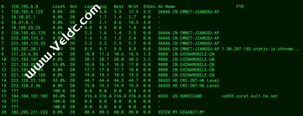 ---------------------------------------------------------------------- 广州电信 traceroute to 14.215.116.1 (14.215.116.1), 30 hops max, 32 byte packets 1 * 2 * 3 121.59.124.21 44.60 ms AS23764 新加坡, chinatelecom.com.cn, 电信 4 69.194.166.17 44.80 ms AS23764 新加坡, chinatelecom.com.cn, 电信 5 CN.HKG.CTGNet (69.194.166.89) 46.81 ms AS23764 中国, 香港, chinatelecom.com.cn, 电信 6 203.22.178.90 49.95 ms * 中国, 香港, chinatelecom.com.cn, 电信 7 * 8 59.43.16.165 55.29 ms * 中国, 广东, 广州, chinatelecom.com.cn, 电信 9 * 10 * 11 183.2.167.237 194.59 ms AS4134 中国, 广东, 广州, chinatelecom.com.cn, 电信 12 183.56.129.10 189.13 ms AS4134 中国, 广东, 广州, chinatelecom.com.cn, 电信 13 14.215.116.1 196.16 ms AS4134 中国, 广东, 广州, chinatelecom.com.cn, 电信 ---------------------------------------------------------------------- 上海电信 traceroute to 202.96.209.133 (202.96.209.133), 30 hops max, 32 byte packets 1 * 2 * 3 121.59.124.21 45.96 ms AS23764 新加坡, chinatelecom.com.cn, 电信 4 69.194.165.245 8.76 ms AS23764 新加坡, chinatelecom.com.cn, 电信 5 69.194.186.85 43.95 ms * 美国, 路易斯安那州, conterra.com 6 * 7 * 8 * 9 101.95.88.206 192.89 ms AS4812 中国, 上海, chinatelecom.com.cn, 电信 10 * 11 * 12 * 13 * 14 * 15 * 16 * 17 * 18 * 19 * 20 * 21 * 22 * 23 * 24 * 25 * 26 * 27 * 28 * 29 * 30 * ---------------------------------------------------------------------- 厦门电信 traceroute to 117.28.254.129 (117.28.254.129), 30 hops max, 32 byte packets 1 * 2 * 3 121.59.124.21 44.37 ms AS23764 新加坡, chinatelecom.com.cn, 电信 4 69.194.166.77 44.57 ms AS23764 新加坡, chinatelecom.com.cn, 电信 5 69.194.166.193 44.77 ms AS23764 中国, 香港, chinatelecom.com.cn, 电信 6 * 7 * 8 59.43.159.17 75.71 ms * 中国, 上海, chinatelecom.com.cn, 电信 9 59.43.138.186 72.94 ms * 中国, 福建, chinatelecom.com.cn, 电信 10 * 11 27.159.81.214 218.27 ms AS133775 中国, 福建, 厦门, chinatelecom.com.cn, 电信 12 * 13 * 14 117.28.254.129 79.92 ms AS4809 中国, 福建, 厦门, chinatelecom.com.cn, 电信 ---------------------------------------------------------------------- 重庆联通 traceroute to 113.207.25.138 (113.207.25.138), 30 hops max, 32 byte packets 1 * 2 * 3 202.77.19.169 42.18 ms AS10099 中国, 香港, chinaunicom.com, 联通 4 202.77.18.194 48.86 ms AS10099 中国, 香港, chinaunicom.com, 联通 5 43.252.86.129 103.39 ms AS10099 中国, 香港, chinaunicom.com, 联通 6 219.158.10.49 98.98 ms AS4837 中国, 广东, 广州, chinaunicom.com, 联通 7 219.158.24.137 99.47 ms AS4837 中国, 广东, 广州, chinaunicom.com, 联通 8 219.158.8.113 95.59 ms AS4837 中国, 广东, 广州, chinaunicom.com, 联通 9 219.158.22.74 111.21 ms AS4837 中国, 重庆, chinaunicom.com, 联通 10 * 11 * 12 * 13 * 14 * 15 * 16 * 17 * 18 * 19 * 20 * 21 * 22 * 23 * 24 * 25 * 26 * 27 * 28 * 29 * 30 * ---------------------------------------------------------------------- 成都联通 traceroute to 119.6.6.6 (119.6.6.6), 30 hops max, 32 byte packets 1 * 2 * 3 202.77.19.169 42.06 ms AS10099 中国, 香港, chinaunicom.com, 联通 4 202.77.18.194 44.36 ms AS10099 中国, 香港, chinaunicom.com, 联通 5 202.77.23.25 99.35 ms AS10099 中国, 香港, chinaunicom.com, 联通 6 219.158.20.97 92.50 ms AS4837 中国, 香港, chinaunicom.com, 联通 7 219.158.4.33 92.36 ms AS4837 中国, 广东, 广州, chinaunicom.com, 联通 8 * 9 * 10 119.6.197.150 106.99 ms AS4837 中国, 四川, 成都, chinaunicom.com, 联通 11 119.6.195.38 120.95 ms AS4837 中国, 四川, 成都, chinaunicom.com, 联通 12 * 13 * 14 * 15 * 16 * 17 * 18 * 19 * 20 * 21 * 22 * 23 * 24 * 25 * 26 * 27 * 28 * 29 * 30 * ---------------------------------------------------------------------- 上海移动 traceroute to 120.204.197.126 (120.204.197.126), 30 hops max, 32 byte packets 1 * 2 * 3 103.106.248.5 39.96 ms * 马来西亚, 1maxhosting.com 4 223.118.2.177 42.52 ms AS58453 中国, 香港, chinamobile.com, 移动 5 223.120.22.110 65.69 ms AS58453 中国, 上海, chinamobile.com, 移动 6 221.183.89.170 69.32 ms AS9808 中国, 上海, chinamobile.com, 移动 7 221.183.89.33 68.73 ms AS9808 中国, 上海, chinamobile.com, 移动 8 * 9 * 10 120.204.194.10 74.45 ms AS9808 中国, 上海, chinamobile.com, 移动 11 120.204.197.126 73.80 ms AS9808 中国, 上海, chinamobile.com, 移动 ---------------------------------------------------------------------- 成都移动 traceroute to 183.221.253.100 (183.221.253.100), 30 hops max, 32 byte packets 1 * 2 * 3 103.106.248.5 39.86 ms * 马来西亚, 1maxhosting.com 4 223.118.2.177 44.51 ms AS58453 中国, 香港, chinamobile.com, 移动 5 223.120.22.106 65.16 ms AS58453 中国, 上海, chinamobile.com, 移动 6 221.183.89.170 68.88 ms AS9808 中国, 上海, chinamobile.com, 移动 7 221.183.89.69 71.28 ms AS9808 中国, 上海, chinamobile.com, 移动 8 221.183.89.10 67.50 ms AS9808 中国, 上海, chinamobile.com, 移动 9 * 10 221.183.46.178 92.64 ms AS9808 中国, 北京, chinamobile.com, 移动 11 * 12 * 13 * 14 * 15 * 16 * 17 * 18 * 19 * 20 * 21 * 22 * 23 * 24 * 25 * 26 * 27 * 28 * 29 * 30 * ---------------------------------------------------------------------- 广东移动 traceroute to 211.139.145.129 (211.139.145.129), 30 hops max, 32 byte packets 1 * 2 * 3 103.106.248.5 41.15 ms * 马来西亚, 1maxhosting.com 4 223.118.2.177 42.69 ms AS58453 中国, 香港, chinamobile.com, 移动 5 * 6 * 7 * 8 221.176.24.101 49.30 ms AS9808 中国, 广东, 广州, chinamobile.com, 移动 9 111.24.5.185 68.35 ms AS9808 中国, 广东, 广州, chinamobile.com, 移动 10 111.24.5.30 53.53 ms AS9808 中国, 广东, 广州, chinamobile.com, 移动 11 211.136.249.134 53.45 ms AS56040 中国, 广东, 深圳, chinamobile.com, 移动 12 211.136.208.38 56.09 ms AS56040 中国, 广东, 广州, chinamobile.com, 移动 13 * 14 120.198.26.254 63.76 ms AS56040 中国, 广东, 惠州, chinamobile.com, 移动 15 * 16 * 17 211.139.145.12