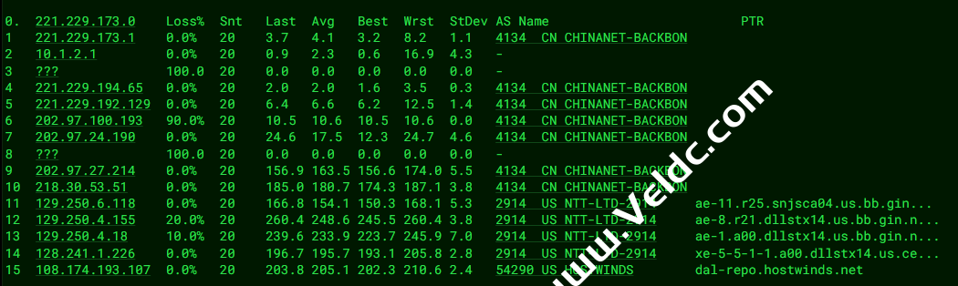 ---------------------------------------------------------------------- 广州电信 traceroute to 14.215.116.1 (14.215.116.1), 30 hops max, 32 byte packets 1 10.5.0.1 0.42 ms * 局域网 2 te0-5-0-5-9.ccr41.dfw03.atlas.cogentco.com (38.140.105.65) 1.02 ms AS174 美国, 德克萨斯州, 达拉斯, cogentco.com 3 be2764.ccr32.dfw01.atlas.cogentco.com (154.54.47.213) 1.36 ms AS174 美国, 德克萨斯州, 达拉斯, cogentco.com 4 be2433.ccr22.mci01.atlas.cogentco.com (154.54.3.214) 10.88 ms AS174 美国, 密苏里州, 堪萨斯城, cogentco.com 5 be3035.ccr21.den01.atlas.cogentco.com (154.54.5.89) 22.50 ms AS174 美国, 科罗拉多州, 丹佛, cogentco.com 6 be3038.ccr32.slc01.atlas.cogentco.com (154.54.42.97) 32.64 ms AS174 美国, 犹他州, 盐湖城, cogentco.com 7 be3109.ccr21.sfo01.atlas.cogentco.com (154.54.44.137) 46.96 ms AS174 美国, 加利福尼亚州, 旧金山, cogentco.com 8 be3670.ccr41.sjc03.atlas.cogentco.com (154.54.43.14) 88.14 ms AS174 美国, 加利福尼亚州, 圣何塞, cogentco.com 9 38.104.138.106 50.32 ms AS174 美国, 加利福尼亚州, 圣何塞, cogentco.com 10 202.97.43.117 206.22 ms AS4134 中国, 广东, 广州, chinatelecom.com.cn, 电信 11 * 12 202.97.94.129 226.28 ms AS4134 中国, 广东, 广州, chinatelecom.com.cn, 电信 13 * 14 113.96.4.230 214.46 ms AS4134 中国, 广东, 广州, chinatelecom.com.cn, 电信 15 121.14.50.202 216.88 ms AS4134 中国, 广东, 广州, chinatelecom.com.cn, 电信 16 14.215.116.1 234.74 ms AS4134 中国, 广东, 广州, chinatelecom.com.cn, 电信 ---------------------------------------------------------------------- 上海电信 traceroute to 202.96.209.133 (202.96.209.133), 30 hops max, 32 byte packets 1 10.5.0.1 0.35 ms * 局域网 2 te0-2-1-19.rcr51.b059724-0.dfw01.atlas.cogentco.com (38.140.119.241) 1.05 ms AS174 美国, 德克萨斯州, 达拉斯, cogentco.com 3 be2356.ccr31.dfw01.atlas.cogentco.com (154.54.47.106) 1.29 ms AS174 美国, 德克萨斯州, 达拉斯, cogentco.com 4 be2432.ccr21.mci01.atlas.cogentco.com (154.54.3.134) 11.04 ms AS174 美国, 密苏里州, 堪萨斯城, cogentco.com 5 be3036.ccr22.den01.atlas.cogentco.com (154.54.31.89) 22.53 ms AS174 美国, 科罗拉多州, 丹佛, cogentco.com 6 be3037.ccr21.slc01.atlas.cogentco.com (154.54.41.145) 32.96 ms AS174 美国, 犹他州, 盐湖城, cogentco.com 7 be3109.ccr21.sfo01.atlas.cogentco.com (154.54.44.137) 47.01 ms AS174 美国, 加利福尼亚州, 旧金山, cogentco.com 8 be3669.ccr41.sjc03.atlas.cogentco.com (154.54.43.10) 58.93 ms AS174 美国, 加利福尼亚州, 圣何塞, cogentco.com 9 38.104.138.106 49.95 ms AS174 美国, 加利福尼亚州, 圣何塞, cogentco.com 10 * 11 * 12 * 13 61.152.26.89 198.30 ms AS4812 中国, 上海, chinatelecom.com.cn, 电信 14 124.74.229.238 197.92 ms AS4812 中国, 上海, chinatelecom.com.cn, 电信 15 124.74.229.238 196.23 ms AS4812 中国, 上海, chinatelecom.com.cn, 电信 16 * 17 * 18 * 19 * 20 * 21 * 22 * 23 * 24 * 25 * 26 * 27 * 28 * 29 * 30 * ---------------------------------------------------------------------- 厦门电信 traceroute to 117.28.254.129 (117.28.254.129), 30 hops max, 32 byte packets 1 10.5.0.1 5.68 ms * 局域网 2 client-23-238-104-130.hostwindsdns.com (23.238.104.130) 0.32 ms AS54290 美国, 德克萨斯州, 达拉斯, hostwinds.com 3 xe-5-5-1-1.a00.dllstx14.us.bb.gin.ntt.net (128.241.1.225) 0.68 ms AS2914 美国, 德克萨斯州, 达拉斯, ntt.com 4 ae-2.r24.lsanca07.us.bb.gin.ntt.net (129.250.7.69) 30.99 ms AS2914 美国, 加利福尼亚州, 洛杉矶, ntt.com 5 ae-8.r25.lsanca07.us.bb.gin.ntt.net (129.250.3.219) 26.17 ms AS2914 美国, 加利福尼亚州, 洛杉矶, ntt.com 6 ae-8.r25.lsanca07.us.bb.gin.ntt.net (129.250.3.219) 26.97 ms AS2914 美国, 加利福尼亚州, 洛杉矶, ntt.com 7 ae-1.a01.tokyjp09.jp.bb.gin.ntt.net (129.250.7.62) 135.38 ms AS2914 日本, 东京都, 东京, ntt.com 8 ae-3.r00.tokyjp08.jp.bb.gin.ntt.net (129.250.6.129) 130.33 ms AS2914 日本, 东京都, 东京, ntt.com 9 ae-2.a00.tokyjp04.jp.bb.gin.ntt.net (129.250.2.69) 137.59 ms AS2914 日本, 东京都, 东京, ntt.com 10 59.43.186.185 163.21 ms * 中国, 上海, chinatelecom.com.cn, 电信 11 * 12 * 13 * 14 * 15 * 16 * 17 * 18 * 19 117.28.254.129 194.87 ms AS4809 中国, 福建, 厦门, chinatelecom.com.cn, 电信 ---------------------------------------------------------------------- 重庆联通 traceroute to 113.207.25.138 (113.207.25.138), 30 hops max, 32 byte packets 1 10.5.0.1 0.35 ms * 局域网 2 te0-5-0-5-9.ccr41.dfw03.atlas.cogentco.com (38.140.105.65) 1.13 ms AS174 美国, 德克萨斯州, 达拉斯, cogentco.com 3 * 4 * 5 * 6 * 7 * 8 * 9 219.158.98.173 268.59 ms AS4837 中国, 上海, chinaunicom.com, 联通 10 219.158.98.173 281.75 ms AS4837 中国, 上海, chinaunicom.com, 联通 11 219.158.8.173 287.60 ms AS4837 中国, 上海, chinaunicom.com, 联通 12 219.158.106.254 316.39 ms AS4837 中国, 重庆, chinaunicom.com, 联通 13 * 14 * 15 * 16 * 17 * 18 * 19 * 20 * 21 * 22 * 23 * 24 * 25 * 26 * 27 * 28 * 29 * 30 * ---------------------------------------------------------------------- 成都联通 traceroute to 119.6.6.6 (119.6.6.6), 30 hops max, 32 byte packets 1 10.5.0.1 4.41 ms * 局域网 2 client-23-238-104-130.hostwindsdns.com (23.238.104.130) 2.67 ms AS54290 美国, 德克萨斯州, 达拉斯, hostwinds.com 3 * 4 * 5 * 6 * 7 * 8 .55.148.204.in-addr.arpa (204.148.55.106) 265.59 ms AS701 美国, 加利福尼亚州, 圣何塞, verizon.com 9 219.158.116.237 272.71 ms AS4837 中国, 上海, chinaunicom.com, 联通 10 219.158.113.142 256.34 ms AS4837 中国, 上海, chinaunicom.com, 联通 11 * 12 * 13 219.158.107.90 260.83 ms AS4837 中国, 四川, 成都, chinaunicom.com, 联通 14 119.6.197.202 249.30 ms AS4837 中国, 四川, 成都, chinaunicom.com, 联通 15 * 16 * 17 * 18 * 19 * 20 * 21 * 22 * 23 * 24 * 25 * 26 * 27 * 28 * 29 * 30 * ---------------------------------------------------------------------- 上海移动 traceroute to 120.204.197.126 (120.204.197.126), 30 hop