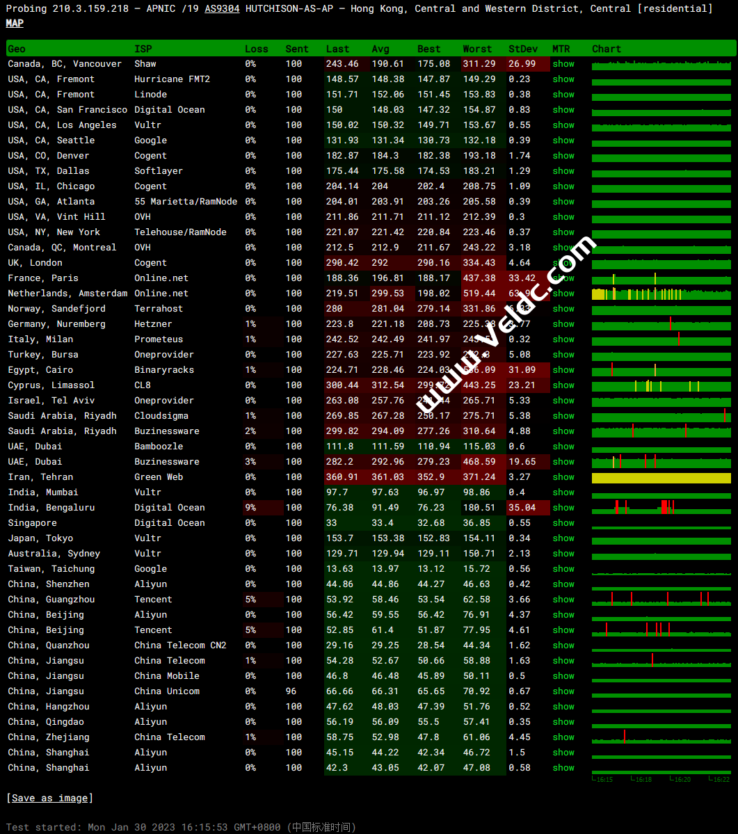 ---------------------------------------------------------------------- 广州电信 traceroute to 14.215.116.1 (14.215.116.1), 30 hops max, 32 byte packets 1 210.3.159.129 12.49 ms AS9304 中国, 香港, hgc.com.hk 2 10.30.28.77 0.52 ms * 局域网 3 10.28.21.29 0.86 ms * 局域网 4 218.188.28.66 4.40 ms AS9304 中国, 香港, hgc.com.hk 5 * 6 * 7 121.189.2.197 4.25 ms AS4766 中国, 香港, kt.com 8 112.174.89.105 65.60 ms AS4766 KT.COM 骨干网, kt.com 9 112.174.95.166 40.92 ms AS4766 韩国, 首尔, kt.com 10 * 11 202.97.93.222 94.34 ms AS4134 中国, 广东, 广州, chinatelecom.com.cn, 电信 12 202.97.94.93 102.05 ms AS4134 中国, 广东, 广州, chinatelecom.com.cn, 电信 13 * 14 * 15 58.63.249.34 98.71 ms AS4134 中国, 广东, 广州, chinatelecom.com.cn, 电信 16 183.56.128.10 92.22 ms AS4134 中国, 广东, 广州, chinatelecom.com.cn, 电信 17 * 18 * 19 * 20 * 21 * 22 * 23 * 24 * 25 * 26 * 27 * 28 * 29 * 30 * ---------------------------------------------------------------------- 上海电信 traceroute to 202.96.209.133 (202.96.209.133), 30 hops max, 32 byte packets 1 210.3.159.129 44.52 ms AS9304 中国, 香港, hgc.com.hk 2 10.30.28.77 0.57 ms * 局域网 3 10.28.21.25 1.64 ms * 局域网 4 218.188.28.73 1.46 ms AS9304 中国, 香港, hgc.com.hk 5 * 6 * 7 121.189.2.197 2.98 ms AS4766 中国, 香港, kt.com 8 112.174.89.69 32.40 ms AS4766 韩国, 首尔, kt.com 9 112.174.95.34 32.68 ms AS4766 韩国, 首尔, kt.com 10 * 11 202.97.12.42 105.15 ms AS4134 中国, 广东, 广州, chinatelecom.com.cn, 电信 12 202.97.71.249 96.57 ms AS4134 中国, 广东, 广州, chinatelecom.com.cn, 电信 13 * 14 * 15 124.74.229.230 113.71 ms AS4812 中国, 上海, chinatelecom.com.cn, 电信 16 * 17 * 18 * 19 * 20 * 21 * 22 * 23 * 24 * 25 * 26 * 27 * 28 * 29 * 30 * ---------------------------------------------------------------------- 厦门电信 traceroute to 117.28.254.129 (117.28.254.129), 30 hops max, 32 byte packets 1 210.3.159.129 3.51 ms AS9304 中国, 香港, hgc.com.hk 2 10.30.29.77 0.66 ms * 局域网 3 core.hgc.com.hk (210.0.248.28) 0.80 ms AS9304 中国, 香港, hgc.com.hk 4 * 5 218.189.99.150 1.10 ms AS9304 中国, 香港, hgc.com.hk 6 218.189.99.150 1.14 ms AS9304 中国, 香港, hgc.com.hk 7 218.188.104.218 2.24 ms AS9304 中国, 香港, hgc.com.hk 8 * 9 * 10 59.43.46.214 23.50 ms * 中国, 福建, chinatelecom.com.cn, 电信 11 110.80.128.94 48.56 ms AS133775 中国, 福建, 厦门, chinatelecom.com.cn, 电信 12 27.148.195.98 52.89 ms AS133775 中国, 福建, 厦门, chinatelecom.com.cn, 电信 13 * 14 * 15 * 16 * 17 * 18 * 19 * 20 * 21 * 22 * 23 * 24 * 25 * 26 * 27 * 28 * 29 * 30 * ---------------------------------------------------------------------- 重庆联通 traceroute to 113.207.25.138 (113.207.25.138), 30 hops max, 32 byte packets 1 210.3.159.129 3.24 ms AS9304 中国, 香港, hgc.com.hk 2 10.30.29.77 0.56 ms * 局域网 3 10.28.21.25 1.51 ms * 局域网 4 * 5 * 6 121.189.2.197 2.89 ms AS4766 中国, 香港, kt.com 7 112.174.80.157 46.95 ms AS4766 KT.COM 骨干网, kt.com 8 112.174.89.105 35.72 ms AS4766 KT.COM 骨干网, kt.com 9 219.158.40.85 58.67 ms AS4837 中国, 上海, chinaunicom.com, 联通 10 121.189.2.14 63.96 ms AS4766 KT.COM 骨干网, kt.com 11 * 12 219.158.113.105 70.74 ms AS4837 中国, 上海, chinaunicom.com, 联通 13 * 14 * 15 * 16 * 17 * 18 * 19 * 20 * 21 * 22 * 23 * 24 * 25 * 26 * 27 * 28 * 29 * 30 * ---------------------------------------------------------------------- 成都联通 traceroute to 119.6.6.6 (119.6.6.6), 30 hops max, 32 byte packets 1 210.3.159.129 3.48 ms AS9304 中国, 香港, hgc.com.hk 2 10.30.28.77 0.57 ms * 局域网 3 10.28.21.29 1.17 ms * 局域网 4 * 5 * 6 121.189.2.197 2.30 ms AS4766 中国, 香港, kt.com 7 112.174.89.105 32.49 ms AS4766 KT.COM 骨干网, kt.com 8 112.174.95.30 39.68 ms AS4766 韩国, 首尔, kt.com 9 121.189.2.14 72.27 ms AS4766 KT.COM 骨干网, kt.com 10 121.189.2.14 70.41 ms AS4766 KT.COM 骨干网, kt.com 11 219.158.19.78 60.38 ms AS4837 中国, 上海, chinaunicom.com, 联通 12 219.158.110.206 122.88 ms AS4837 中国, 四川, 成都, chinaunicom.com, 联通 13 119.6.197.166 100.75 ms AS4837 中国, 四川, 成都, chinaunicom.com, 联通 14 119.6.195.34 99.14 ms AS4837 中国, 四川, 成都, chinaunicom.com, 联通 15 119.6.195.34 97.24 ms AS4837 中国, 四川, 成都, chinaunicom.com, 联通 16 * 17 * 18 * 19 * 20 * 21 * 22 * 23 * 24 * 25 * 26 * 27 * 28 * 29 * 30 * ---------------------------------------------------------------------- 上海移动 traceroute to 120.204.197.126 (120.204.197.126), 30 hops max, 32 byte packets 1 210.3.159.129 4.38 ms AS9304 中国, 香港, hgc.com.hk 2 10.30.28.77 0.81 ms * 局域网 3 core.hgc.com.hk (210.0.248.48) 0.67 ms AS9304 中国, 香港, hgc.com.hk 4 * 5 218.188.28.170 1.01 ms AS9304 中国, 香港, hgc.com.hk 6 218.189.99.154 1.81 ms AS9304 中国, 香港, hgc.com.hk 7 * 8 223.118.5.117 5.98 ms AS58453 中国, 香港, chinamobile.com, 移动 9 223.120.22.118 27.53 ms AS58453 中国, 上海, chinamobile.com, 移动 10 221.183.89.170 30.41 ms AS9808 中国, 上海, chinamobile.com, 移动 11 221.183.89.170 31.49 ms AS9808 中国, 上海, chinamobile.com, 移动 12 221.183.89.50 32.79 ms AS9808 中国, 上海, chinamobile.com, 移动 13 * 14 120.204.194.6 33.95 ms AS9808 中国, 上海, chinamobile.com, 移动 15 120.204.194.6 34.21 ms AS9808 中国, 上海, chinamobile.com, 移动 16 120.204.194.14 33.62 ms AS9808 中国, 上海, chinamobile.com, 移动 17 * 18 * 19 * 20 * 21 * 22 * 23 * 24 * 25 * 26 * 27 * 28 * 29 * 30 * ---------------------------------------------------------------------- 成都移动 traceroute to 183.221.253.100 (183.221.253.100), 30 hops max, 32 byte packets 1 210.3.159.129 3.41 ms AS9304 中国, 香港, hgc.com.hk 2 10.30.29.77 0.49 ms * 局域网 3 10.28.21.29 1.26 ms * 局域网 4 218.188.28.73 1.55 ms AS9304 中国, 香港, hgc.com.hk 5 * 6 ix-be-27.ecore1.hk2-hongkong.as6453.net (180.87.169.42) 4.44 ms AS6453 中国, 
