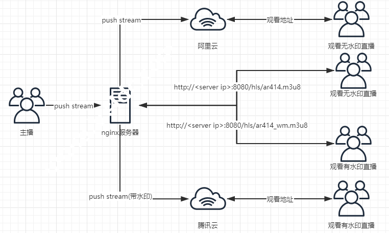 当前拓扑示意图(阿里云和腾讯云不方便放出推流和拉流地址,有兴趣的同学可以去申请玩一下)