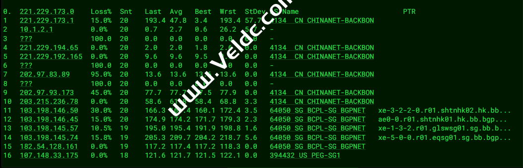 ---------------------------------------------------------------------- 广州电信 traceroute to 14.215.116.1 (14.215.116.1), 30 hops max, 32 byte packets 1 10.0.122.1 0.15 ms * 局域网 2 107.148.32.30 1.75 ms AS394432 新加坡, petaexpress.com 3 182.54.128.160 0.98 ms AS64050 新加坡, bgp.net 4 103.198.145.77 2.85 ms AS64050 新加坡, bgp.net 5 xe-2-2-2.r01.glswsg01.sg.bb.bgp.net (103.198.145.73) 1.77 ms AS64050 新加坡, bgp.net 6 * 7 121.59.124.49 2.90 ms AS23764 新加坡, chinatelecom.com.cn, 电信 8 * 9 CN.HKG.CTGNet (69.194.166.101) 39.51 ms AS23764 中国, 香港, chinatelecom.com.cn, 电信 10 203.22.178.94 44.00 ms * 中国, 香港, chinatelecom.com.cn, 电信 11 * 12 59.43.130.105 47.85 ms * 中国, 广东, 广州, chinatelecom.com.cn, 电信 13 * 14 * 15 * 16 * 17 202.97.90.165 183.37 ms AS4134 中国, 广东, 广州, chinatelecom.com.cn, 电信 18 * 19 121.14.50.210 189.80 ms AS4134 中国, 广东, 广州, chinatelecom.com.cn, 电信 20 183.56.129.10 184.50 ms AS4134 中国, 广东, 广州, chinatelecom.com.cn, 电信 21 * 22 14.215.116.1 194.12 ms AS4134 中国, 广东, 广州, chinatelecom.com.cn, 电信 ---------------------------------------------------------------------- 上海电信 traceroute to 202.96.209.133 (202.96.209.133), 30 hops max, 32 byte packets 1 10.0.122.1 0.29 ms * 局域网 2 107.148.32.30 0.57 ms AS394432 新加坡, petaexpress.com 3 182.54.128.160 1.02 ms AS64050 新加坡, bgp.net 4 103.198.145.77 1.67 ms AS64050 新加坡, bgp.net 5 xe-2-2-2.r01.glswsg01.sg.bb.bgp.net (103.198.145.73) 1.77 ms AS64050 新加坡, bgp.net 6 * 7 121.59.124.49 3.15 ms AS23764 新加坡, chinatelecom.com.cn, 电信 8 * 9 69.194.186.21 56.03 ms AS32505 美国, 路易斯安那州, conterra.com 10 203.22.178.86 64.22 ms * 中国, 香港, chinatelecom.com.cn, 电信 11 59.43.38.185 63.91 ms * 中国, 上海, chinatelecom.com.cn, 电信 12 * 13 101.95.88.22 91.01 ms AS4812 中国, 上海, chinatelecom.com.cn, 电信 14 124.74.229.238 85.40 ms AS4812 中国, 上海, chinatelecom.com.cn, 电信 15 101.95.88.101 143.97 ms AS4812 中国, 上海, chinatelecom.com.cn, 电信 16 180.169.255.118 141.73 ms AS4812 中国, 上海, chinatelecom.com.cn, 电信 17 * 18 * 19 * 20 * 21 * 22 * 23 * 24 * 25 * 26 * 27 * 28 * 29 * 30 * ---------------------------------------------------------------------- 厦门电信 traceroute to 117.28.254.129 (117.28.254.129), 30 hops max, 32 byte packets 1 10.0.122.1 0.22 ms * 局域网 2 107.148.32.30 0.46 ms AS394432 新加坡, petaexpress.com 3 182.54.128.160 1.04 ms AS64050 新加坡, bgp.net 4 103.198.145.81 1.28 ms AS64050 新加坡, bgp.net 5 xe-2-2-2.r01.glswsg01.sg.bb.bgp.net (103.198.145.73) 1.88 ms AS64050 新加坡, bgp.net 6 * 7 121.59.124.49 2.96 ms AS23764 新加坡, chinatelecom.com.cn, 电信 8 69.194.166.29 1.59 ms AS23764 新加坡, chinatelecom.com.cn, 电信 9 CN.HKG.CTGNet (69.194.165.37) 83.94 ms AS23764 中国, 香港, chinatelecom.com.cn, 电信 10 203.22.178.58 36.99 ms * 中国, 香港, chinatelecom.com.cn, 电信 11 59.43.188.121 42.33 ms * 中国, 广东, 广州, chinatelecom.com.cn, 电信 12 * 13 59.43.130.101 46.83 ms * 中国, 广东, 广州, chinatelecom.com.cn, 电信 14 59.43.46.214 61.14 ms * 中国, 福建, 福州, chinatelecom.com.cn, 电信 15 * 16 * 17 * 18 * 19 117.28.254.129 66.97 ms AS4809 中国, 福建, 厦门, chinatelecom.com.cn, 电信 ---------------------------------------------------------------------- 重庆联通 traceroute to 113.207.25.138 (113.207.25.138), 30 hops max, 32 byte packets 1 10.0.122.1 0.26 ms * 局域网 2 107.148.32.30 0.59 ms AS394432 新加坡, petaexpress.com 3 182.54.128.160 36.24 ms AS64050 新加坡, bgp.net 4 103.198.145.77 1.37 ms AS64050 新加坡, bgp.net 5 xe-2-2-2.r01.glswsg01.sg.bb.bgp.net (103.198.145.73) 1.87 ms AS64050 新加坡, bgp.net 6 * 7 121.59.124.49 3.06 ms AS23764 新加坡, chinatelecom.com.cn, 电信 8 * 9 69.194.166.121 38.53 ms AS23764 中国, 香港, chinatelecom.com.cn, 电信 10 203.22.178.94 43.99 ms * 中国, 香港, chinatelecom.com.cn, 电信 11 * 12 59.43.16.165 50.08 ms * 中国, 广东, 广州, chinatelecom.com.cn, 电信 13 219.158.38.245 98.22 ms AS4837 中国, 广东, 广州, chinaunicom.com, 联通 14 59.43.140.77 82.09 ms * 中国, 北京, chinatelecom.com.cn, 电信 15 * 16 * 17 * 18 * 19 * 20 * 21 * 22 * 23 * 24 * 25 * 26 * 27 * 28 * 29 * 30 * ---------------------------------------------------------------------- 成都联通 traceroute to 119.6.6.6 (119.6.6.6), 30 hops max, 32 byte packets 1 10.0.122.1 0.24 ms * 局域网 2 107.148.32.30 0.51 ms AS394432 新加坡, petaexpress.com 3 182.54.128.160 1.02 ms AS64050 新加坡, bgp.net 4 103.198.145.81 1.49 ms AS64050 新加坡, bgp.net 5 xe-2-2-2.r01.glswsg01.sg.bb.bgp.net (103.198.145.73) 1.92 ms AS64050 新加坡, bgp.net 6 * 7 121.59.124.49 2.91 ms AS23764 新加坡, chinatelecom.com.cn, 电信 8 * 9 69.194.186.13 37.98 ms AS32505 美国, 路易斯安那州, conterra.com 10 * 11 * 12 59.43.130.153 45.76 ms * 中国, 广东, 广州, chinatelecom.com.cn, 电信 13 219.158.38.245 98.54 ms AS4837 中国, 广东, 广州, chinaunicom.com, 联通 14 * 15 * 16 119.6.197.194 207.01 ms AS4837 中国, 四川, 成都, chinaunicom.com, 联通 17 119.6.195.38 199.63 ms AS4837 中国, 四川, 成都, chinaunicom.com, 联通 18 * 19 * 20 * 21 * 22 * 23 * 24 * 25 * 26 * 27 * 28 * 29 * 30 * ---------------------------------------------------------------------- 上海移动 traceroute to 120.204.197.126 (120.204.197.126), 30 hops max, 32 byte packets 1 10.0.122.1 0.31 ms * 局域网 2 107.148.32.30 0.57 ms AS394432 新加坡, petaexpress.com 3 223.119.19.133 1.52 ms AS58453 中国, 香港, chinamobile.com, 移动 4 * 5 221.183.89.174 64.72 ms AS9808 中国, 上海, chinamobile.com, 移动 6 * 7 221.183.89.10 66.79 ms AS9808 中国, 上海, chinamobile.com, 移动 8 * 9 120.204.194.14 76.50 ms AS9808 中国, 上海, chinamobile.com, 移动 10 120.204.194.14 76.34 ms AS9808 中国, 上海, chinamobile.co