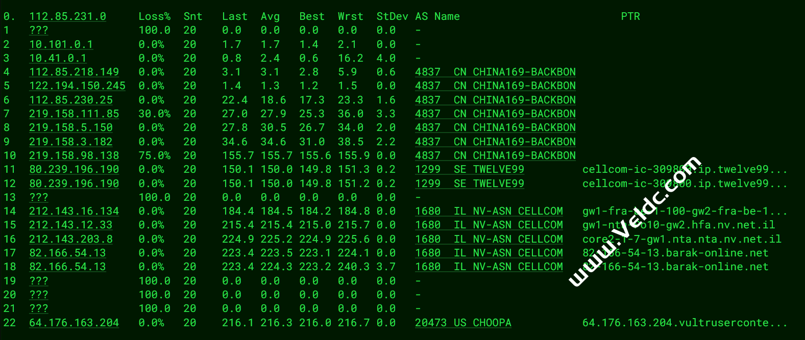 ---------------------------------------------------------------------------------- Traceroute to China, Guangzhou CT (TCP Mode, Max 30 Hop) ============================================================ traceroute to 113.108.209.1 (113.108.209.1), 30 hops max, 32 byte packets 1 * 2 100.100.200.1 0.33 ms * Shared Address 3 10.93.0.89 0.37 ms * LAN Address 4 10.93.0.5 0.55 ms * LAN Address 5 10.93.0.1 0.57 ms * LAN Address 6 10.250.3.5 50.80 ms * LAN Address 7 10.250.31.9 52.48 ms * LAN Address 8 10.250.31.11 55.21 ms * LAN Address 9 81.173.20.9 53.47 ms AS4134 Germany, Hesse, Frankfurt, cteurope.net 10 202.97.13.29 261.62 ms AS4134 China, Guangdong, Guangzhou, ChinaTelecom 11 * 12 * 13 202.97.66.153 267.60 ms AS4134 China, Guangdong, Guangzhou, ChinaTelecom 14 113.108.209.1 257.23 ms AS4134 China, Guangdong, Guangzhou, ChinaTelecom Traceroute to China, Shanghai CT (TCP Mode, Max 30 Hop) ============================================================ traceroute to 180.153.28.5 (180.153.28.5), 30 hops max, 32 byte packets 1 * 2 100.100.100.1 0.29 ms * Shared Address 3 10.93.0.77 0.88 ms * LAN Address 4 10.93.0.9 0.28 ms * LAN Address 5 10.93.0.1 0.54 ms * LAN Address 6 84.110.175.13 0.32 ms AS8551 Israel, bezeqint.net 7 212.179.124.82 0.84 ms AS8551 Israel, bezeqint.net 8 * 9 10.250.31.11 89.69 ms * LAN Address 10 * 11 81.173.20.9 53.26 ms AS4134 Germany, Hesse, Frankfurt, cteurope.net 12 * 13 * 14 101.95.88.77 237.73 ms AS4812 China, Shanghai, ChinaTelecom 15 124.74.232.66 238.12 ms AS4812 China, Shanghai, ChinaTelecom 16 124.74.232.62 224.81 ms AS4812 China, Shanghai, ChinaTelecom 17 101.227.255.46 222.90 ms AS4812 China, Shanghai, ChinaTelecom 18 101.227.255.46 218.75 ms AS4812 China, Shanghai, ChinaTelecom 19 * 20 * 21 * 22 * 23 * 24 * 25 * 26 * 27 * 28 * 29 * 30 * Traceroute to China, Beijing CT (TCP Mode, Max 30 Hop) ============================================================ traceroute to 180.149.128.9 (180.149.128.9), 30 hops max, 32 byte packets 1 * 2 100.100.100.1 1.91 ms * Shared Address 3 10.93.0.77 7.94 ms * LAN Address 4 10.93.0.13 0.30 ms * LAN Address 5 82.166.54.14 1.89 ms AS1680 Israel, cellcom.co.il 6 212.143.25.192 1.41 ms AS1680 Israel, cellcom.co.il 7 212.143.203.24 1.82 ms AS1680 Israel, cellcom.co.il 8 212.143.12.21 80.85 ms AS1680 Israel, cellcom.co.il 9 10.10.10.1 74.18 ms * LAN Address 10 80.249.212.76 80.68 ms * Netherlands, North Holland, Amsterdam, ams-ix.net 11 * 12 * 13 * 14 * 15 * 16 * 17 * 18 * 19 * 20 * 21 * 22 * 23 * 24 * 25 * 26 * 27 * 28 * 29 * 30 * Traceroute to China, Guangzhou CU (TCP Mode, Max 30 Hop) ============================================================ traceroute to 210.21.4.130 (210.21.4.130), 30 hops max, 32 byte packets 1 * 2 100.100.200.1 0.26 ms * Shared Address 3 10.93.0.85 1.06 ms * LAN Address 4 10.93.0.5 3.23 ms * LAN Address 5 10.93.0.2 0.29 ms * LAN Address 6 82.166.54.14 3.27 ms AS1680 Israel, cellcom.co.il 7 212.143.25.194 1.39 ms AS1680 Israel, cellcom.co.il 8 212.143.203.24 1.93 ms AS1680 Israel, cellcom.co.il 9 212.143.12.34 52.37 ms AS1680 Israel, cellcom.co.il 10 10.10.50.1 53.65 ms * LAN Address 11 * 12 4.69.153.125 195.44 ms AS3356 United States, California, Los Angeles, level3.com 13 4.26.1.158 316.31 ms AS3356 United States, California, Los Angeles, level3.com 14 219.158.96.29 285.88 ms AS4837 China, Guangdong, Guangzhou, ChinaUnicom 15 219.158.20.221 309.80 ms AS4837 China, Guangdong, Guangzhou, ChinaUnicom 16 219.158.8.113 273.59 ms AS4837 China, Guangdong, Guangzhou, ChinaUnicom 17 112.96.0.2 295.55 ms AS17816 China, Guangdong, Guangzhou, ChinaUnicom 18 120.80.169.118 292.20 ms AS17622 China, Guangdong, Guangzhou, ChinaUnicom 19 * 20 * 21 * 22 * 23 * 24 * 25 * 26 * 27 * 28 * 29 * 30 * Traceroute to China, Shanghai CU (TCP Mode, Max 30 Hop) ============================================================ traceroute to 58.247.8.158 (58.247.8.158), 30 hops max, 32 byte packets 1 * 2 100.100.100.1 0.31 ms * Shared Address 3 10.93.0.81 0.67 ms * LAN Address 4 10.93.0.9 3.61 ms * LAN Address 5 82.166.54.14 2.02 ms AS1680 Israel, cellcom.co.il 6 212.143.25.192 1.59 ms AS1680 Israel, cellcom.co.il 7 212.143.25.192 2.56 ms AS1680 Israel, cellcom.co.il 8 212.143.203.9 1.84 ms AS1680 Israel, cellcom.co.il 9 10.10.50.1 53.72 ms * LAN Address 10 10.10.50.1 54.00 ms * LAN Address 11 4.69.209.165 199.75 ms AS3356 United States, California, San Jose, level3.com 12 4.53.209.22 278.45 ms AS3356 United States, California, San Jose, level3.com 13 4.53.208.118 278.21 ms AS3356 United States, California, San Jose, level3.com 14 219.158.113.134 264.76 ms AS4837 China, Shanghai, ChinaUnicom 15 * 16 * 17 * 18 139.226.204.154 281.10 ms AS17621 China, Shanghai, ChinaUnicom 19 139.226.225.22 264.61 ms AS17621 China, Shanghai, ChinaUnicom 20 * 21 * 22 * 23 * 24 * 25 * 26 * 27 * 28 * 29 * 30 * Traceroute to China, Beijing CU (TCP Mode, Max 30 Hop) ============================================================ traceroute to 123.125.99.1 (123.125.99.1), 30 hops max, 32 byte packets 1 * 2 100.100.200.1 0.29 ms * Shared Address 3 10.93.0.89 0.55 ms * LAN Address 4 10.93.0.13 0.46 ms * LAN Address 5 82.166.54.14 2.14 ms AS1680 Israel, cellcom.co.il 6 212.143.25.194 1.47 ms AS1680 Israel, cellcom.co.il 7 212.143.203.9 2.17 ms AS1680 Israel, cellcom.co.il 8 212.143.12.34 52.66 ms AS1680 Israel, cellcom.co.il 9 10.10.50.1 53.62 ms * LAN Address 10 * 11 * 12 4.26.2.162 271.61 ms AS3356 United States, California, Los Angeles, level3.com 13 219.158.16.93 268.83 ms AS4837 China, Beijing, ChinaUnicom 14 219.158.16.69 264.84 ms AS4837 China, Beijing, ChinaUnicom 15 * 16 125.33.186.46 275.60 ms AS4808 China, Beijing, ChinaUnicom 17 219.232.11.202 268.69 ms AS4808 China, Beijing, ChinaUnicom 18 61.135.113.154 268.41 ms AS4808 China, Beijing, ChinaUnicom 19 * 20 * 21 * 22 * 23 * 24 * 25 * 26 * 27 * 28 * 29 * 30 * Traceroute to China, Guangzhou CM (TCP Mode, Max 30 Hop) ============================================================ traceroute to 120.196.212.25 (120.196.212.2