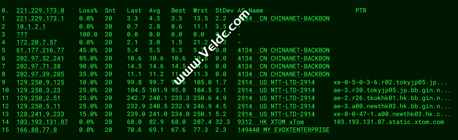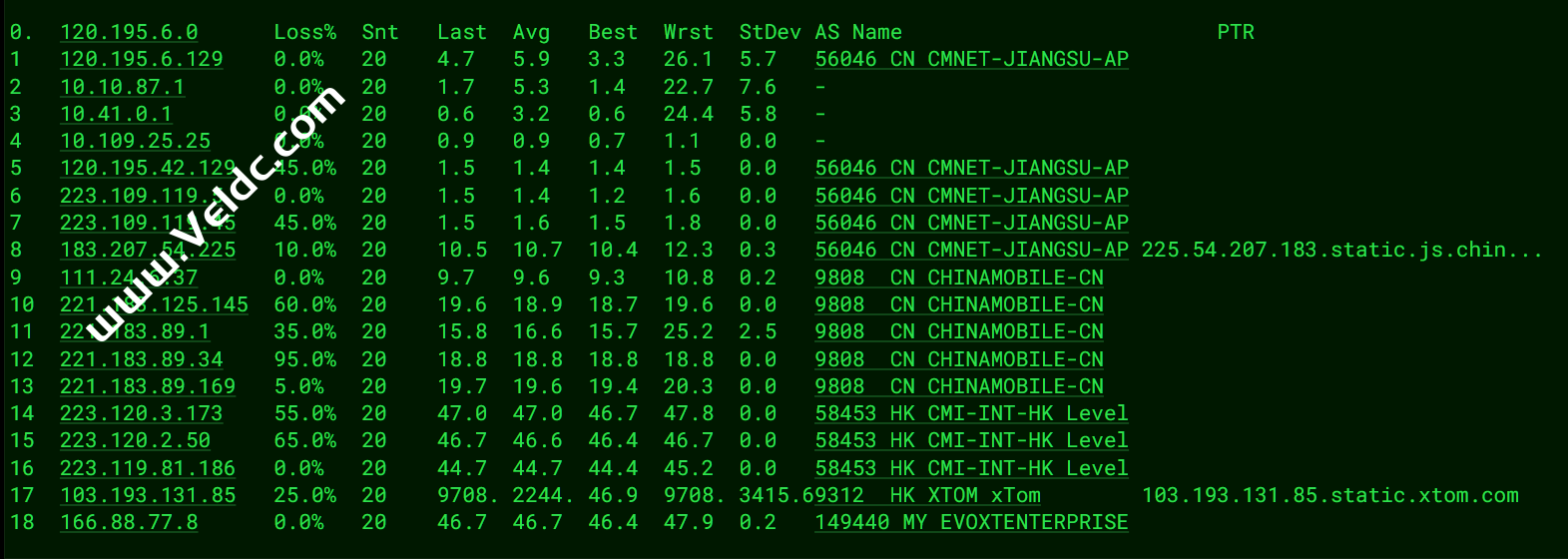 ---------------------------------------------------------------------------------- Traceroute to China, Guangzhou CT (TCP Mode, Max 30 Hop) ============================================================ traceroute to 113.108.209.1 (113.108.209.1), 30 hops max, 32 byte packets 1 103.125.233.81 1.99 ms AS9312 China, Hong Kong, xtom.com 2 103.193.131.92 6.63 ms AS9312 China, Hong Kong, xtom.com 3 103.193.131.89 10.06 ms AS9312 China, Hong Kong, xtom.com 4 103.193.131.87 6.47 ms AS9312 China, Hong Kong, xtom.com 5 223.119.81.186 0.76 ms AS58453 China, Hong Kong, ChinaMobile 6 223.119.81.185 0.63 ms AS58453 China, Hong Kong, ChinaMobile 7 * 8 223.120.3.182 28.11 ms AS58453 China, Shanghai, ChinaMobile 9 221.183.89.170 29.21 ms AS9808 China, Shanghai, ChinaMobile 10 * 11 * 12 * 13 * 14 * 15 * 16 113.108.209.1 86.34 ms AS4134 China, Guangdong, Guangzhou, ChinaTelecom Traceroute to China, Shanghai CT (TCP Mode, Max 30 Hop) ============================================================ traceroute to 180.153.28.5 (180.153.28.5), 30 hops max, 32 byte packets 1 103.125.233.81 7.81 ms AS9312 China, Hong Kong, xtom.com 2 * 3 103.193.131.89 0.93 ms AS9312 China, Hong Kong, xtom.com 4 103.193.131.87 8.37 ms AS9312 China, Hong Kong, xtom.com 5 223.119.81.186 0.84 ms AS58453 China, Hong Kong, ChinaMobile 6 223.119.81.185 0.82 ms AS58453 China, Hong Kong, ChinaMobile 7 223.120.2.49 2.34 ms AS58453 China, Hong Kong, ChinaMobile 8 * 9 * 10 * 11 221.183.89.50 31.03 ms AS9808 China, Shanghai, ChinaMobile 12 * 13 * 14 * 15 101.95.120.157 67.22 ms AS4812 China, Shanghai, ChinaTelecom 16 * 17 124.74.232.54 57.65 ms AS4812 China, Shanghai, ChinaTelecom 18 101.227.255.34 60.97 ms AS4812 China, Shanghai, ChinaTelecom 19 * 20 * 21 * 22 * 23 * 24 * 25 * 26 * 27 * 28 * 29 * 30 * Traceroute to China, Beijing CT (TCP Mode, Max 30 Hop) ============================================================ traceroute to 180.149.128.9 (180.149.128.9), 30 hops max, 32 byte packets 1 103.125.233.81 4.39 ms AS9312 China, Hong Kong, xtom.com 2 103.193.131.92 6.70 ms AS9312 China, Hong Kong, xtom.com 3 103.193.131.89 0.68 ms AS9312 China, Hong Kong, xtom.com 4 103.193.131.87 11.95 ms AS9312 China, Hong Kong, xtom.com 5 223.119.81.186 4.73 ms AS58453 China, Hong Kong, ChinaMobile 6 223.119.81.185 0.67 ms AS58453 China, Hong Kong, ChinaMobile 7 223.120.2.49 2.57 ms AS58453 China, Hong Kong, ChinaMobile 8 223.120.3.186 28.03 ms AS58453 China, Shanghai, ChinaMobile 9 221.183.89.174 29.80 ms AS9808 China, Shanghai, ChinaMobile 10 221.183.89.69 29.85 ms AS9808 China, Shanghai, ChinaMobile 11 * 12 * 13 * 14 * 15 * 16 36.110.248.122 85.17 ms AS23724 China, Beijing, ChinaTelecom 17 * 18 * 19 * 20 * 21 * 22 * 23 * 24 * 25 * 26 * 27 * 28 * 29 * 30 * Traceroute to China, Guangzhou CU (TCP Mode, Max 30 Hop) ============================================================ traceroute to 210.21.4.130 (210.21.4.130), 30 hops max, 32 byte packets 1 103.125.233.81 5.93 ms AS9312 China, Hong Kong, xtom.com 2 * 3 103.193.131.89 0.87 ms AS9312 China, Hong Kong, xtom.com 4 103.193.131.87 0.95 ms AS9312 China, Hong Kong, xtom.com 5 223.119.81.186 0.70 ms AS58453 China, Hong Kong, ChinaMobile 6 223.119.81.185 0.70 ms AS58453 China, Hong Kong, ChinaMobile 7 223.120.2.49 2.36 ms AS58453 China, Hong Kong, ChinaMobile 8 223.120.3.182 27.89 ms AS58453 China, Shanghai, ChinaMobile 9 221.183.89.174 29.79 ms AS9808 China, Shanghai, ChinaMobile 10 * 11 221.183.89.10 29.50 ms AS9808 China, Shanghai, ChinaMobile 12 * 13 * 14 219.158.46.149 93.01 ms AS4837 China, Guangdong, Guangzhou, ChinaUnicom 15 219.158.10.249 85.32 ms AS4837 China, Guangdong, Guangzhou, ChinaUnicom 16 157.18.0.26 89.44 ms AS17816 China, Guangdong, Guangzhou, ChinaUnicom 17 120.80.91.66 89.73 ms AS17816 China, Guangdong, Guangzhou, ChinaUnicom 18 * 19 * 20 * 21 * 22 * 23 * 24 * 25 * 26 * 27 * 28 * 29 * 30 * Traceroute to China, Shanghai CU (TCP Mode, Max 30 Hop) ============================================================ traceroute to 58.247.8.158 (58.247.8.158), 30 hops max, 32 byte packets 1 103.125.233.81 7.43 ms AS9312 China, Hong Kong, xtom.com 2 * 3 103.193.131.89 0.59 ms AS9312 China, Hong Kong, xtom.com 4 * 5 223.119.81.186 0.65 ms AS58453 China, Hong Kong, ChinaMobile 6 223.119.81.185 0.86 ms AS58453 China, Hong Kong, ChinaMobile 7 * 8 * 9 221.183.89.174 29.85 ms AS9808 China, Shanghai, ChinaMobile 10 221.183.89.33 29.29 ms AS9808 China, Shanghai, ChinaMobile 11 * 12 221.183.94.2 30.00 ms AS9808 China, Shanghai, ChinaMobile 13 221.183.123.106 65.15 ms AS9808 China, Shanghai, ChinaMobile 14 * 15 * 16 139.226.204.154 55.92 ms AS17621 China, Shanghai, ChinaUnicom 17 139.226.225.22 64.84 ms AS17621 China, Shanghai, ChinaUnicom 18 58.247.8.153 72.99 ms AS17621 China, Shanghai, ChinaUnicom 19 * 20 * 21 * 22 * 23 * 24 * 25 * 26 * 27 * 28 * 29 * 30 * Traceroute to China, Beijing CU (TCP Mode, Max 30 Hop) ============================================================ traceroute to 123.125.99.1 (123.125.99.1), 30 hops max, 32 byte packets 1 103.125.233.81 9.39 ms AS9312 China, Hong Kong, xtom.com 2 * 3 103.193.131.89 0.98 ms AS9312 China, Hong Kong, xtom.com 4 103.193.131.87 7.82 ms AS9312 China, Hong Kong, xtom.com 5 223.119.81.186 0.59 ms AS58453 China, Hong Kong, ChinaMobile 6 223.119.81.185 11.98 ms AS58453 China, Hong Kong, ChinaMobile 7 223.120.2.49 4.01 ms AS58453 China, Hong Kong, ChinaMobile 8 223.120.3.178 28.20 ms AS58453 China, Shanghai, ChinaMobile 9 221.183.89.170 29.43 ms AS9808 China, Shanghai, ChinaMobile 10 * 11 221.183.89.14 30.10 ms AS9808 China, Shanghai, ChinaMobile 12 * 13 * 14 221.183.123.10 78.59 ms AS9808 China, Beijing, ChinaMobile 15 * 16 * 17 61.51.169.178 83.29 ms AS4808 China, Beijing, ChinaUnicom 18 * 19 * 20 * 21 * 22 * 23 * 24 * 25 * 26 * 27 * 28 * 29 * 30 * Traceroute to China, Guangzhou CM (TCP Mode, Max 30 Hop) ============================================================ traceroute to 120.196.212.25 (120.196.212.25), 30 hops max, 32 byte packets 1 103.125.233.81 4.10 ms AS9312 