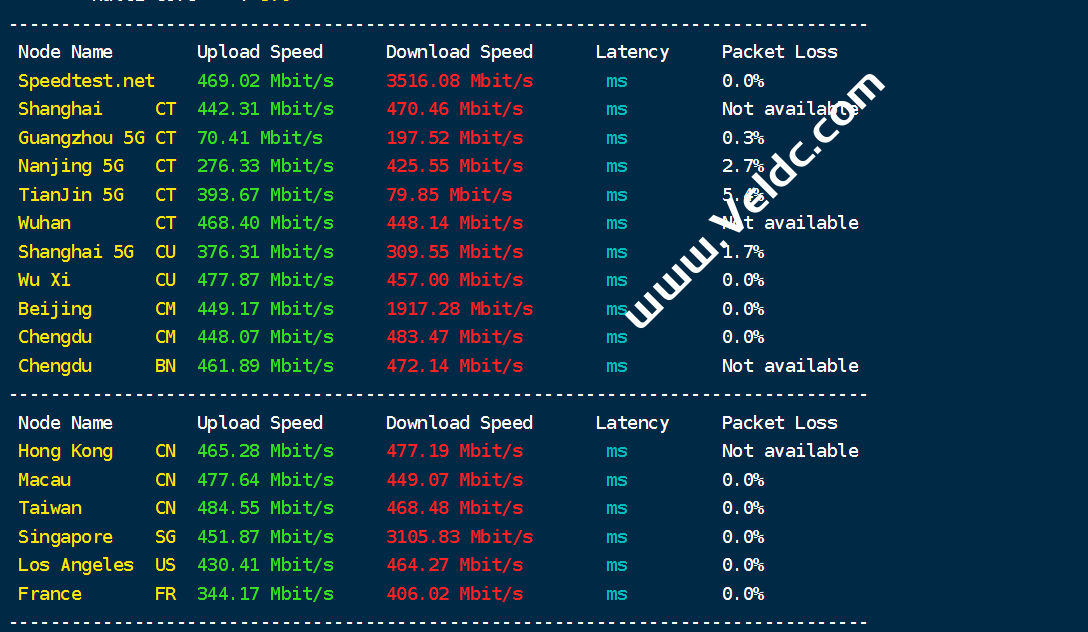 Traceroute to China, Guangzhou CT (TCP Mode, Max 30 Hop) ============================================================ traceroute to 113.108.209.1 (113.108.209.1), 30 hops max, 32 byte packets 1 * 2 209.146.123.192 0.94 ms AS51847 Japan, Tokyo, cogentco.com 3 * 4 * 5 * 6 58.138.98.69 3.18 ms AS2497 Japan, Tokyo, iij.ad.jp 7 58.138.100.62 15.90 ms AS2497 Japan, Tokyo, iij.ad.jp 8 203.215.237.9 74.25 ms * Japan, Tokyo, ChinaTelecom 9 * 10 * 11 * 12 113.108.209.1 53.50 ms AS4134 China, Guangdong, Guangzhou, ChinaTelecom Traceroute to China, Shanghai CT (TCP Mode, Max 30 Hop) ============================================================ traceroute to 180.153.28.5 (180.153.28.5), 30 hops max, 32 byte packets 1 * 2 209.146.123.192 0.99 ms AS51847 Japan, Tokyo, cogentco.com 3 * 4 * 5 * 6 58.138.98.69 3.94 ms AS2497 Japan, Tokyo, iij.ad.jp 7 58.138.100.62 2.52 ms AS2497 Japan, Tokyo, iij.ad.jp 8 203.215.237.9 56.81 ms * Japan, Tokyo, ChinaTelecom 9 202.97.43.133 52.37 ms AS4134 China, Shanghai, ChinaTelecom 10 * 11 * 12 61.152.24.57 68.43 ms AS4812 China, Shanghai, ChinaTelecom 13 124.74.166.218 62.87 ms AS4812 China, Shanghai, ChinaTelecom 14 124.74.232.58 59.64 ms AS4812 China, Shanghai, ChinaTelecom 15 101.227.255.34 52.34 ms AS4812 China, Shanghai, ChinaTelecom 16 * 17 * 18 * 19 * 20 * 21 * 22 * 23 * 24 * 25 * 26 * 27 * 28 * 29 * 30 * Traceroute to China, Beijing CT (TCP Mode, Max 30 Hop) ============================================================ traceroute to 180.149.128.9 (180.149.128.9), 30 hops max, 32 byte packets 1 * 2 209.146.123.192 1.02 ms AS51847 Japan, Tokyo, cogentco.com 3 * 4 * 5 * 6 58.138.98.69 19.58 ms AS2497 Japan, Tokyo, iij.ad.jp 7 58.138.100.66 5.51 ms AS2497 Japan, Tokyo, iij.ad.jp 8 203.215.237.9 56.79 ms * Japan, Tokyo, ChinaTelecom 9 * 10 202.97.37.89 69.94 ms AS4134 China, Beijing, ChinaTelecom 11 * 12 * 13 * 14 36.110.248.250 72.72 ms AS23724 China, Beijing, ChinaTelecom 15 * 16 * 17 * 18 * 19 * 20 * 21 * 22 * 23 * 24 * 25 * 26 * 27 * 28 * 29 * 30 * Traceroute to China, Guangzhou CU (TCP Mode, Max 30 Hop) ============================================================ traceroute to 210.21.4.130 (210.21.4.130), 30 hops max, 32 byte packets 1 * 2 209.146.123.192 0.98 ms AS51847 Japan, Tokyo, cogentco.com 3 * 4 * 5 * 6 129.250.3.33 1.81 ms AS2914 Japan, Tokyo, ntt.com 7 219.158.42.5 60.69 ms AS4837 China, Guangdong, Guangzhou, ChinaUnicom 8 219.158.4.125 58.89 ms AS4837 China, Guangdong, Guangzhou, ChinaUnicom 9 219.158.3.17 61.06 ms AS4837 China, Guangdong, Guangzhou, ChinaUnicom 10 120.83.0.230 64.17 ms AS17816 China, Guangdong, Guangzhou, ChinaUnicom 11 120.80.175.70 62.93 ms AS17622 China, Guangdong, Guangzhou, ChinaUnicom 12 * 13 * 14 * 15 * 16 * 17 * 18 * 19 * 20 * 21 * 22 * 23 * 24 * 25 * 26 * 27 * 28 * 29 * 30 * Traceroute to China, Shanghai CU (TCP Mode, Max 30 Hop) ============================================================ traceroute to 58.247.8.158 (58.247.8.158), 30 hops max, 32 byte packets 1 * 2 209.146.123.192 1.48 ms AS51847 Japan, Tokyo, cogentco.com 3 * 4 * 5 * 6 58.138.98.73 2.18 ms AS2497 Japan, Tokyo, iij.ad.jp 7 58.138.112.50 5.73 ms AS2497 Japan, Tokyo, iij.ad.jp 8 202.232.1.158 83.76 ms AS2497 Japan, Tokyo, iij.ad.jp 9 219.158.112.245 99.88 ms AS4837 China, Shanghai, ChinaUnicom 10 219.158.113.118 97.58 ms AS4837 China, Shanghai, ChinaUnicom 11 * 12 * 13 112.64.250.202 111.04 ms AS17621 China, Shanghai, ChinaUnicom 14 58.247.8.153 112.02 ms AS17621 China, Shanghai, ChinaUnicom 15 * 16 * 17 * 18 * 19 * 20 * 21 * 22 * 23 * 24 * 25 * 26 * 27 * 28 * 29 * 30 * Traceroute to China, Beijing CU (TCP Mode, Max 30 Hop) ============================================================ traceroute to 123.125.99.1 (123.125.99.1), 30 hops max, 32 byte packets 1 * 2 209.146.123.192 0.76 ms AS51847 Japan, Tokyo, cogentco.com 3 * 4 * 5 * 6 * 7 * 8 221.111.202.70 61.71 ms AS17676 China, Beijing, bbtec.net 9 219.158.3.29 58.07 ms AS4837 China, Beijing, ChinaUnicom 10 * 11 124.65.194.6 51.38 ms AS4808 China, Beijing, ChinaUnicom 12 219.232.11.130 55.06 ms AS4808 China, Beijing, ChinaUnicom 13 * 14 * 15 * 16 * 17 * 18 * 19 * 20 * 21 * 22 * 23 * 24 * 25 * 26 * 27 * 28 * 29 * 30 * Traceroute to China, Guangzhou CM (TCP Mode, Max 30 Hop) ============================================================ traceroute to 120.196.212.25 (120.196.212.25), 30 hops max, 32 byte packets 1 * 2 209.146.123.192 1.01 ms AS51847 Japan, Tokyo, cogentco.com 3 * 4 * 5 * 6 221.183.89.174 59.00 ms AS9808 China, Shanghai, ChinaMobile 7 * 8 * 9 * 10 * 11 183.235.226.121 116.79 ms AS56040 China, Guangdong, Shenzhen, ChinaMobile 12 211.136.196.238 109.39 ms AS56040 China, Guangdong, Guangzhou, ChinaMobile 13 211.139.180.106 89.10 ms AS56040 China, Guangdong, Guangzhou, ChinaMobile 14 120.196.212.25 103.27 ms AS56040 China, Guangdong, Guangzhou, ChinaMobile Traceroute to China, Shanghai CM (TCP Mode, Max 30 Hop) ============================================================ traceroute to 221.183.55.22 (221.183.55.22), 30 hops max, 32 byte packets 1 * 2 209.146.123.192 1.06 ms AS51847 Japan, Tokyo, cogentco.com 3 * 4 * 5 * 6 221.183.55.114 84.59 ms AS9808 China, Beijing, ChinaMobile 7 * 8 * 9 * 10 * 11 * 12 * 13 * 14 * 15 * 16 * 17 * 18 * 19 * 20 * 21 * 22 * 23 * 24 * 25 * 26 * 27 * 28 * 29 * 30 * Traceroute to China, Beijing CM (TCP Mode, Max 30 Hop) ============================================================ traceroute to 211.136.25.153 (211.136.25.153), 30 hops max, 32 byte packets 1 * 2 209.146.123.192 1.04 ms AS51847 Japan, Tokyo, cogentco.com 3 * 4 * 5 * 6 221.183.55.106 85.65 ms AS9808 China, Beijing, ChinaMobile 7 221.183.25.201 87.07 ms AS9808 China, Beijing, ChinaMobile 8 221.183.89.98 91.74 ms AS9808 China, Beijing, ChinaMobile 9 * 10 211.136.67.106 85.55 ms AS56048 China, Beijing, ChinaMobile 11 211.136.63.66 95.11 ms AS56048 China, Beijing, ChinaMobile 12 211.136.63.66 93.82 ms AS56048 China, Beijing, ChinaMobile 13 211.136.95.226 99.62 ms AS56048 China, Beijing, ChinaMobile 14 * 15 * 16 211.13