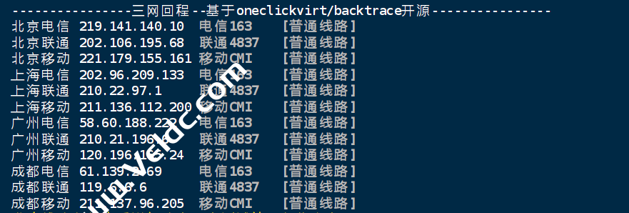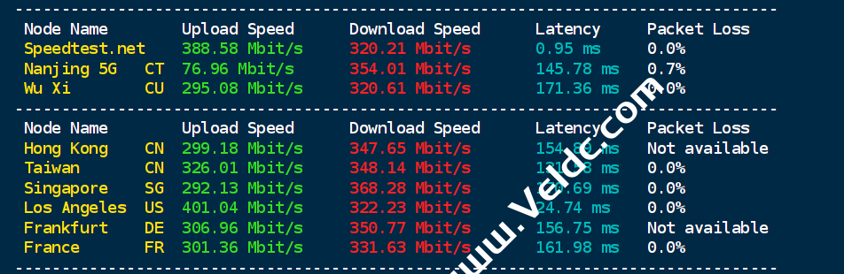 Traceroute to China, Guangzhou CT (TCP Mode, Max 30 Hop) ============================================================ traceroute to 113.108.209.1 (113.108.209.1), 30 hops max, 32 byte packets 1 95.174.71.217 0.45 ms AS8849,AS56630 United States, California, Los Angeles, edis.at 2 207.45.216.18 1.04 ms AS6453 United States, California, Los Angeles, tatacommunications.com 3 64.86.252.242 0.45 ms AS6453 United States, California, Los Angeles, tatacommunications.com 4 207.45.219.135 2.86 ms AS6453 United States, California, Los Angeles, tatacommunications.com 5 * 6 * 7 202.97.72.1 196.37 ms AS4134 China, Guangdong, Guangzhou, ChinaTelecom 8 * 9 * 10 * 11 * 12 * 13 * 14 * 15 * 16 * 17 * 18 * 19 * 20 * 21 * 22 * 23 * 24 * 25 * 26 * 27 * 28 * 29 * 30 * Traceroute to China, Shanghai CT (TCP Mode, Max 30 Hop) ============================================================ traceroute to 180.153.28.5 (180.153.28.5), 30 hops max, 32 byte packets 1 95.174.71.217 0.43 ms AS8849,AS56630 United States, California, Los Angeles, edis.at 2 207.45.216.18 0.72 ms AS6453 United States, California, Los Angeles, tatacommunications.com 3 64.86.252.242 1.53 ms AS6453 United States, California, Los Angeles, tatacommunications.com 4 207.45.219.135 9.82 ms AS6453 United States, California, Los Angeles, tatacommunications.com 5 * 6 202.97.74.2 163.42 ms AS4134 China, Shanghai, ChinaTelecom 7 * 8 61.152.24.85 175.36 ms AS4812 China, Shanghai, ChinaTelecom 9 * 10 101.95.225.218 173.87 ms AS4812 China, Shanghai, ChinaTelecom 11 101.227.255.46 162.44 ms AS4812 China, Shanghai, ChinaTelecom 12 * 13 * 14 * 15 * 16 * 17 * 18 * 19 * 20 * 21 * 22 * 23 * 24 * 25 * 26 * 27 * 28 * 29 * 30 * Traceroute to China, Beijing CT (TCP Mode, Max 30 Hop) ============================================================ traceroute to 180.149.128.9 (180.149.128.9), 30 hops max, 32 byte packets 1 95.174.71.217 7.08 ms AS8849,AS56630 United States, California, Los Angeles, edis.at 2 207.45.216.18 1.28 ms AS6453 United States, California, Los Angeles, tatacommunications.com 3 64.86.252.242 0.54 ms AS6453 United States, California, Los Angeles, tatacommunications.com 4 207.45.219.135 25.52 ms AS6453 United States, California, Los Angeles, tatacommunications.com 5 * 6 * 7 * 8 * 9 36.110.251.73 192.59 ms AS23724 China, Beijing, ChinaTelecom 10 * 11 * 12 * 13 * 14 * 15 * 16 * 17 * 18 * 19 * 20 * 21 * 22 * 23 * 24 * 25 * 26 * 27 * 28 * 29 * 30 * Traceroute to China, Guangzhou CU (TCP Mode, Max 30 Hop) ============================================================ traceroute to 210.21.4.130 (210.21.4.130), 30 hops max, 32 byte packets 1 95.174.71.217 0.76 ms AS8849,AS56630 United States, California, Los Angeles, edis.at 2 207.45.216.18 0.75 ms AS6453 United States, California, Los Angeles, tatacommunications.com 3 * 4 207.45.219.9 2.84 ms AS6453 United States, California, Los Angeles, tatacommunications.com 5 219.158.98.17 150.87 ms AS4837 China, Beijing, ChinaUnicom 6 219.158.10.25 148.36 ms AS4837 China, Beijing, ChinaUnicom 7 * 8 219.158.8.82 183.80 ms AS4837 China, Guangdong, Guangzhou, ChinaUnicom 9 112.96.0.146 188.37 ms AS17816 China, Guangdong, Guangzhou, ChinaUnicom 10 120.80.175.78 179.35 ms AS17622 China, Guangdong, Guangzhou, ChinaUnicom 11 * 12 * 13 * 14 * 15 * 16 * 17 * 18 * 19 * 20 * 21 * 22 * 23 * 24 * 25 * 26 * 27 * 28 * 29 * 30 * Traceroute to China, Shanghai CU (TCP Mode, Max 30 Hop) ============================================================ traceroute to 58.247.8.158 (58.247.8.158), 30 hops max, 32 byte packets 1 95.174.71.217 1.29 ms AS8849,AS56630 United States, California, Los Angeles, edis.at 2 207.45.216.18 0.92 ms AS6453 United States, California, Los Angeles, tatacommunications.com 3 * 4 207.45.219.9 2.40 ms AS6453 United States, California, Los Angeles, tatacommunications.com 5 219.158.4.9 149.99 ms AS4837 China, Beijing, ChinaUnicom 6 219.158.3.141 146.55 ms AS4837 China, Beijing, ChinaUnicom 7 * 8 * 9 * 10 * 11 58.247.8.153 170.11 ms AS17621 China, Shanghai, ChinaUnicom 12 * 13 * 14 * 15 * 16 * 17 * 18 * 19 * 20 * 21 * 22 * 23 * 24 * 25 * 26 * 27 * 28 * 29 * 30 * Traceroute to China, Beijing CU (TCP Mode, Max 30 Hop) ============================================================ traceroute to 123.125.99.1 (123.125.99.1), 30 hops max, 32 byte packets 1 95.174.71.217 0.94 ms AS8849,AS56630 United States, California, Los Angeles, edis.at 2 207.45.216.18 1.02 ms AS6453 United States, California, Los Angeles, tatacommunications.com 3 64.86.197.240 1.37 ms AS6453 United States, California, Los Angeles, tatacommunications.com 4 207.45.219.9 3.00 ms AS6453 United States, California, Los Angeles, tatacommunications.com 5 219.158.4.9 151.69 ms AS4837 China, Beijing, ChinaUnicom 6 219.158.9.89 151.81 ms AS4837 China, Beijing, ChinaUnicom 7 219.158.9.17 149.35 ms AS4837 China, Beijing, ChinaUnicom 8 * 9 61.51.169.142 147.71 ms AS4808 China, Beijing, ChinaUnicom 10 61.135.113.154 153.59 ms AS4808 China, Beijing, ChinaUnicom 11 * 12 123.125.99.1 154.87 ms AS4808 China, Beijing, ChinaUnicom Traceroute to China, Guangzhou CM (TCP Mode, Max 30 Hop) ============================================================ traceroute to 120.196.212.25 (120.196.212.25), 30 hops max, 32 byte packets 1 95.174.71.217 0.43 ms AS8849,AS56630 United States, California, Los Angeles, edis.at 2 207.45.216.18 0.74 ms AS6453 United States, California, Los Angeles, tatacommunications.com 3 * 4 207.45.219.131 0.93 ms AS6453 United States, California, Los Angeles, tatacommunications.com 5 223.120.6.17 1.05 ms AS58453 United States, California, Los Angeles, ChinaMobile 6 223.120.12.106 144.68 ms AS58453 China, Guangdong, Guangzhou, ChinaMobile 7 221.183.55.82 184.02 ms AS9808 China, Guangdong, Guangzhou, ChinaMobile 8 221.183.92.21 180.88 ms AS9808 China, Guangdong, Guangzhou, ChinaMobile 9 * 10 * 11 * 12 211.136.203.2 184.13 ms AS56040 China, Guangdong, Guangzhou, ChinaMobile 13 120.197.234.140 178.71 ms AS56040 China, Guangdong, Guangzhou, ChinaMobile 14 120.197.234.140 187.