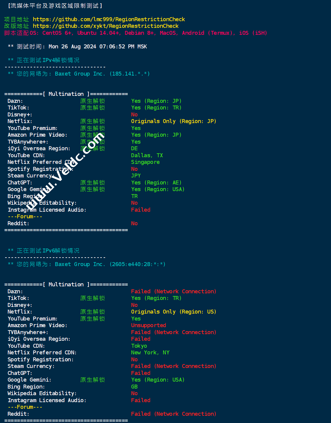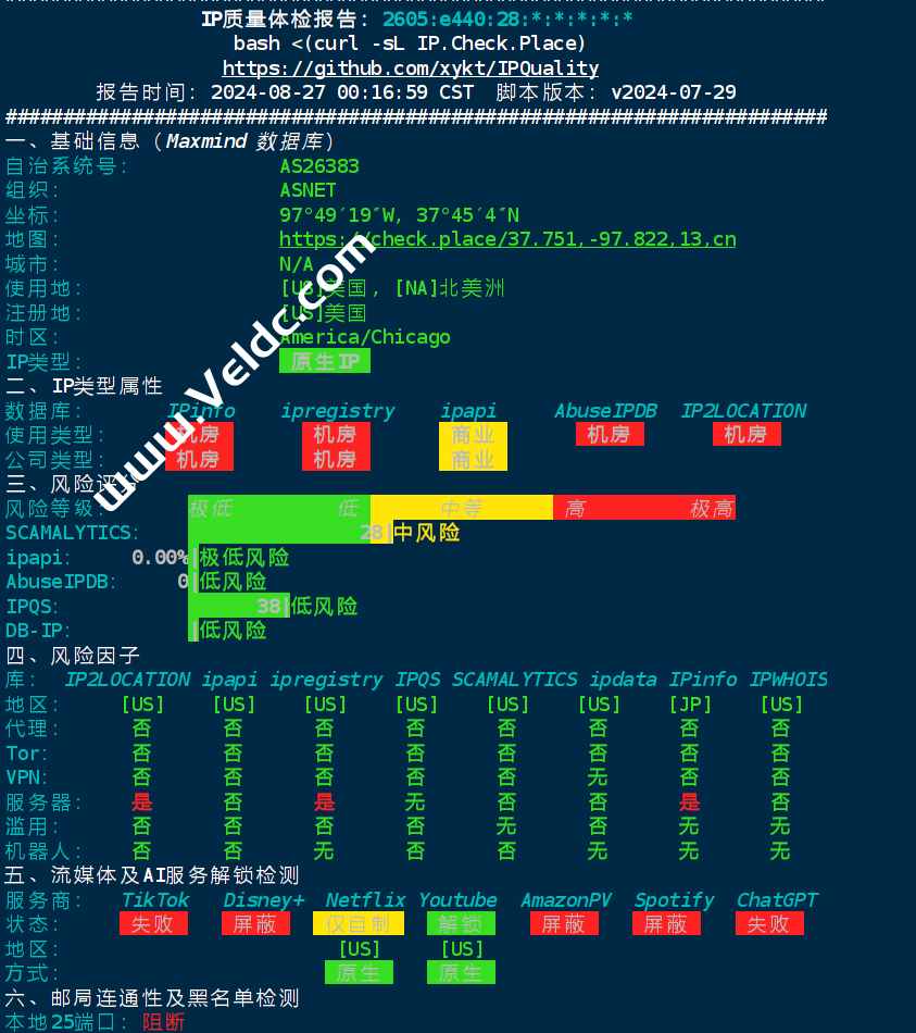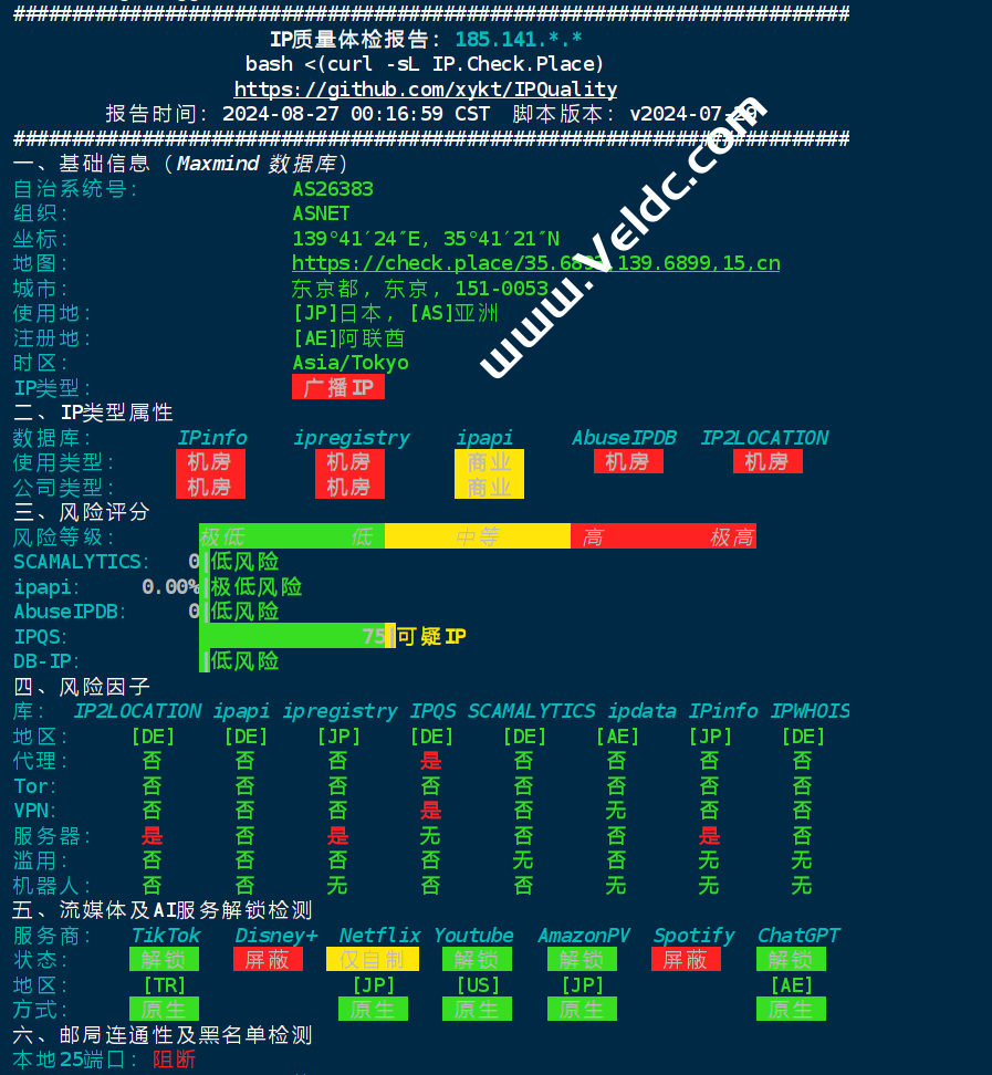 JustHost的日本VPS为三网HE线路,国内使用延迟比较高,广播IP,TikTok解锁土耳其,日本ChatGPT,机器采用Intel(R) Xeon(R) CPU E5-2697A v4 @ 2.60GHz,KVM虚拟,仍然是200Mbps-1Gbps不限流量,测试机为VPS Caph Special,2核2GB内存,400Mbps不限流量,折后月付30元起。下面我们来看看JustHost 日本机房的具体评测信息,包括性能、延迟测试、丢包测试、路由测试、IP质量检测等,是否解锁流媒体、TikTok、ChatGPT等热门应用。