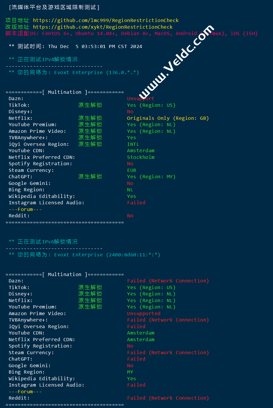 Evoxt前段时间上线了荷兰、加拿大和澳大利亚机房,仍然为KVM虚拟,支持解锁美国TikTok、ChatGPT、Google Gemini、Netflix、YouTube等流媒体和应用,1Gbps带宽也相当给力,油管看8K视频毫无压力。月付价格2.99美元起,性价比还不错,有需要的同学可以关注一下,下面是本次详细测评。