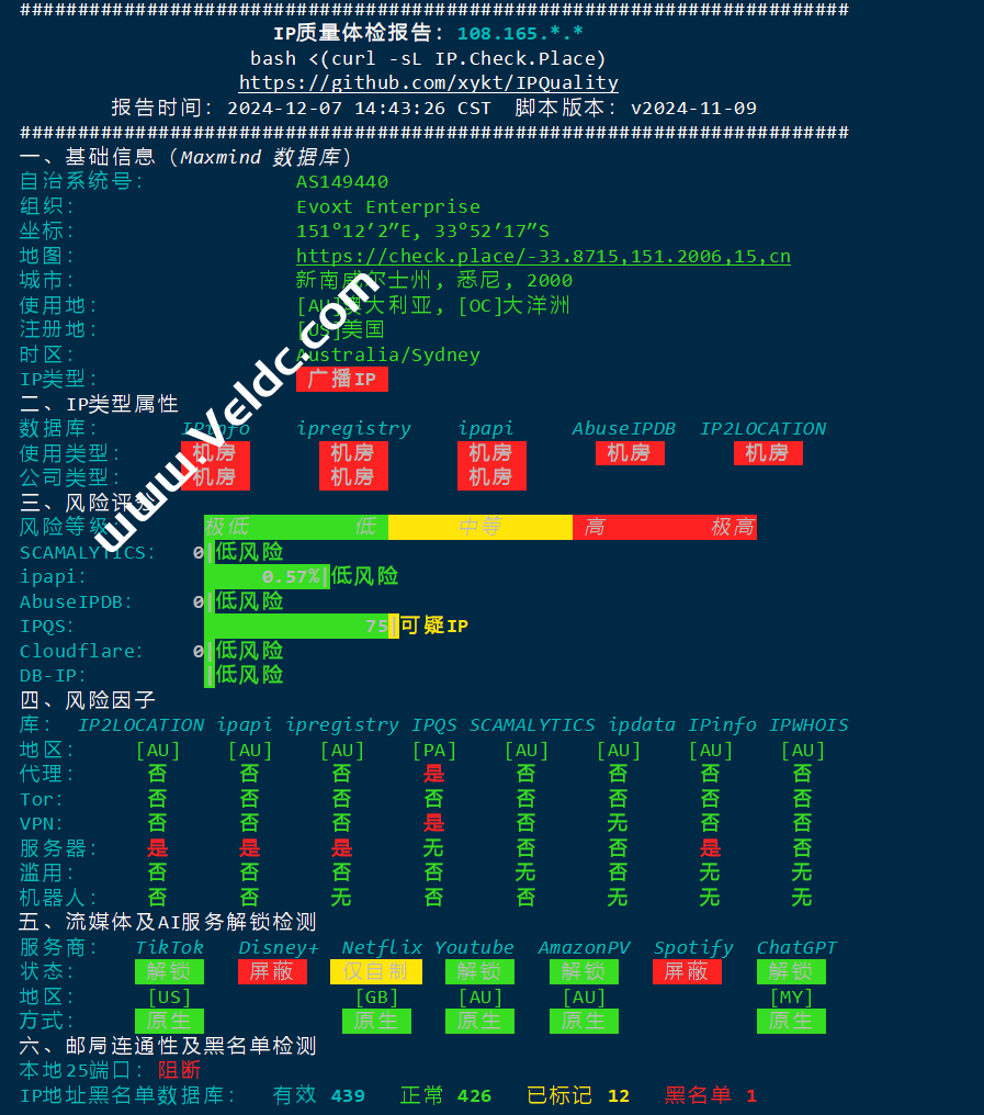 本次我们测评Evoxt新上线的澳大利亚机房,国内网络一般,国外还不错,仍为KVM虚拟,非原生IP,支持解锁TikTok、ChatGPT、Google Gemini、Netflix、YouTube等流媒体和应用,1Gbps带宽,月付2.99美元起,下面是本次详细测评。