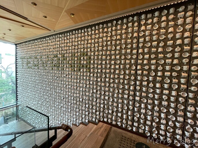 階段を上がるとティーカップが一面壁に埋め込まれています。